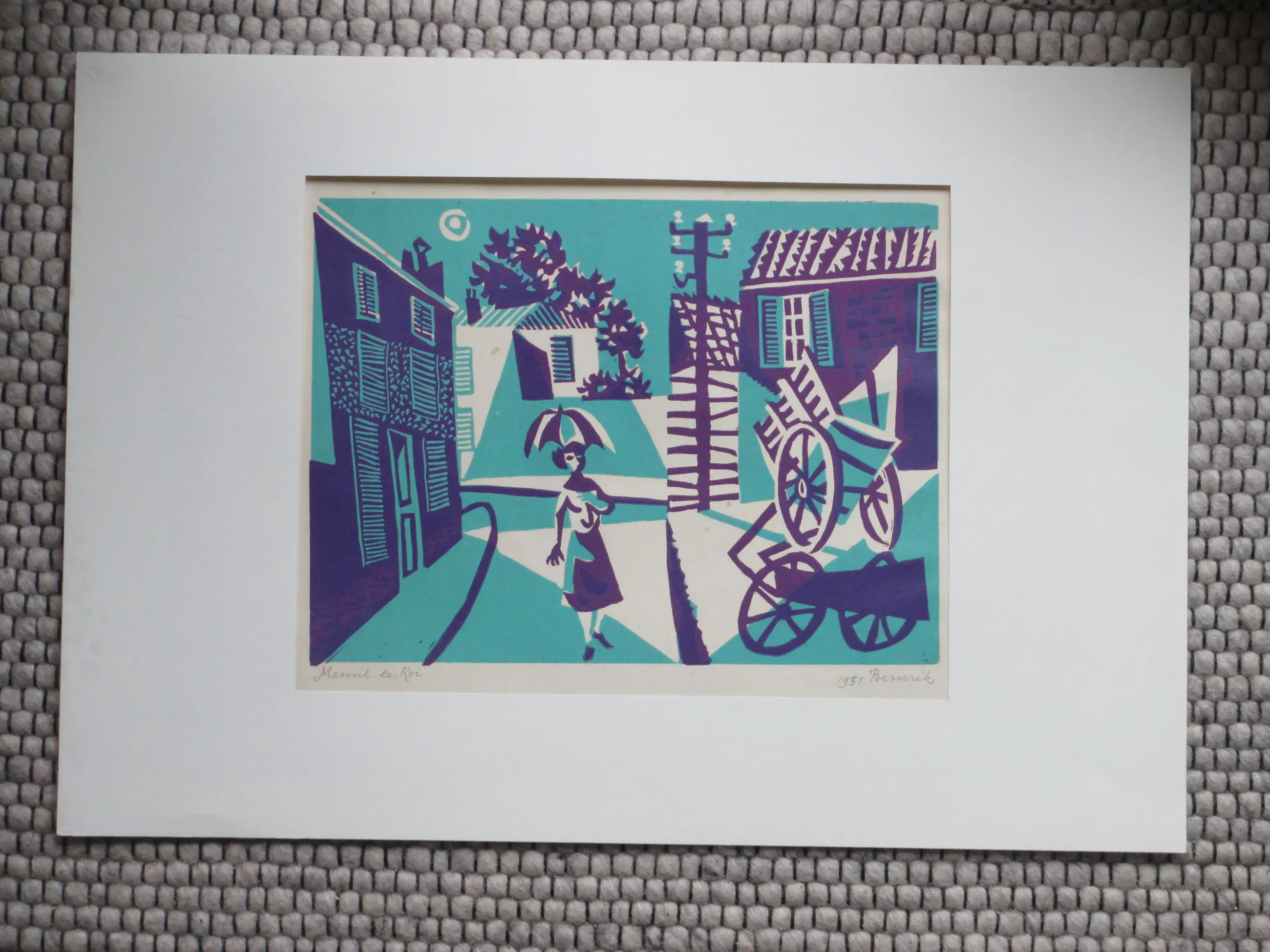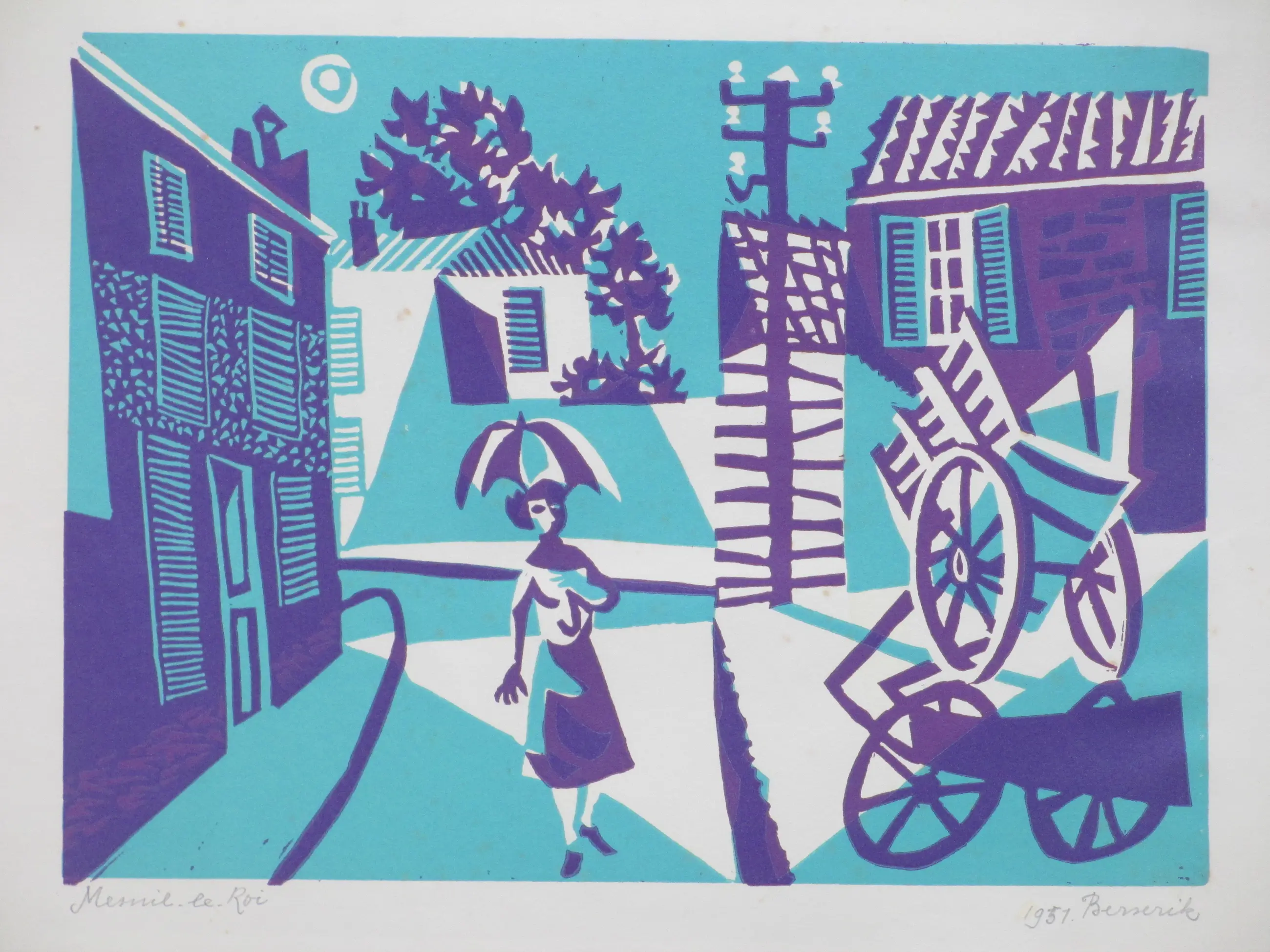 Kleurenlitho door Herman Berserik Voorstelling van een dorpsgezicht in Mesnil-le-Roi, een Franse gemeente in het departement Yvelines (Ile de France) Losbladig, beeldmaat 20.5x28, bladmaat 30x40 Gesigneerd en gedateerd in potlood r.o.: '1951 Berserik' Getiteld in potlood l.o.: 'Mesnil-le-Roi' Authenticiteit volledig gegarandeerd