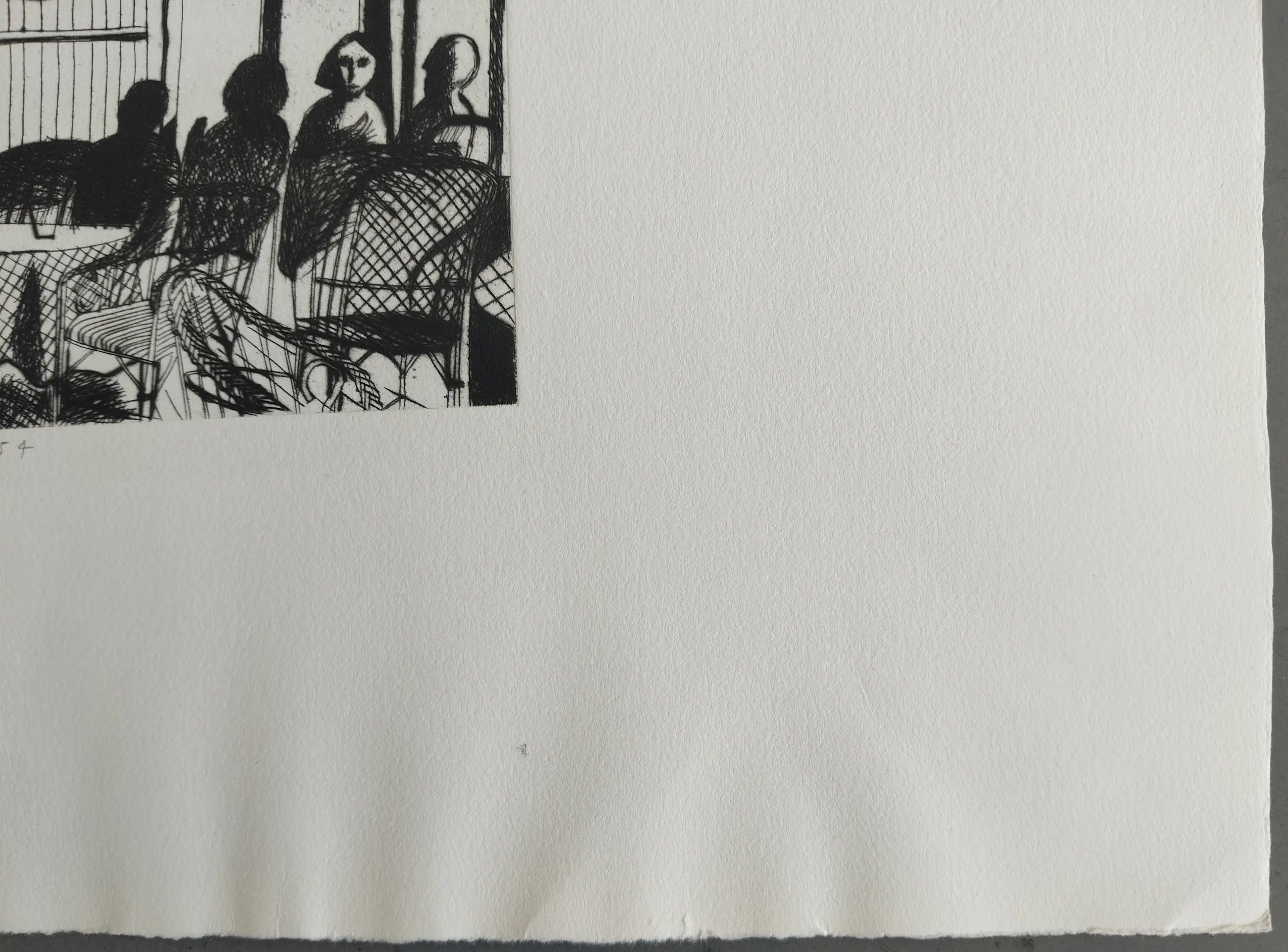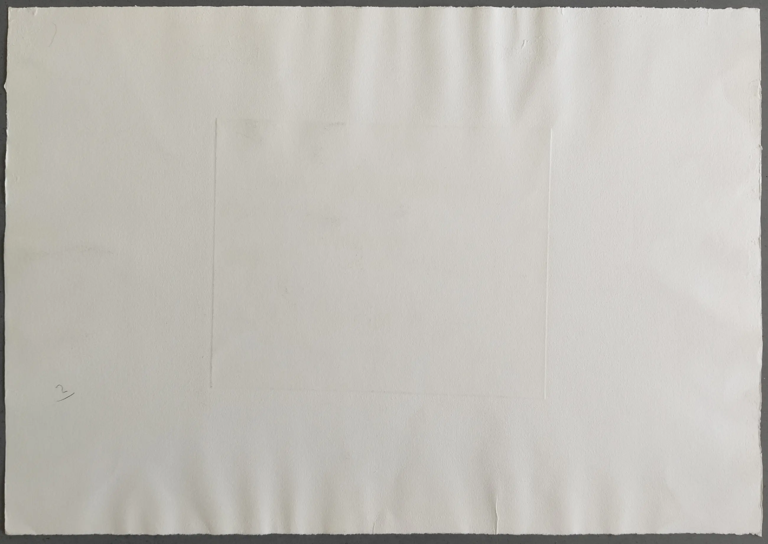 De ets is scheef op het papier gedrukt. Aan de onderzijde van de wit marge zit een plooitje en een klein vlekje. In de linker bovenhoek zit een klein (ca. 1 cm) scheutje in het papier. Aan de achterkant is papierverlies zichtbaar door het verwijderen van tape. Verder is de ets in prima staat