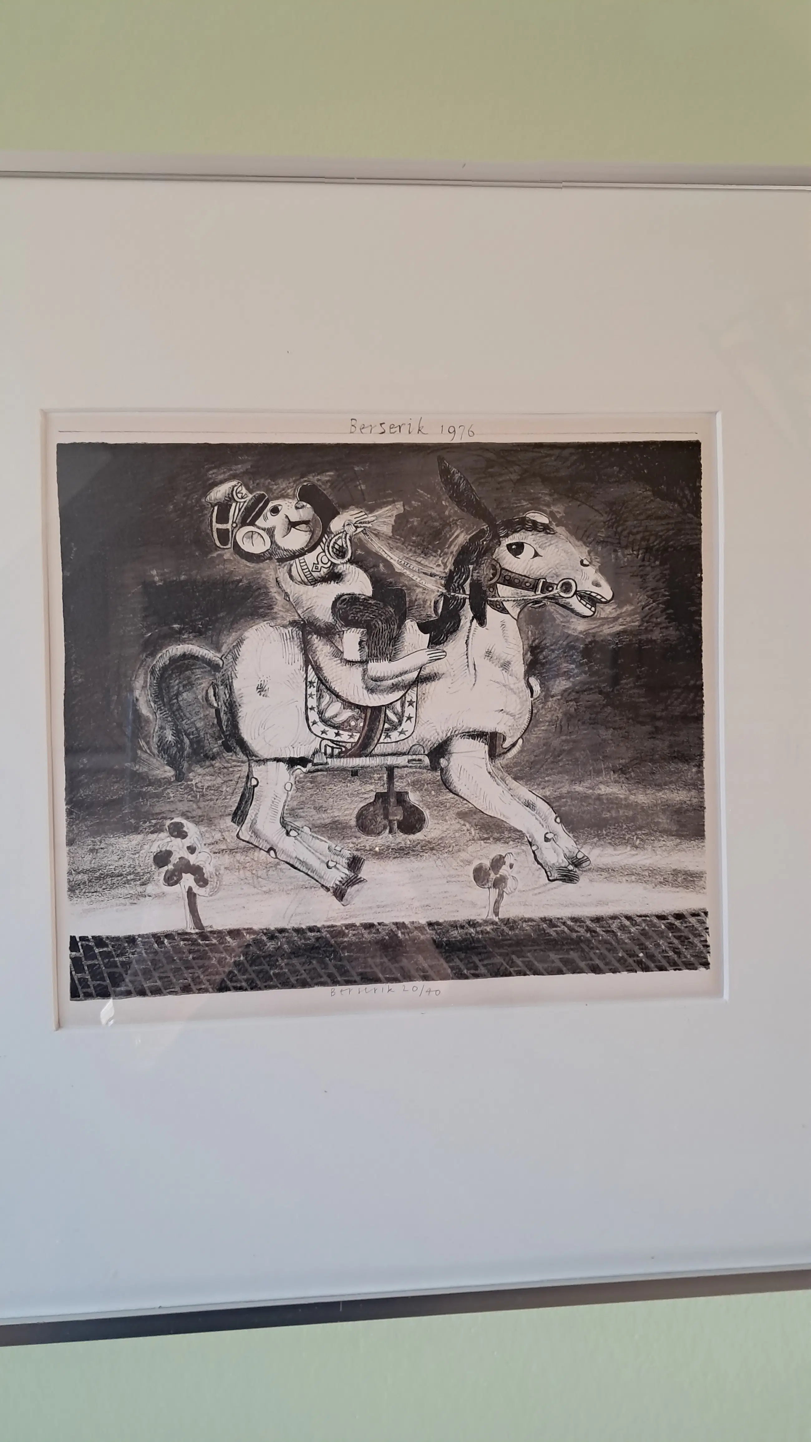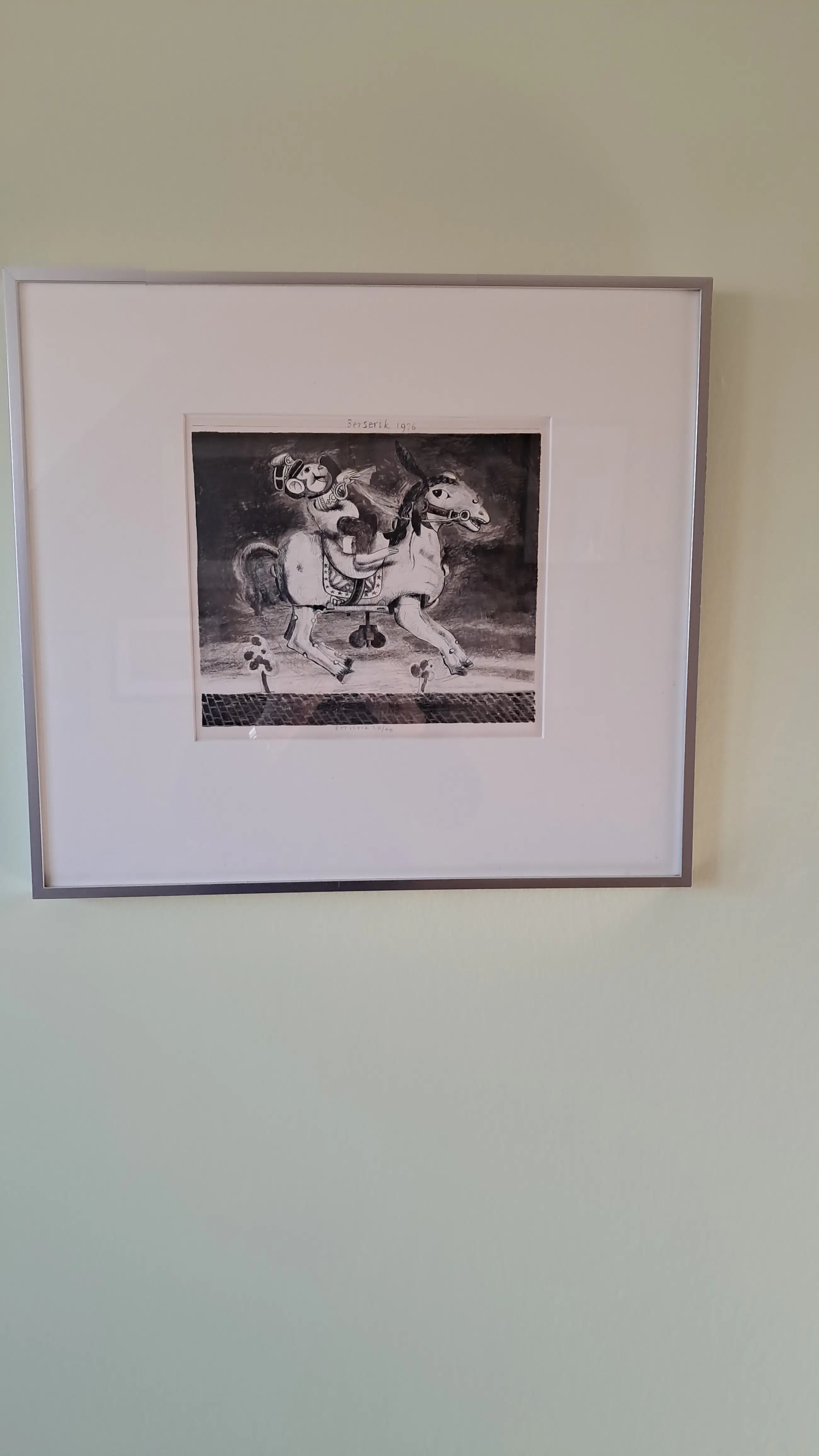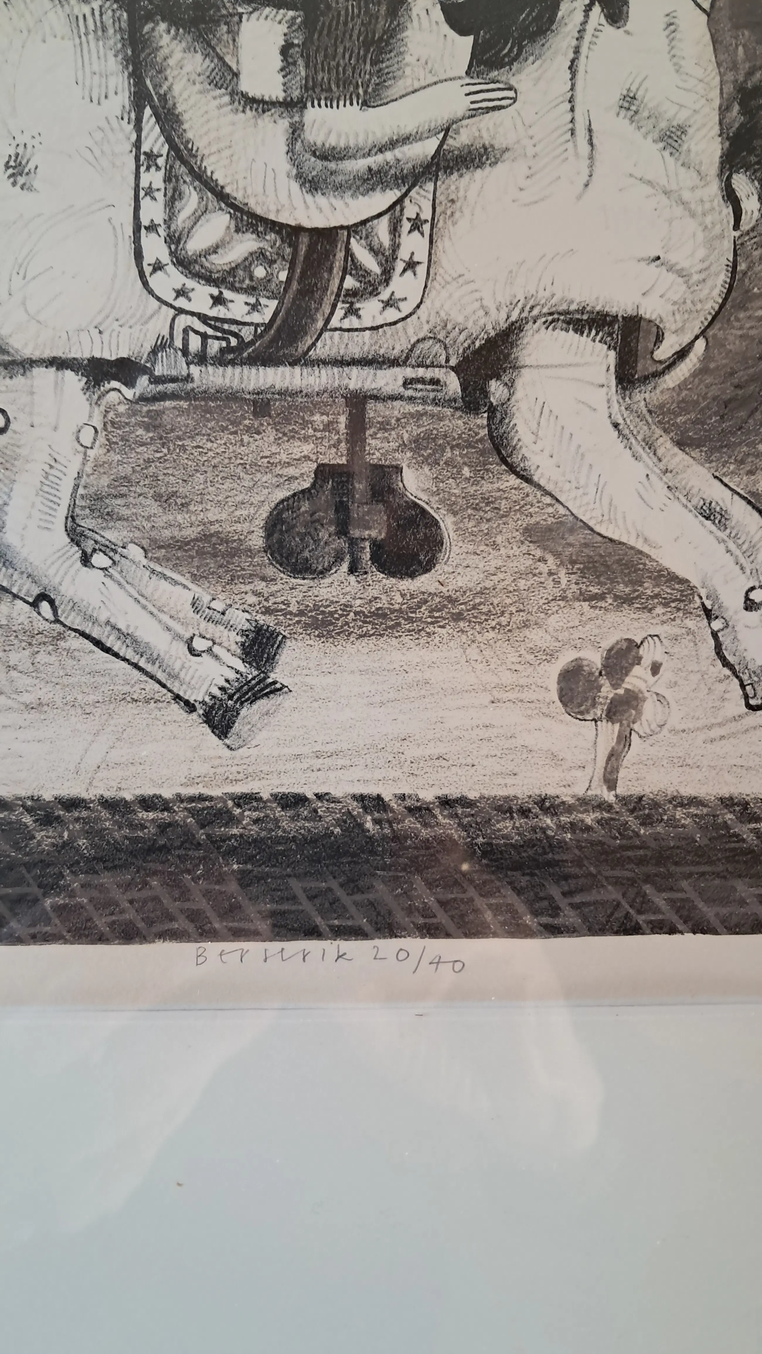 Zwevend opwindbaar speelgoedpaard met figuur tegen een donkere achtergrond , rijdend over een verbeelde straat met bomen. Het werk is ingelijst door Heijdenrijk Jr. B.V in Den Haag. Het werk is in goede conditie zonder verkleuring van passe partout en kan zo een mooie plek aan de muur krijgen.