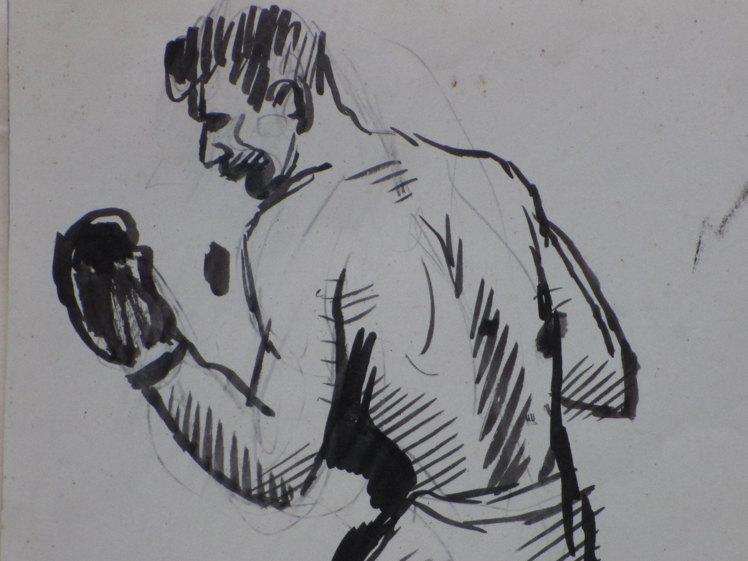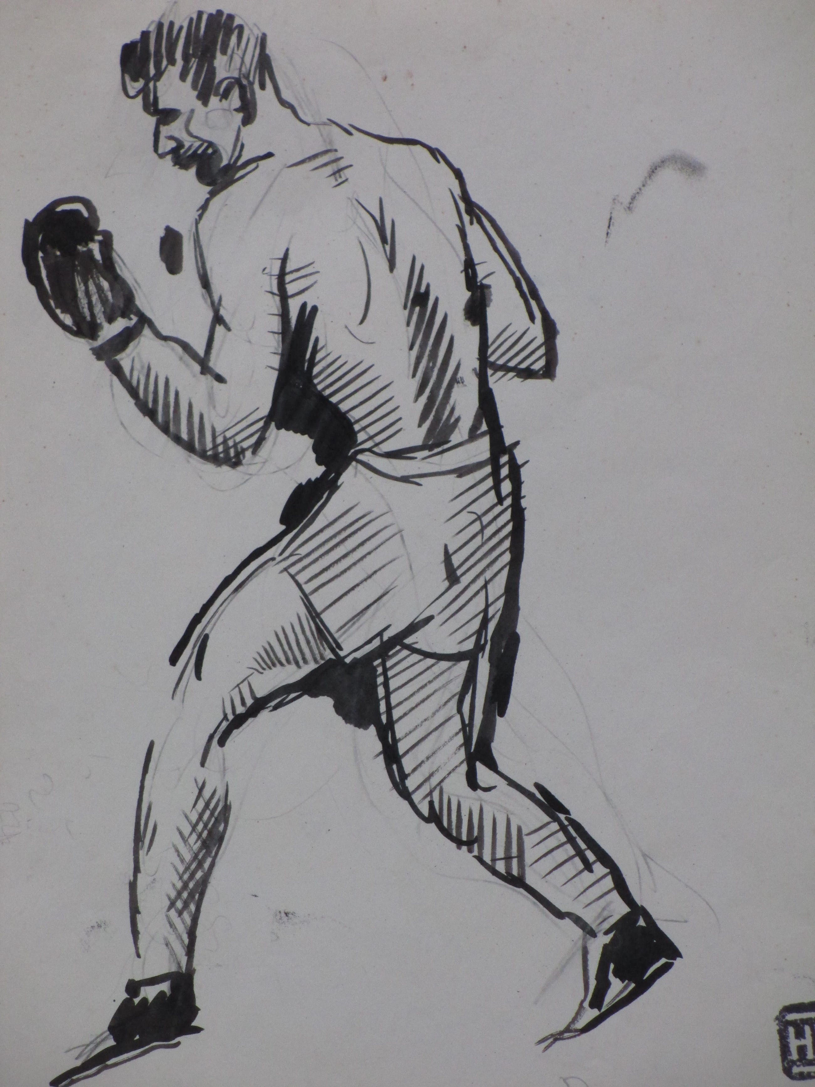 Tekening door Herman BielingVoorstelling van een bokser in een karakteristieke poseLosbladig, beeldmaat 24x15, bladmaat 26x19,5Niet gesigneerd, atelierstempel met monogram r.o. ' H.B.' Authenticiteit volledig gegarandeerd