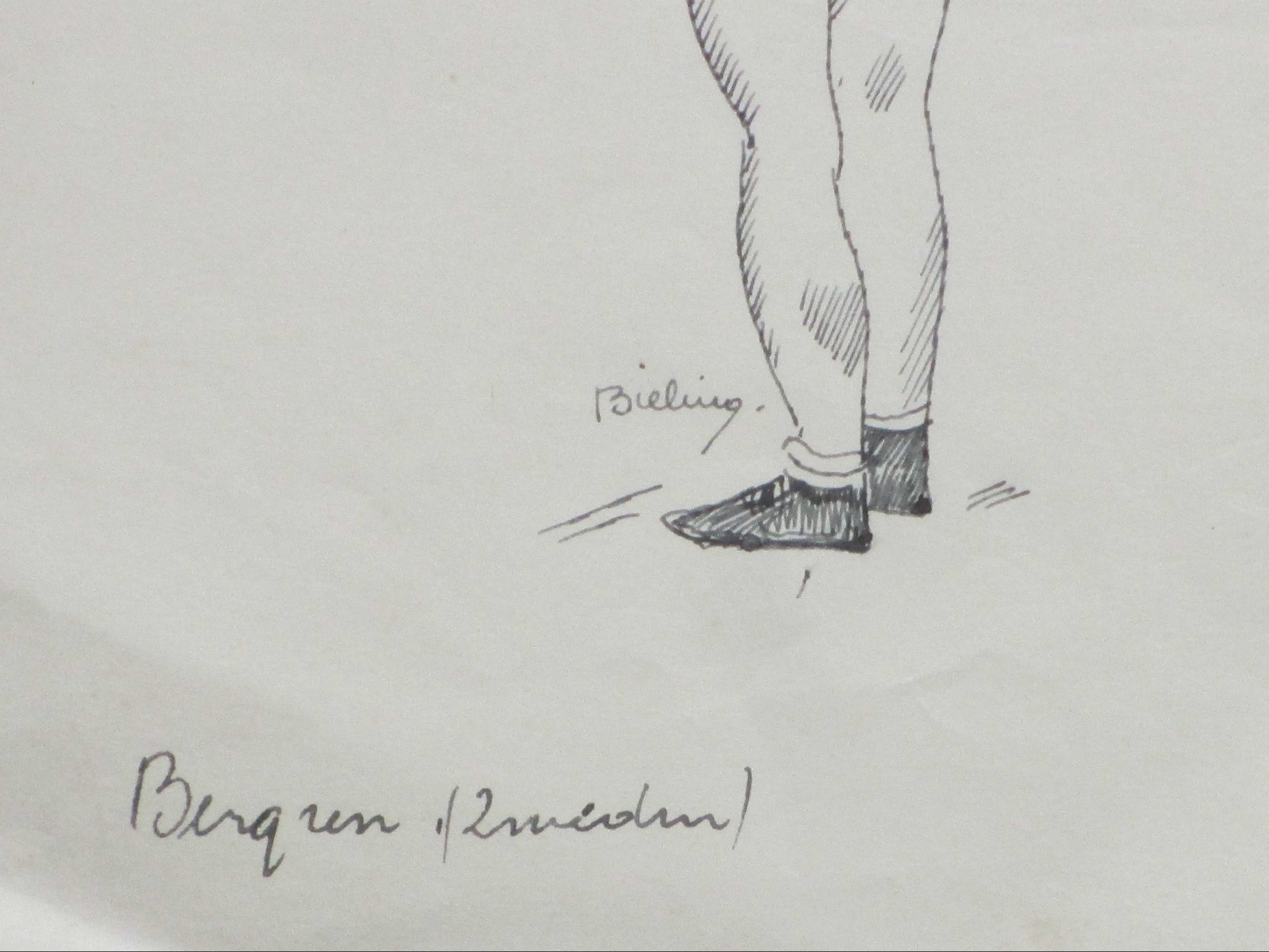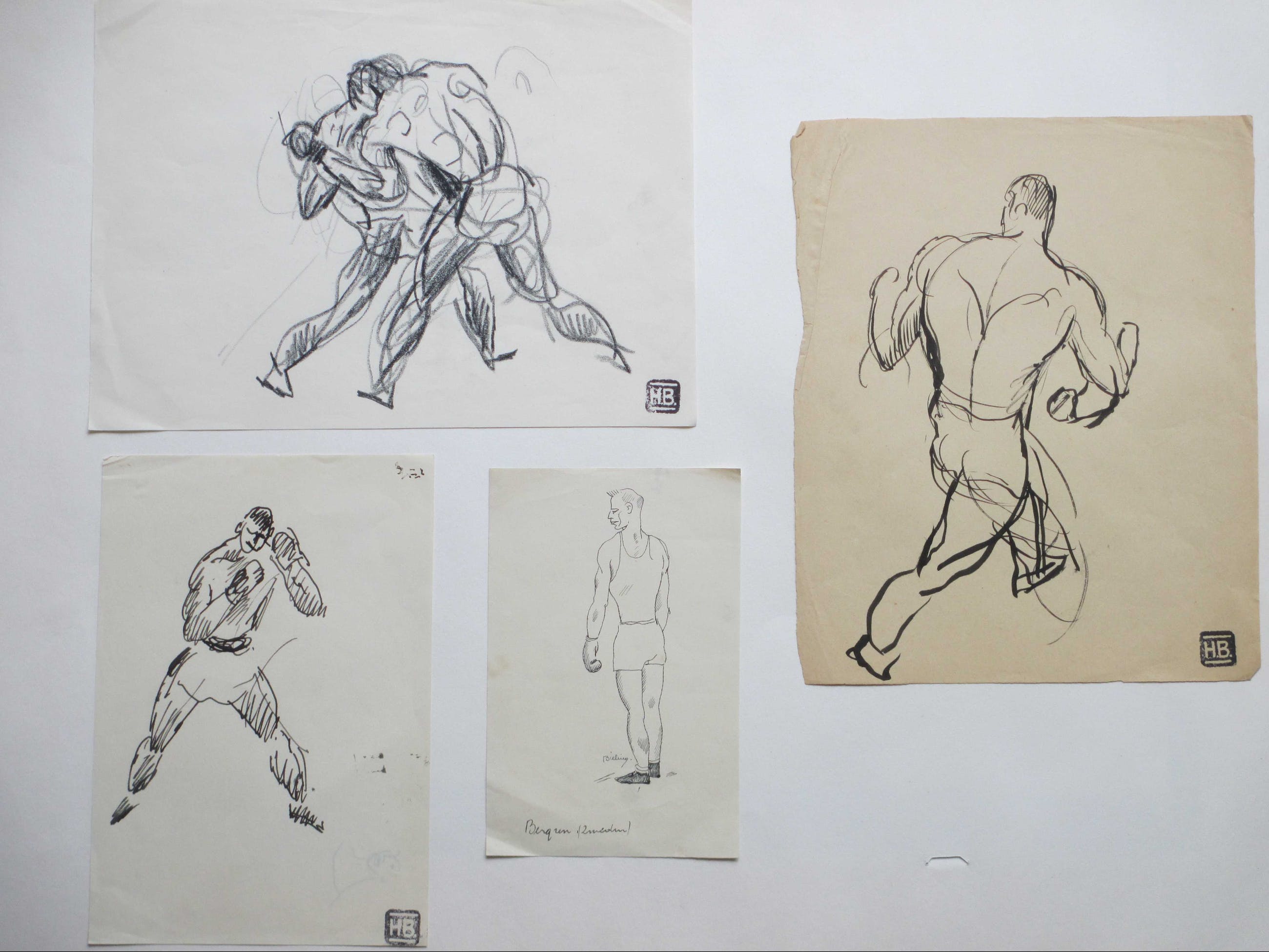 Vier tekeningen door Herman Bieling. Voorstellingen van boksers, al dan niet in actie tijdens bokswedstrijden Losbladig, grootste tekening 20x23 cm Tekening l.o. annotatie: 'Bergren (Zweden)' en handtekening Bieling Alle overige werken zijn voorzien van de originele atelierstempels van Bieling: 'H.B.' Authenticiteit volledig gegarandeerd