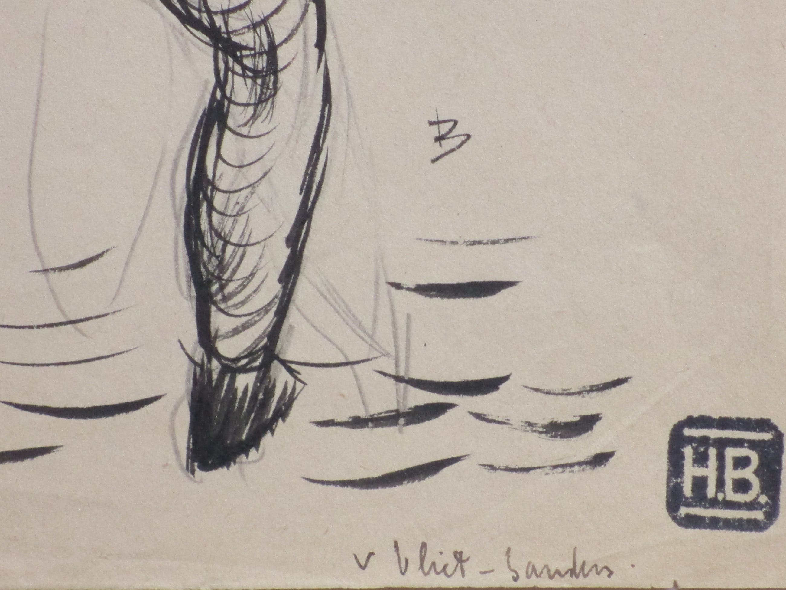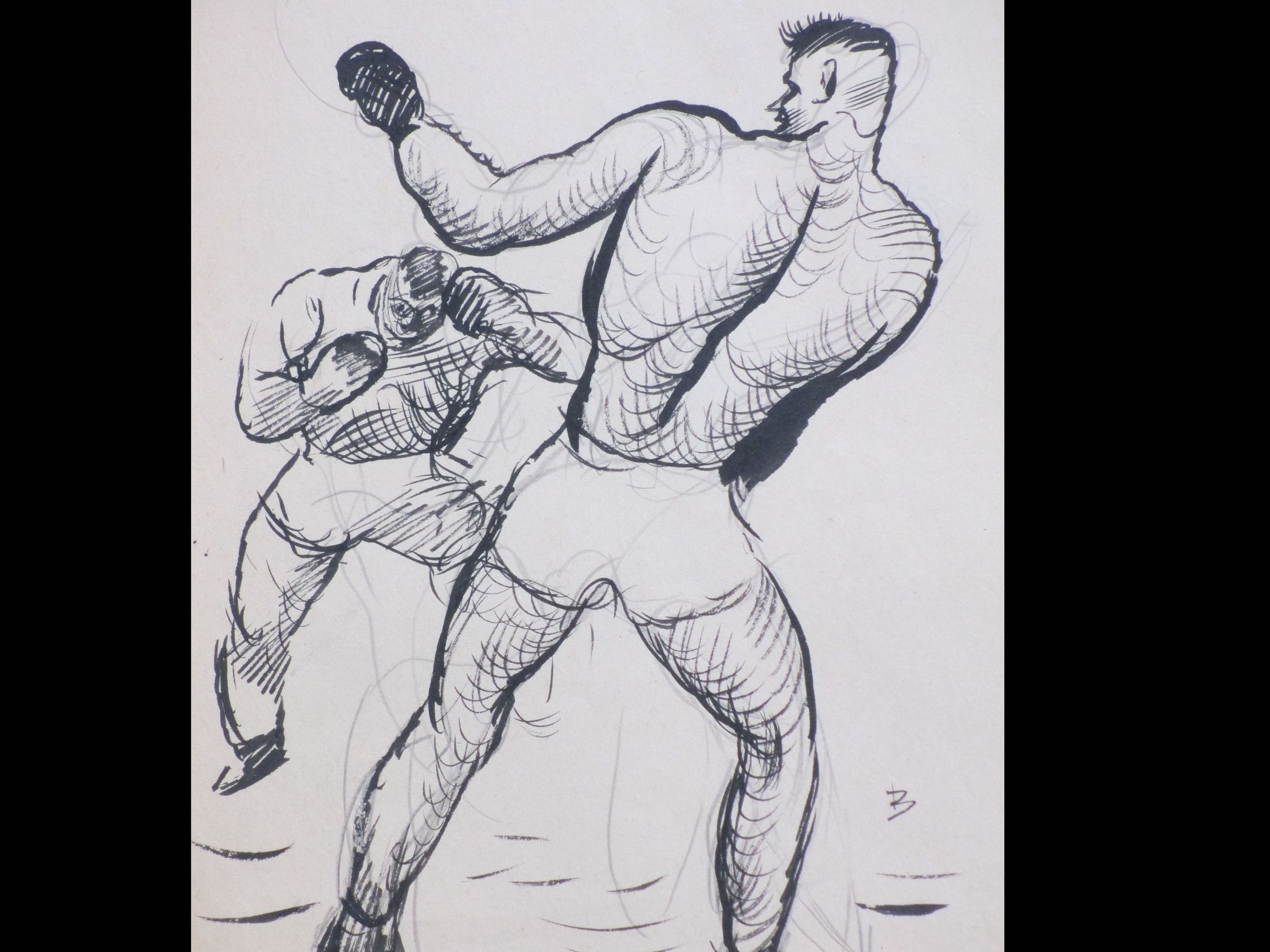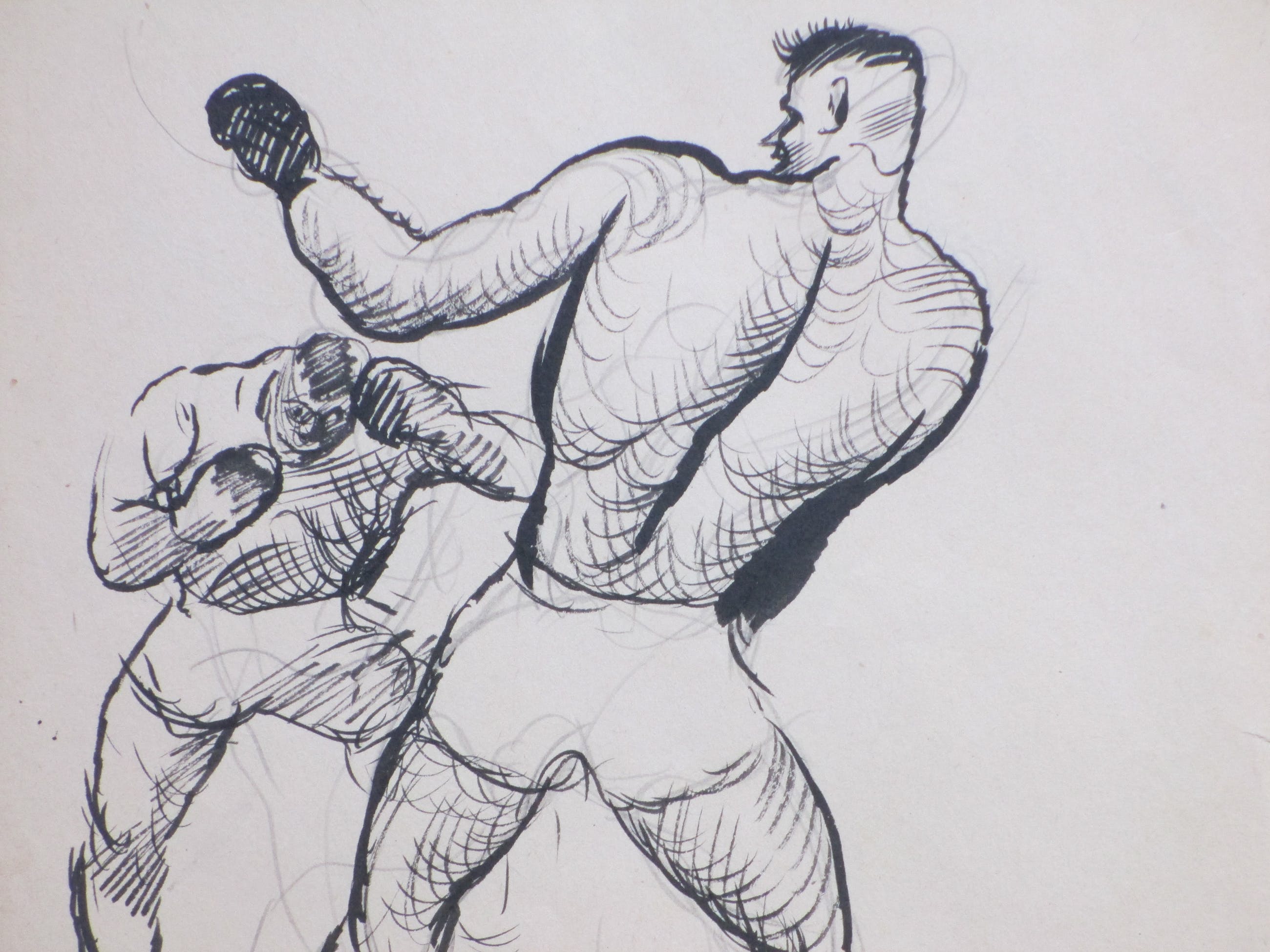 Pentekening door Herman Bieling. Voorstelling van een vooroorlogs boksgevecht. Gemonogrammeerd in inkt r.m. 'B' Tevens atelierstempel rechtsonder. Annotatie over gevecht: 'v. Vliet - Sanders' (versus)