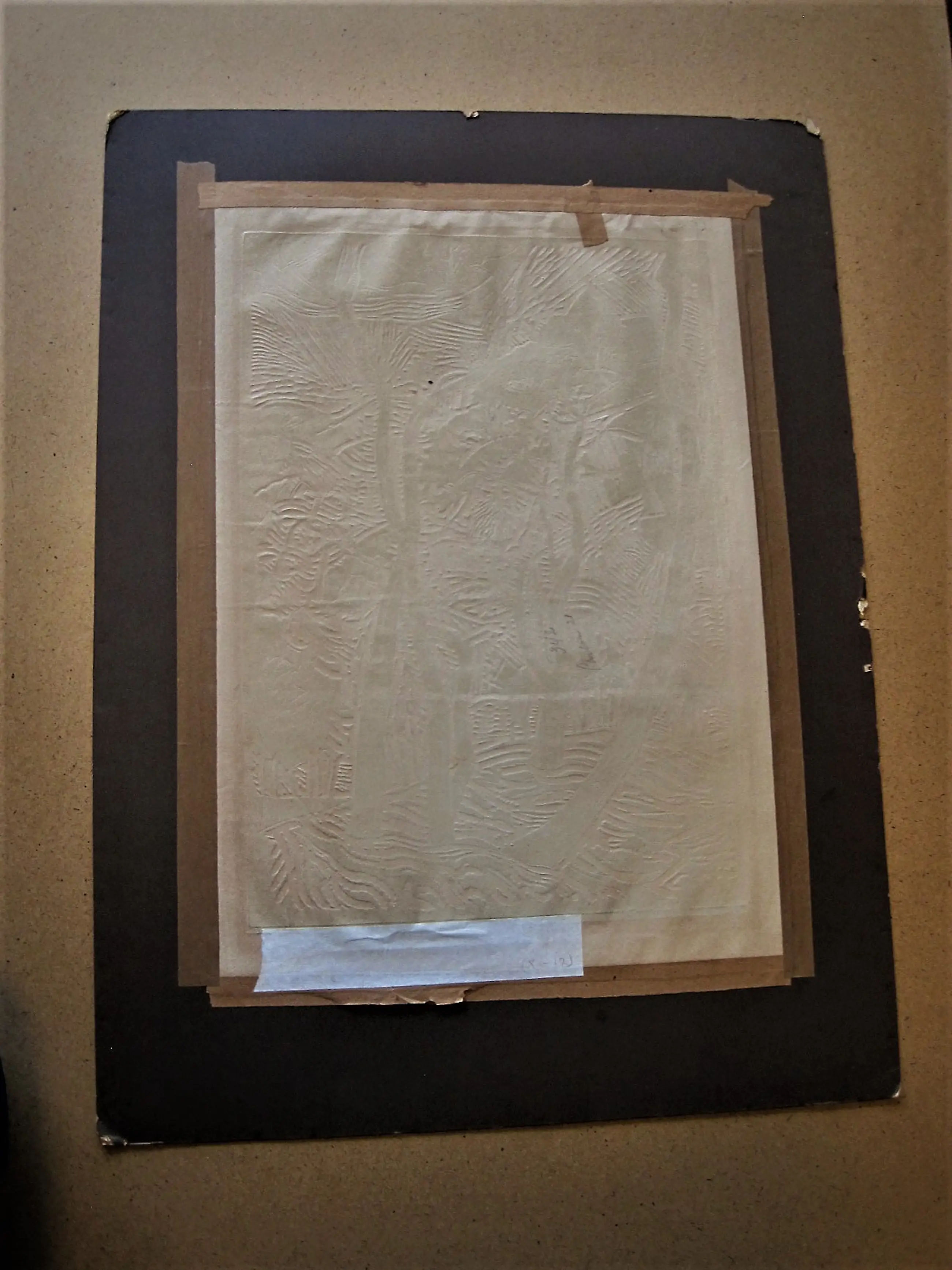 De Houtsnede zelf verkeert in goede conditie, maar aan de onderzijde en aan de linkerbovenzijde (in de blanco marge) zijn er scheurtjes zichtbaar.