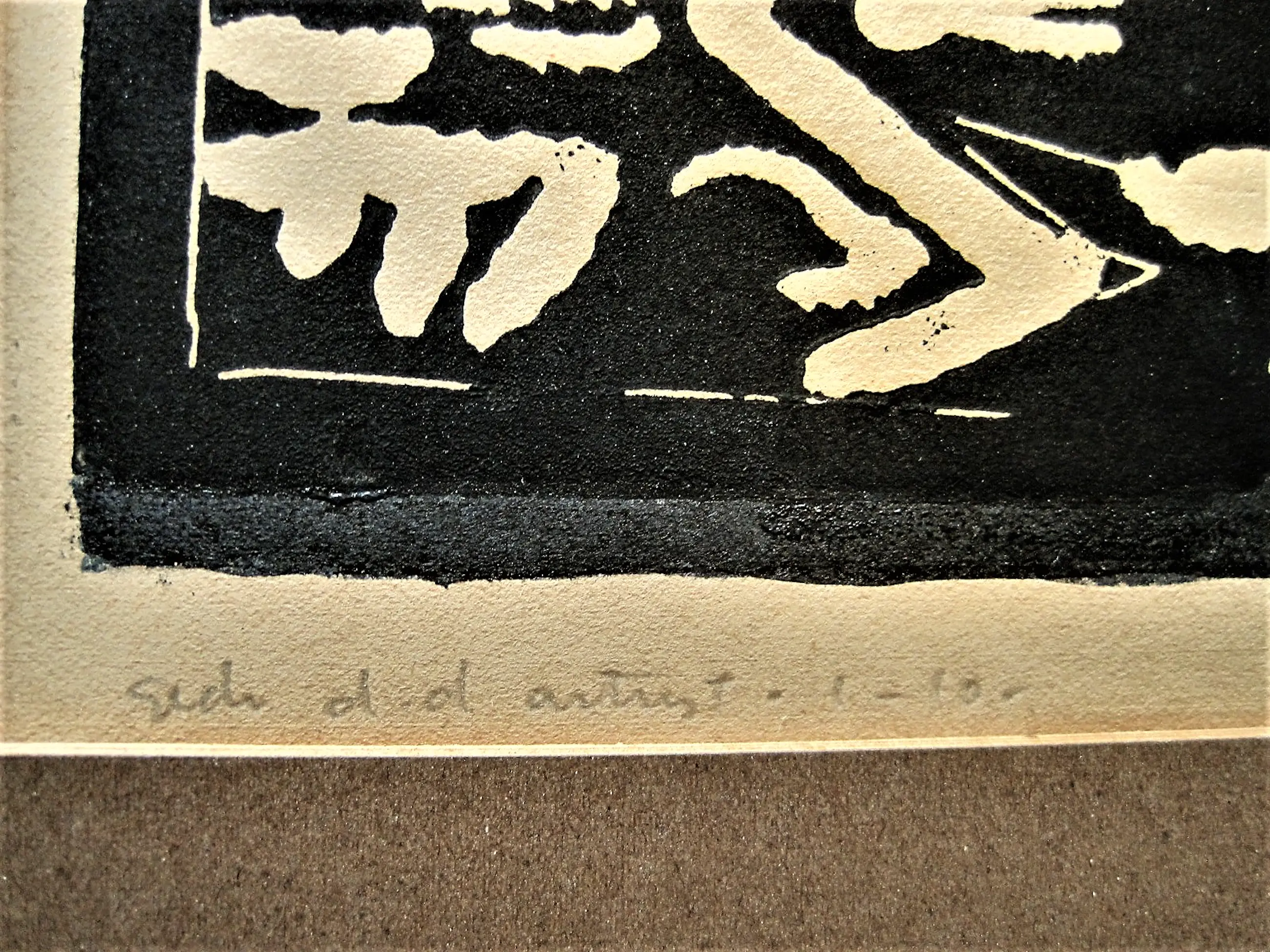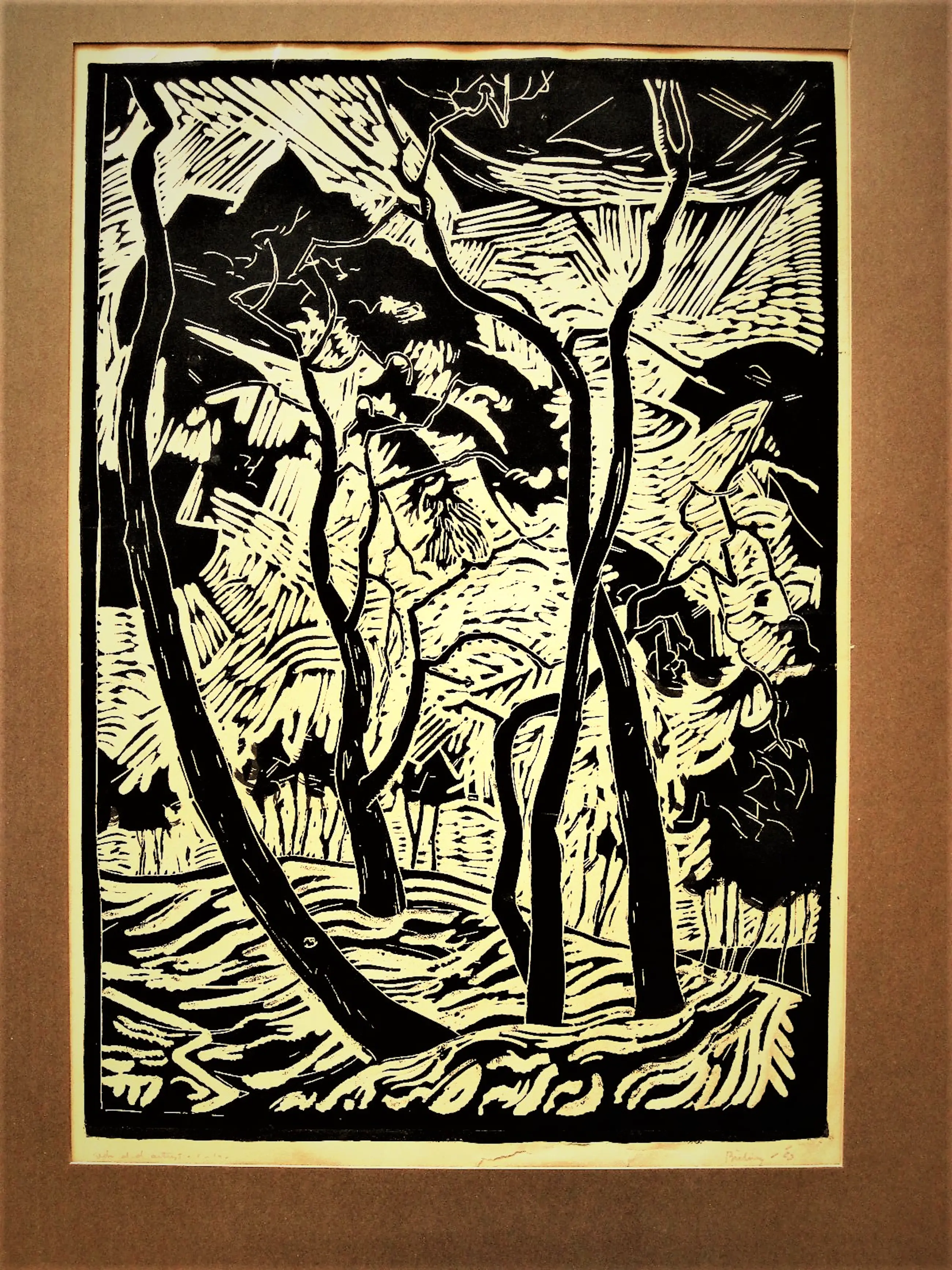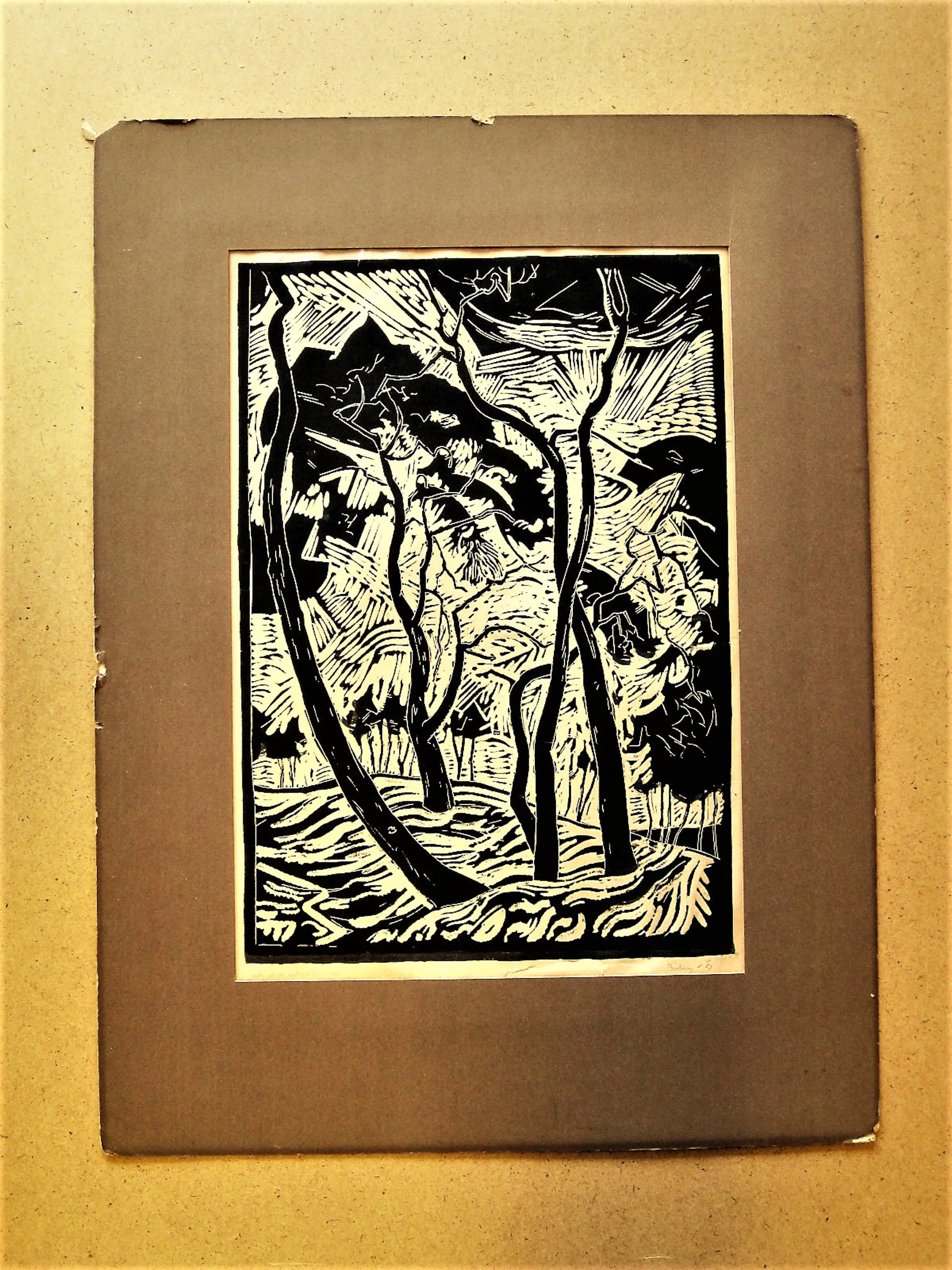 Originele en raltief grote, in 1923 door de bekende Rotterdamse schilder en graficus herman Bieling gemaakte Epreuve d'Artiste houtsnede "Compositie / Landschap". Aan de onderzijde potloodgesigneerd en gedateerd. Totale bladmaat 46.5x31.5 cm.