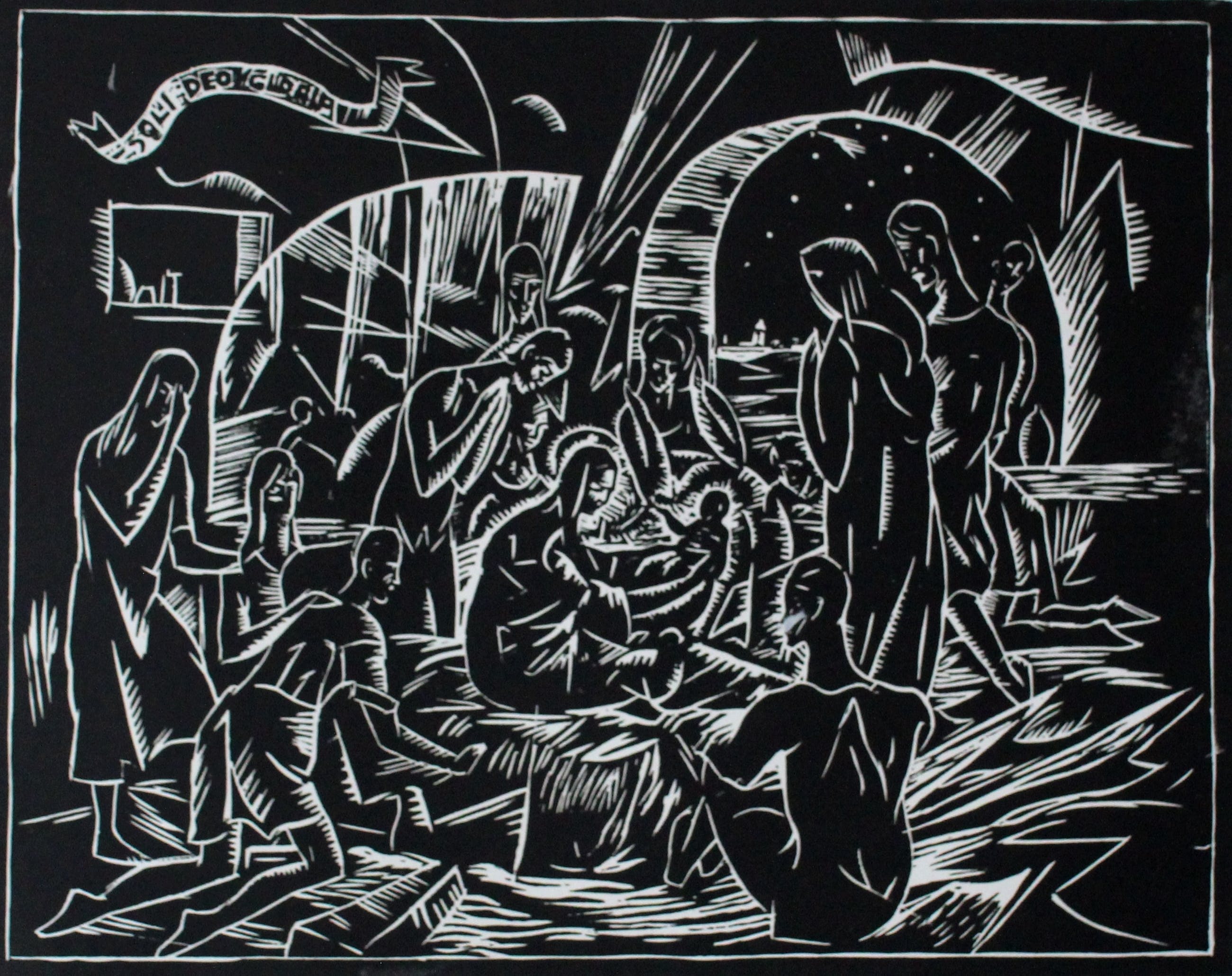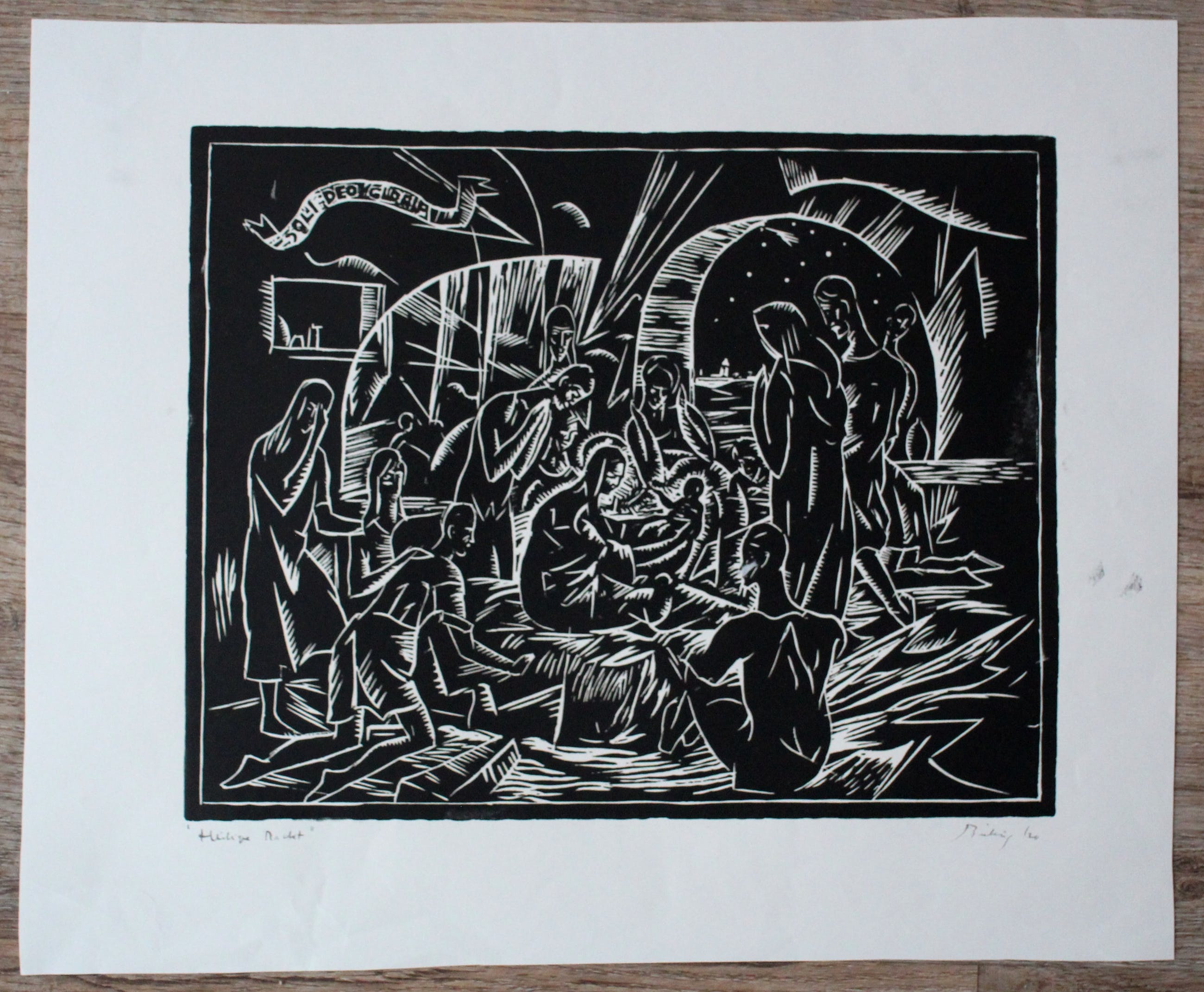 Houtsnede van Herman Bieling. Titel: "Heilige Nacht". Jaar: 1920. Afmetingen blad: H35 x b42.5cm. Afmetingen voorstelling: H25.5 x b32cm. Het werk is, rechts onderaan, gesigneerd door de kunstenaar. De authenticiteit van het aangeboden werk wordt volledig gegarandeerd. Een certificaat van echtheid kan, op aanvraag, worden gemaild.