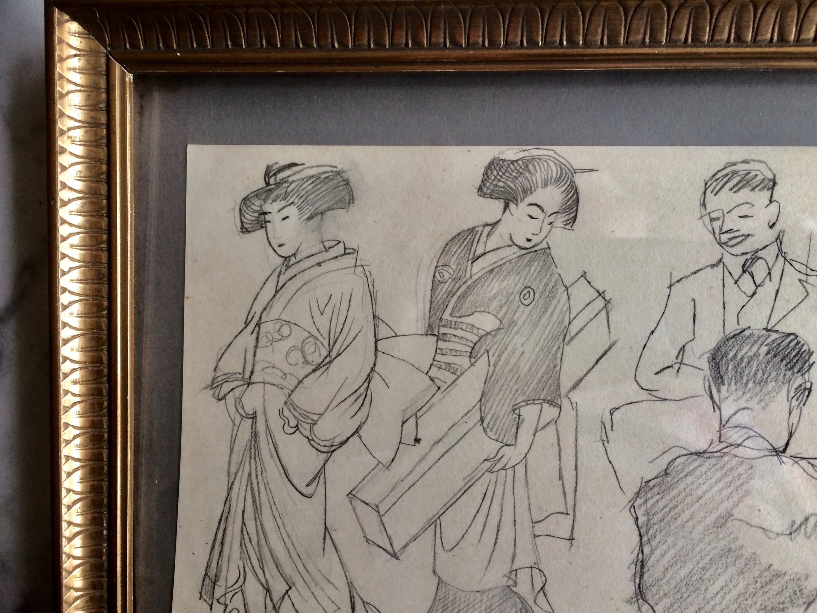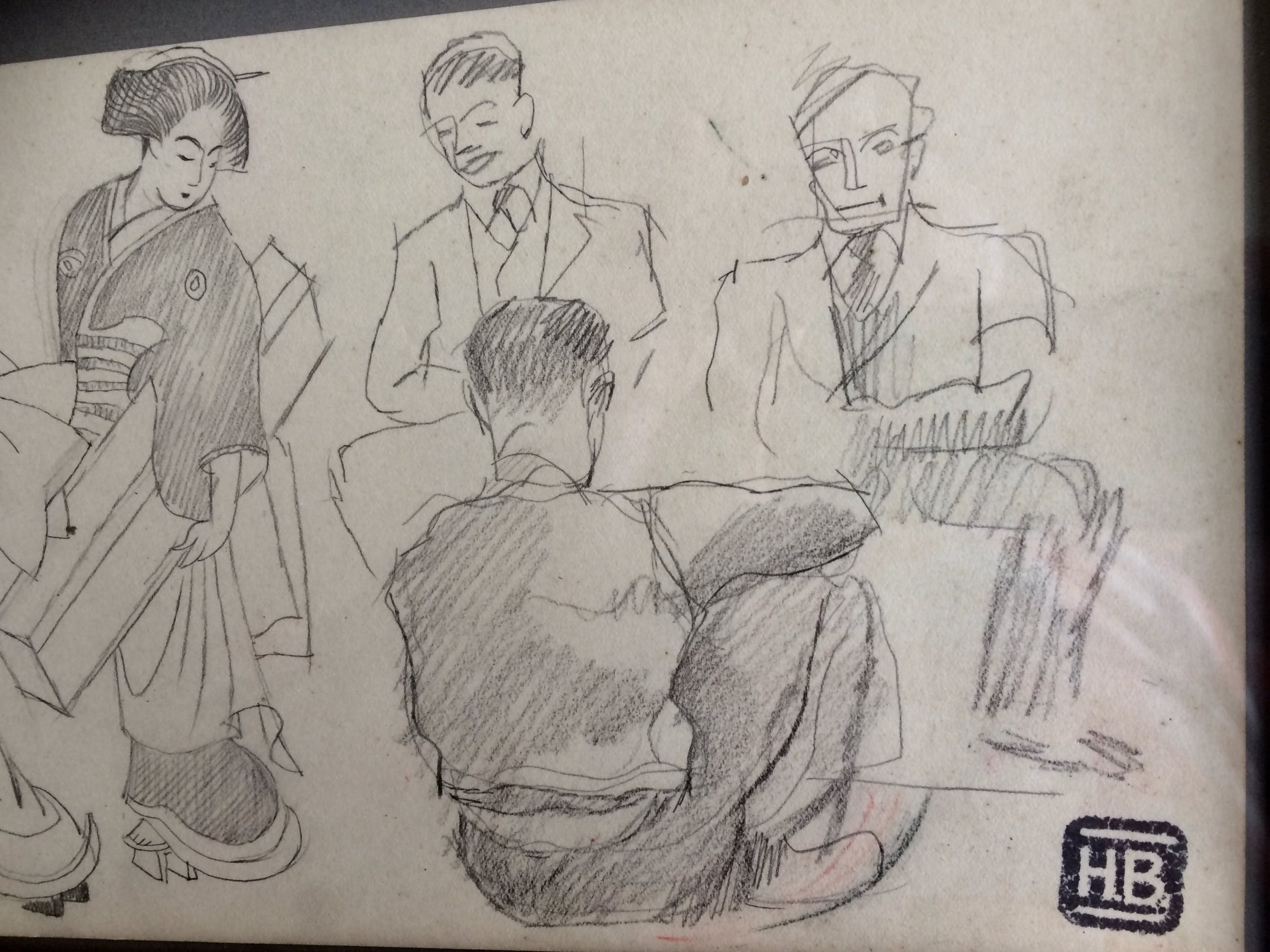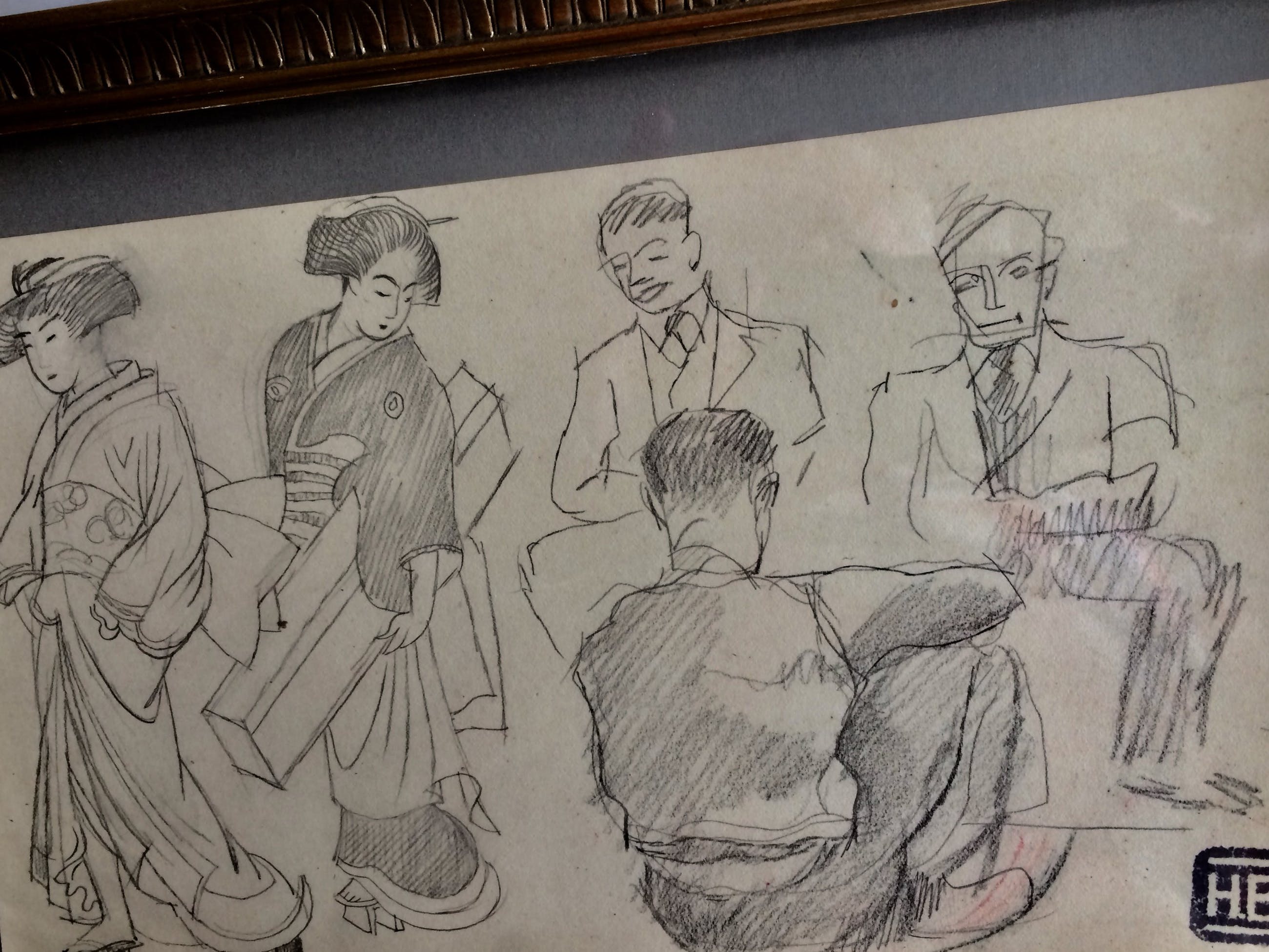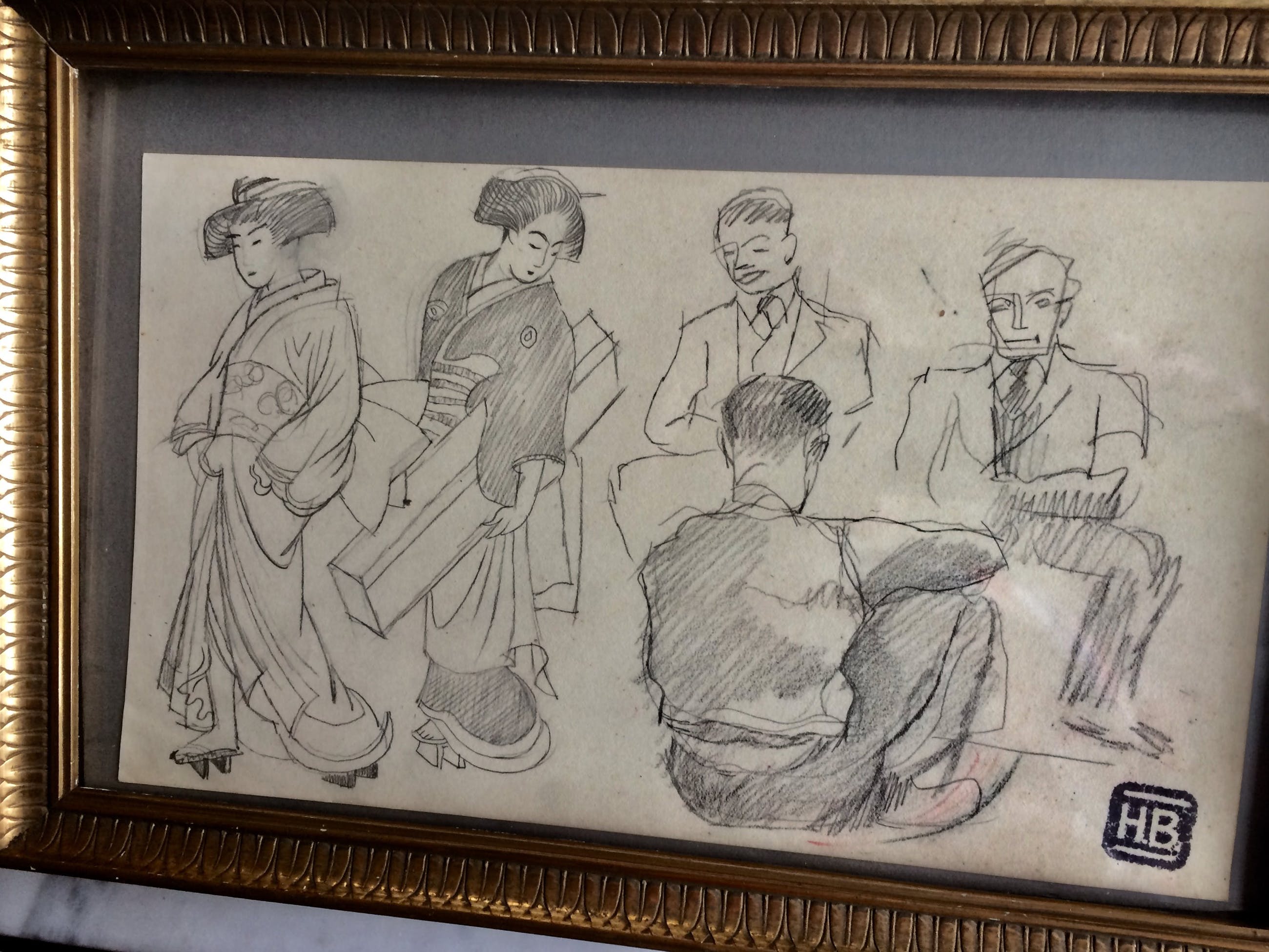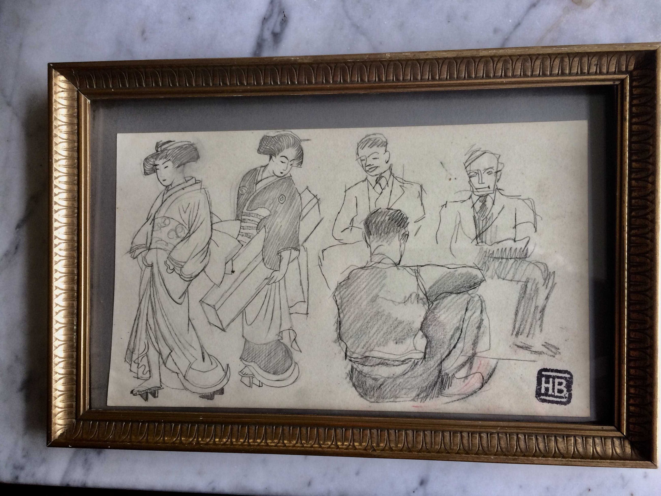 Fraaie potloodtekening die mogelijk heeft gediend als voorstudie voor een later schilderij. Vooral de Japanse dames zijn gedetailleerd weergegeven met hun fraai kapsel en hun kimono’s. Detail dat opvalt zijn klompjes, die deze dames destijds droegen. De mannen zitten er zeer ontspannen bij. Bieling was een prominent en verlzijdig kunstenaar. Hij was Kunstschilder, graficus en beeldhouwer. Zijn werk was expressief en vooral in zijn grafiek en beelden kwam het kubisme sterk naar voren. Bovendien stond zijn deur open voor jonge kunstenaars die veel van hem leerden en die ook vaak een hapje konden mee-eten. Daarnaast was Bieling een grage reiziger. Het Verre Oosten had een grote aantrekkingskracht voor hem, ook getuige het werk dat nu wordt aangeboden. De tekening is rechtsonder gesigneerd met het persoonlijke Stempel ( HB ) van Bieling. Het werk wordt met het gave oude vergulde lijstje geleverd. Verzending per PostNL. ( k.k.) Ophalen op afspraak is mogelijk.