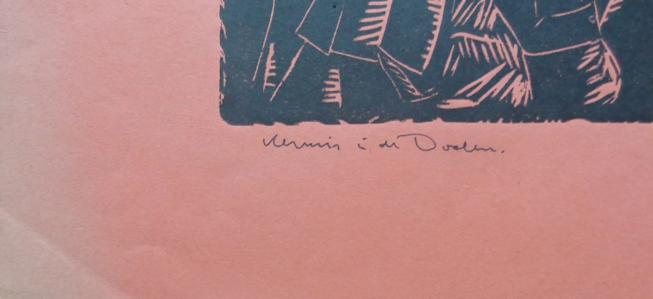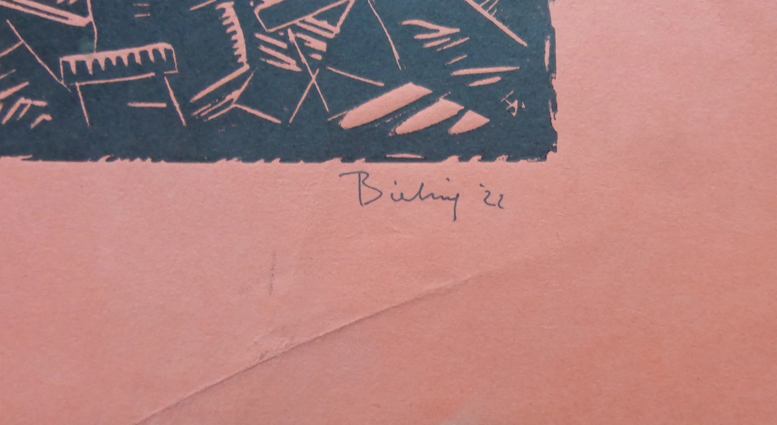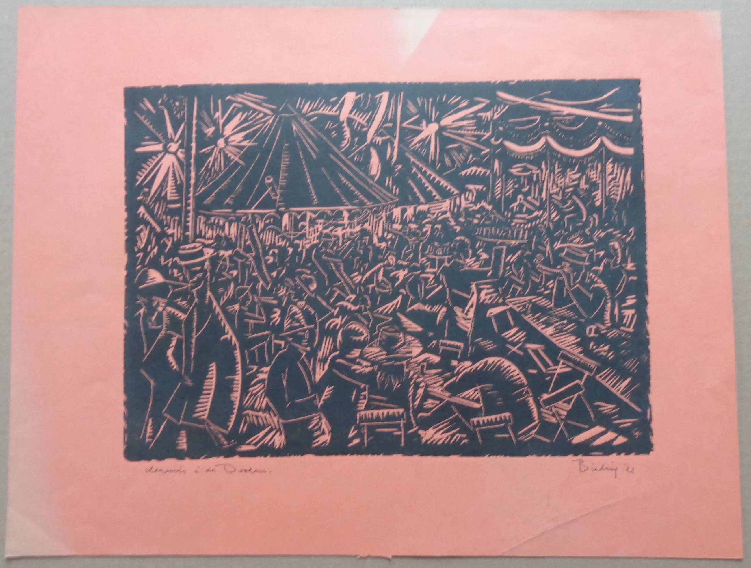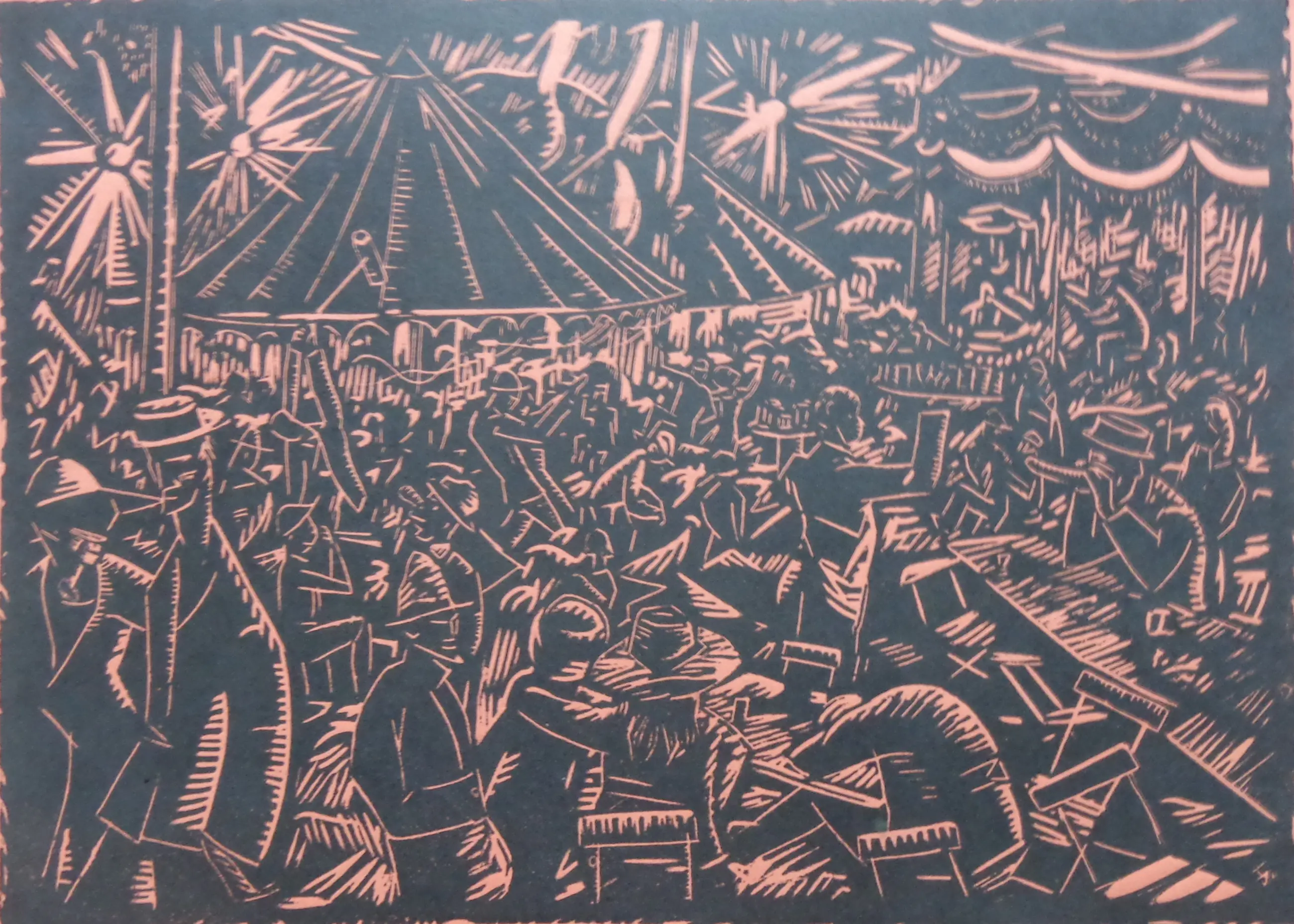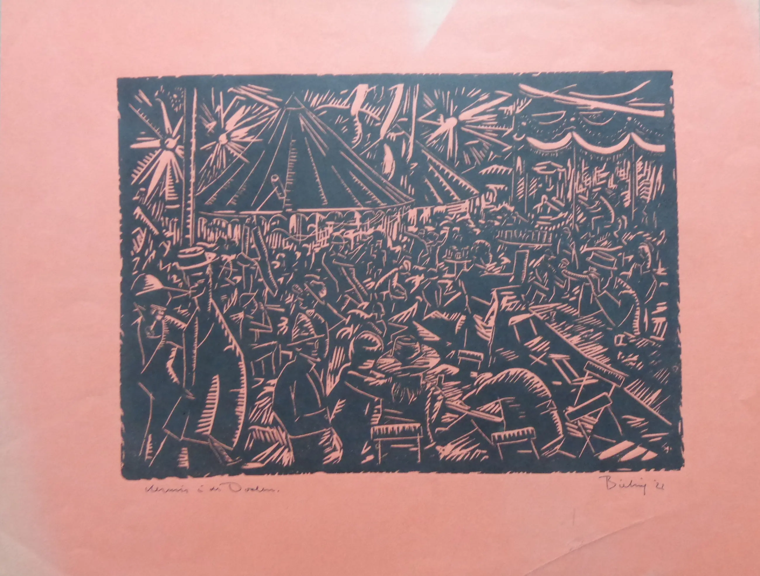 Herman Bieling (1887-1964). Titel: "Kermis in de Doelen" (Rotterdam). Zwart-wit houtsnede op rozig papier. Gesigneerd met inkt. Geen nummering. 1922. Blad: 33x43cm. Goede staat. Vouwen + Verkleuring.