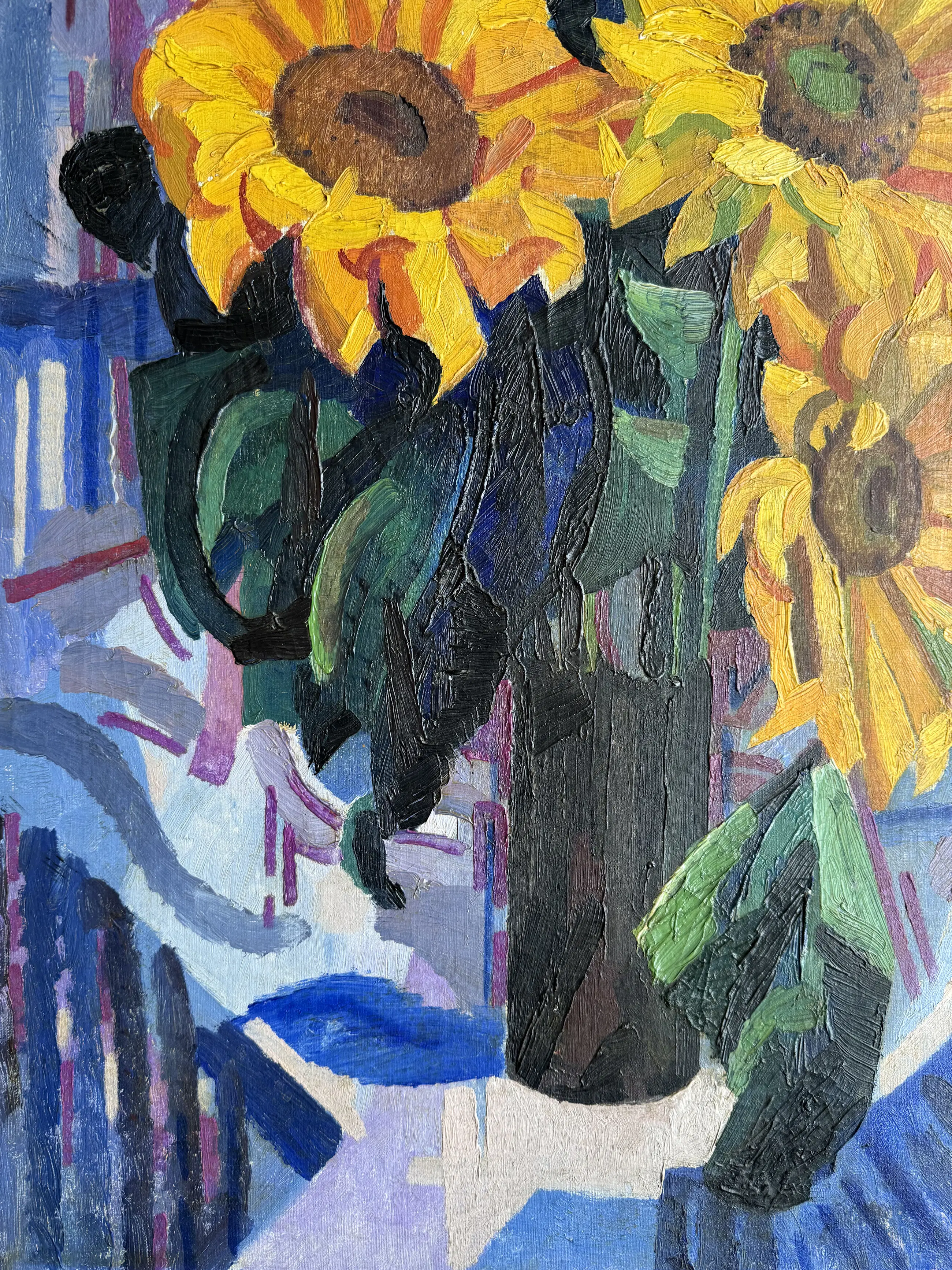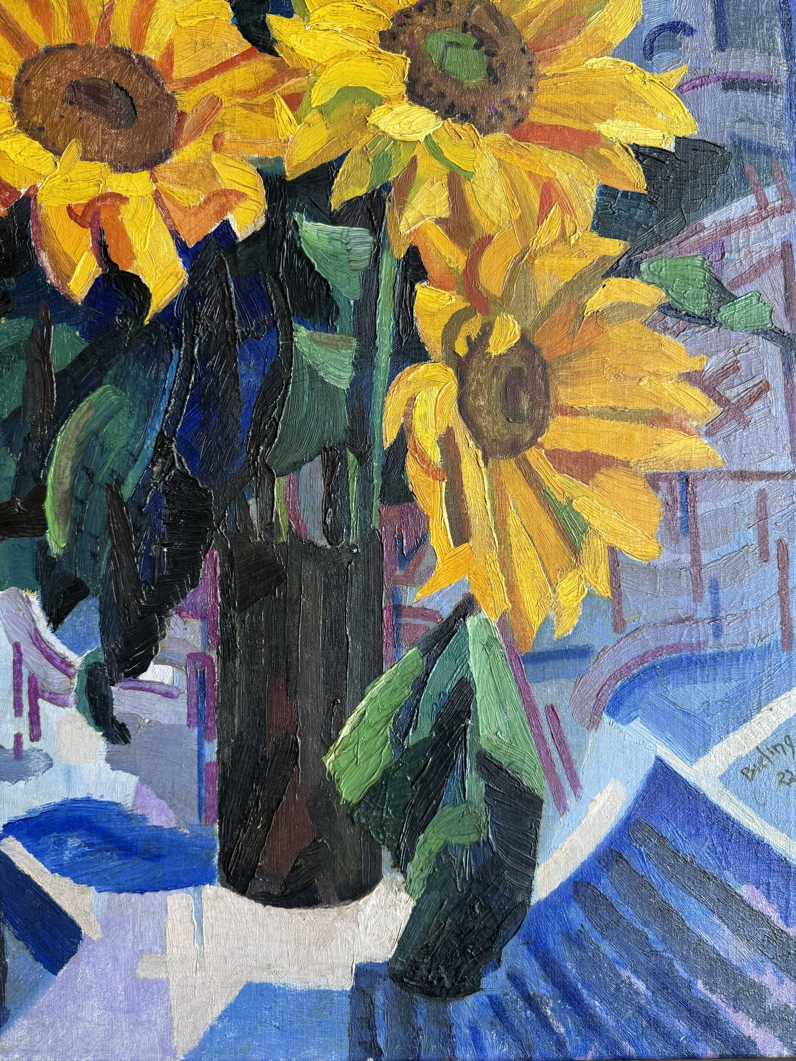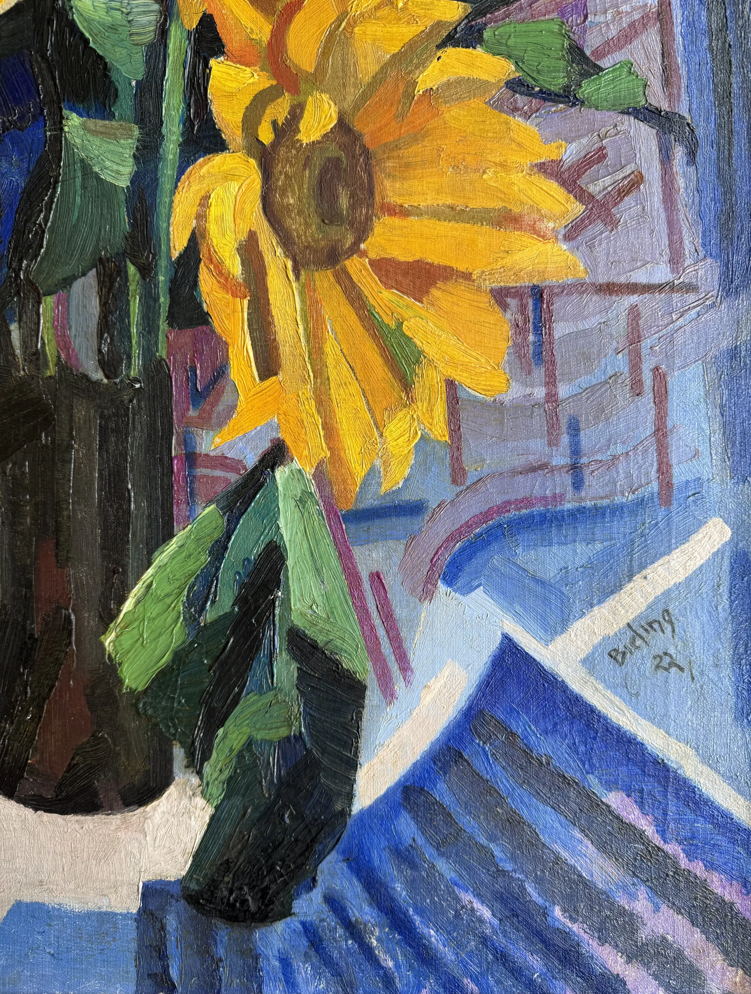Fantastisch olieverf op doek uit 1922. Prachtige kubistische voorstelling met zonnebloemen op een vaas. De achtergrond is geschilderd met het befaamde 'Bieling-blauw', wat na meer dan 100 jaar nog altijd van het doek af spat.