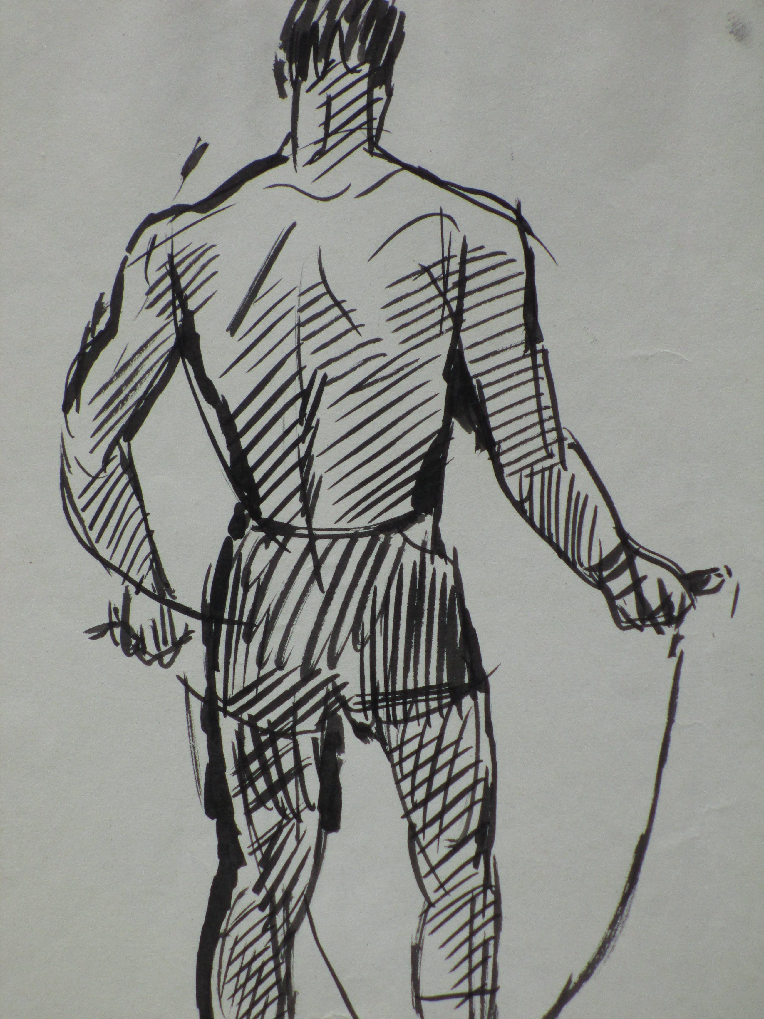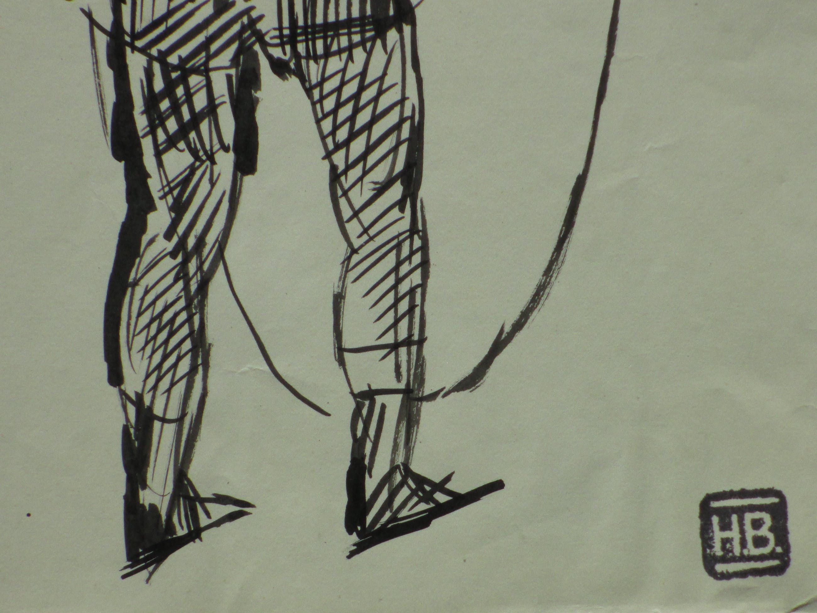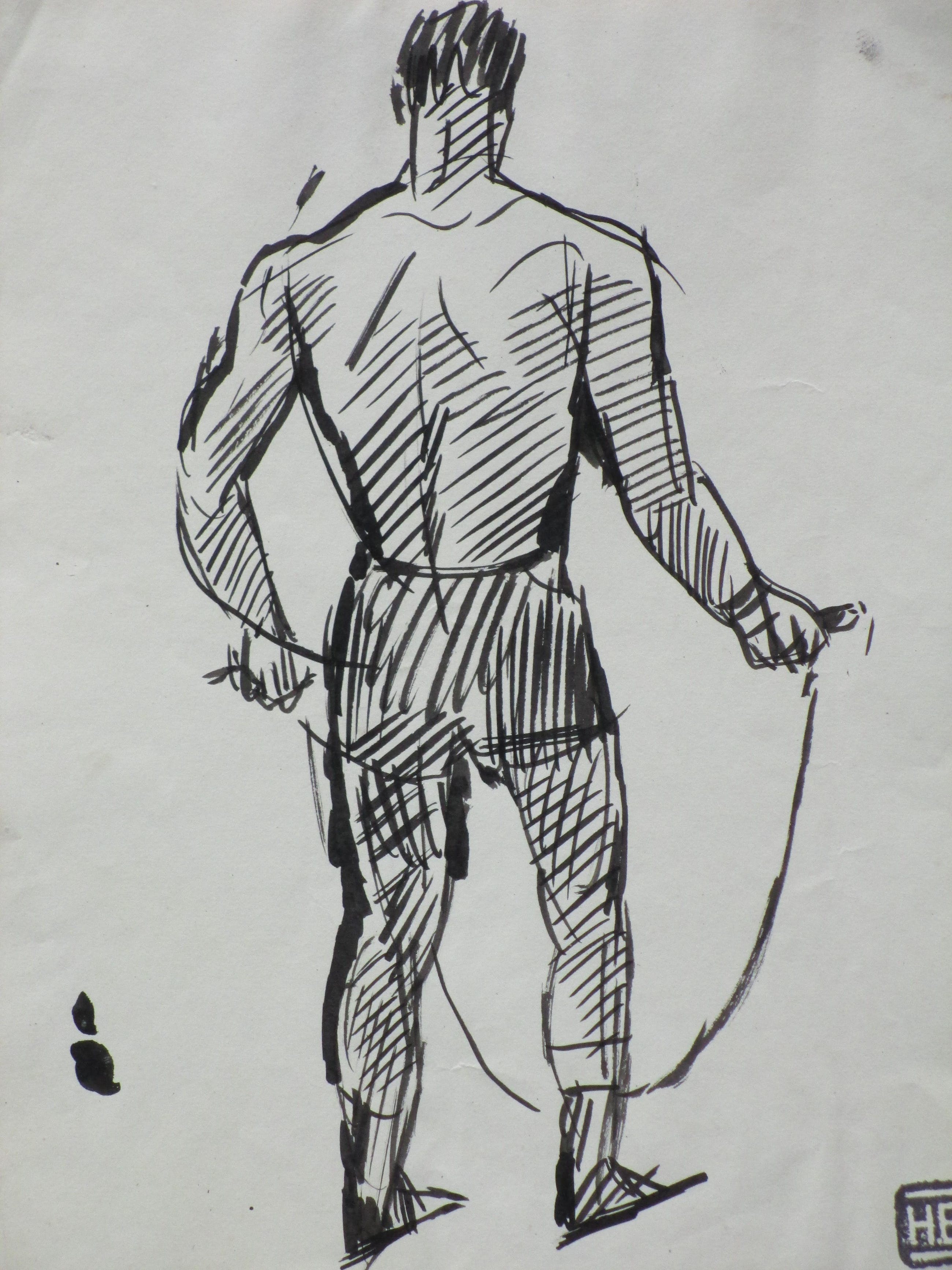 Inkttekening door Herman BielingVoorstelling van een touwtjespingende bokserLosbladig, beeldmaat 25x13, bladmaat 26x22Niet gesigneerdAtelierstempel met monogram 'H.B.' r.o.Authenticiteit volledig gegarandeerd
