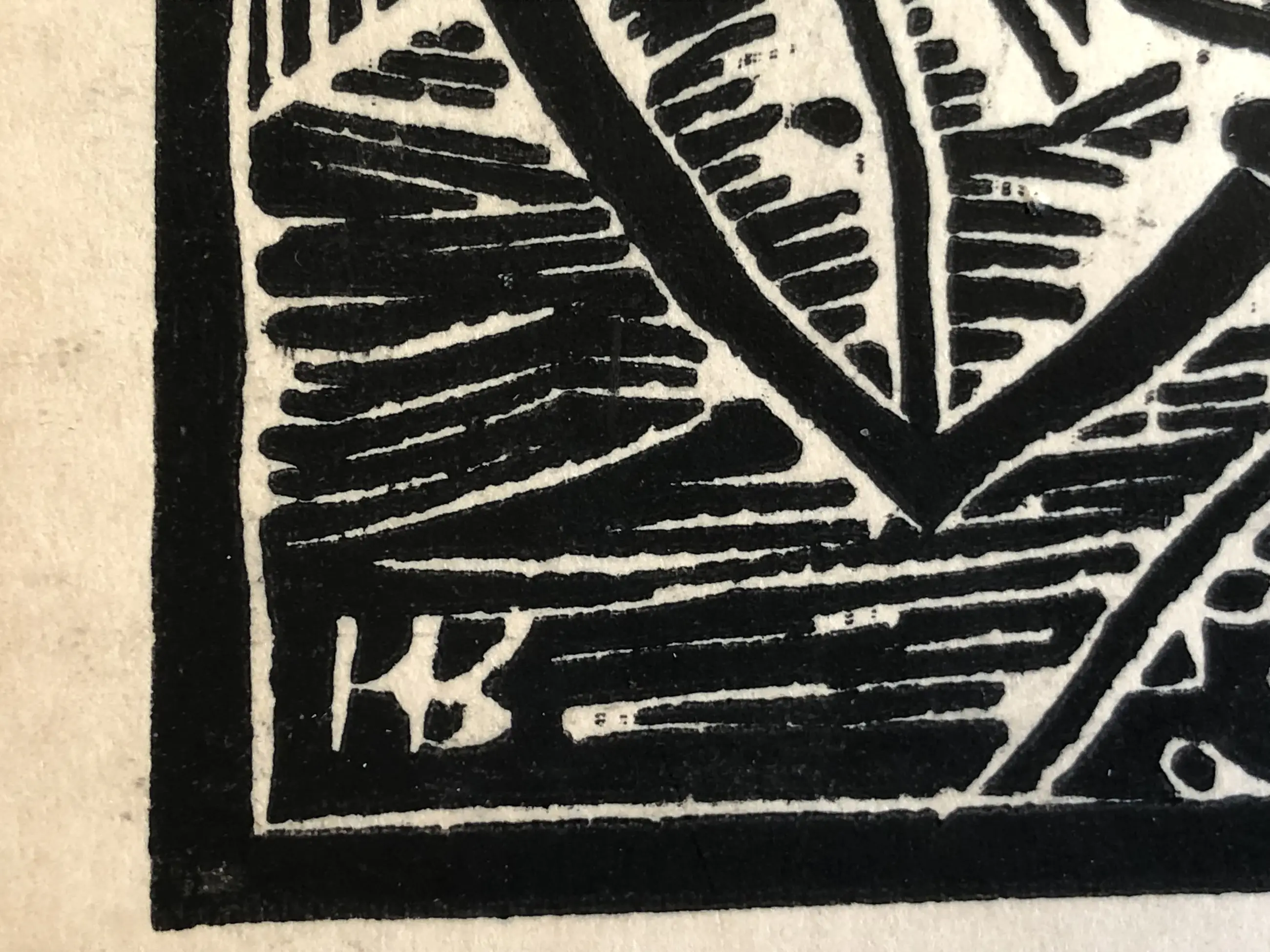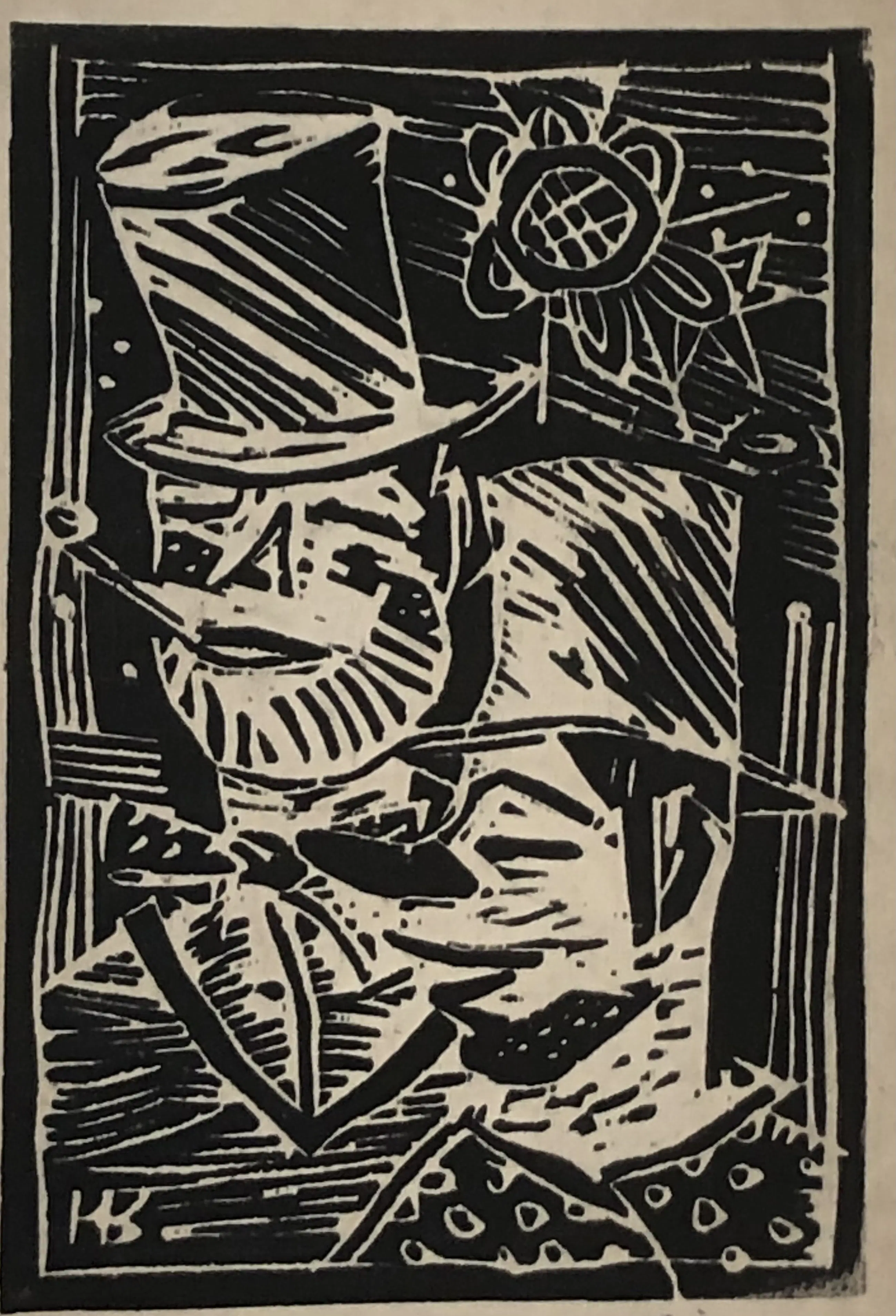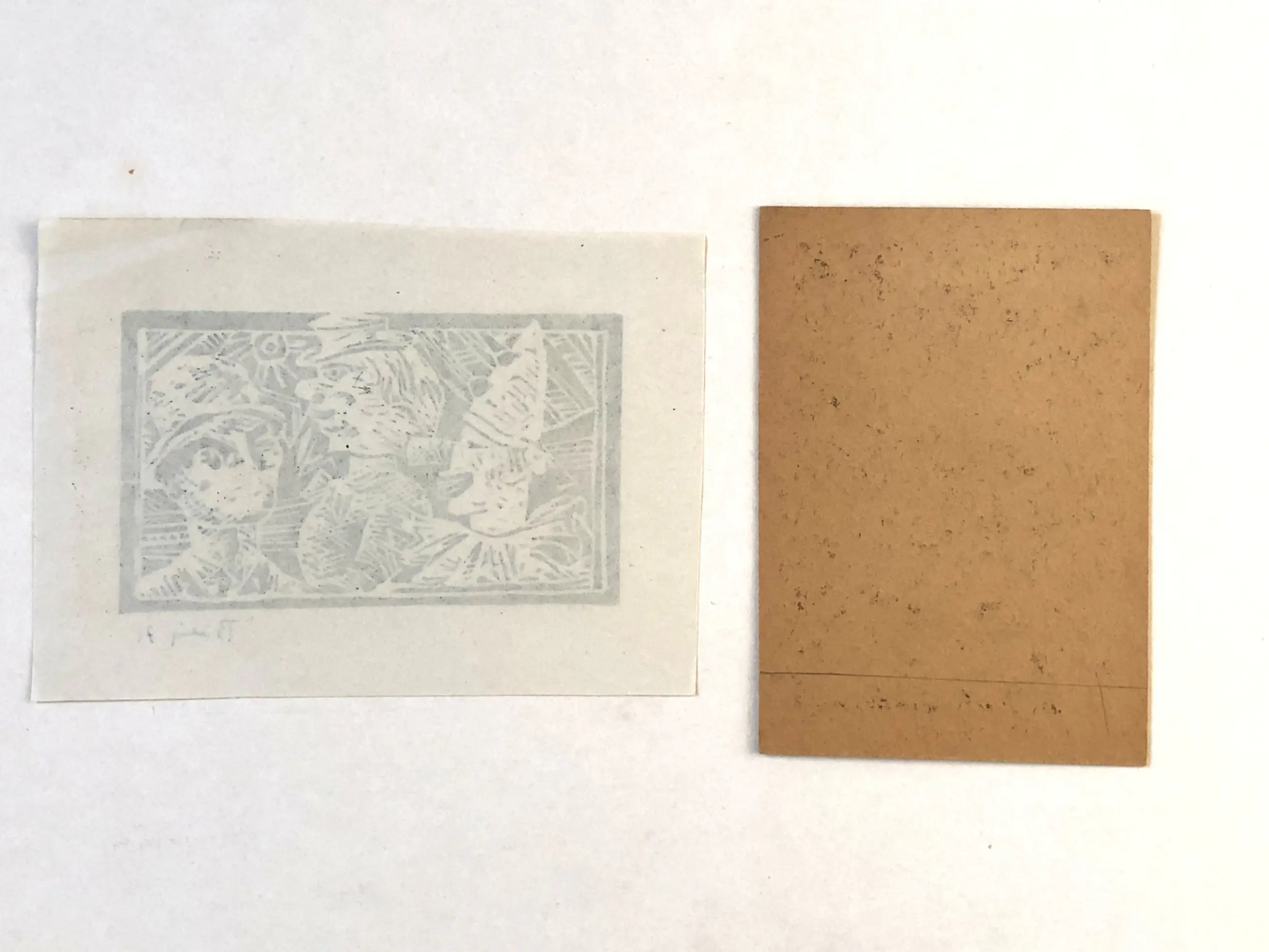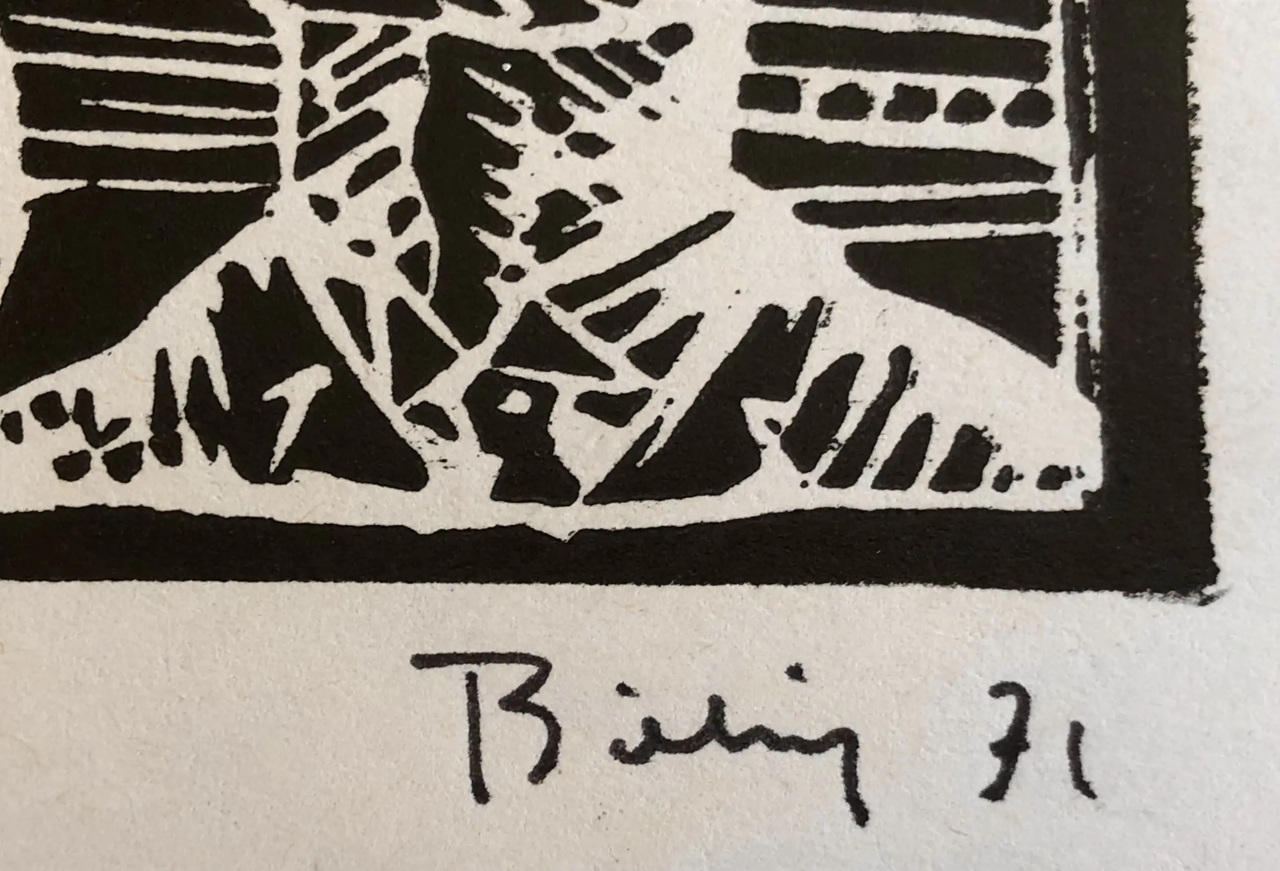2. Voorstelling met twee clowns met hoge hoed. Gesigneerd met paars potlood “Bieling” rechts onder in de marge. Monogram “HB” linksonder in het blok. Te dateren 1931-1933. Een paar vlekjes in de marge, verder perfect. De houtsnede is oorspronkelijk afgedrukt op zeer dun papier en later verlijmd op dun karton. Afbeelding 12 x 8,3 cm, karton 14 x 10,3 cm.