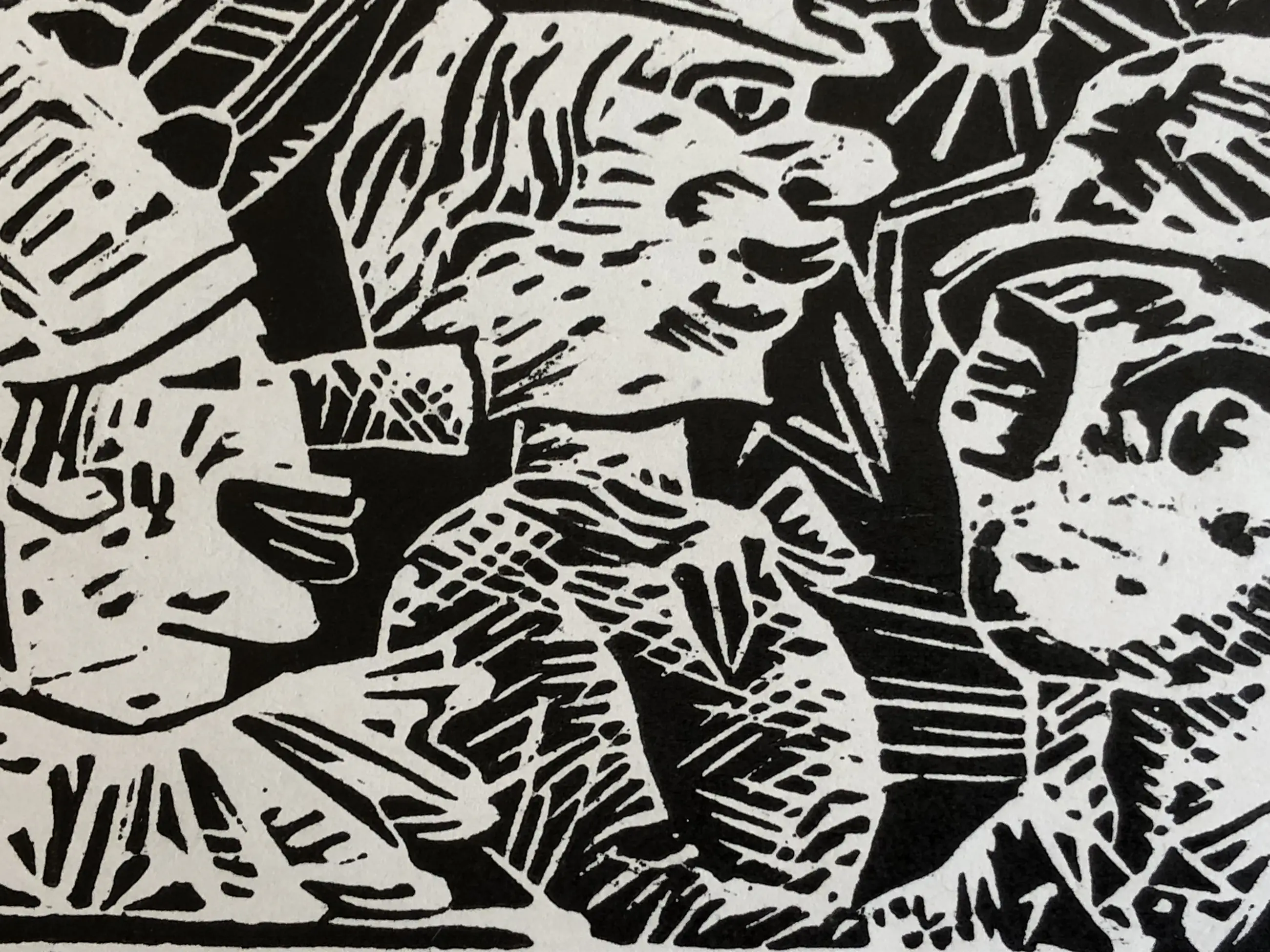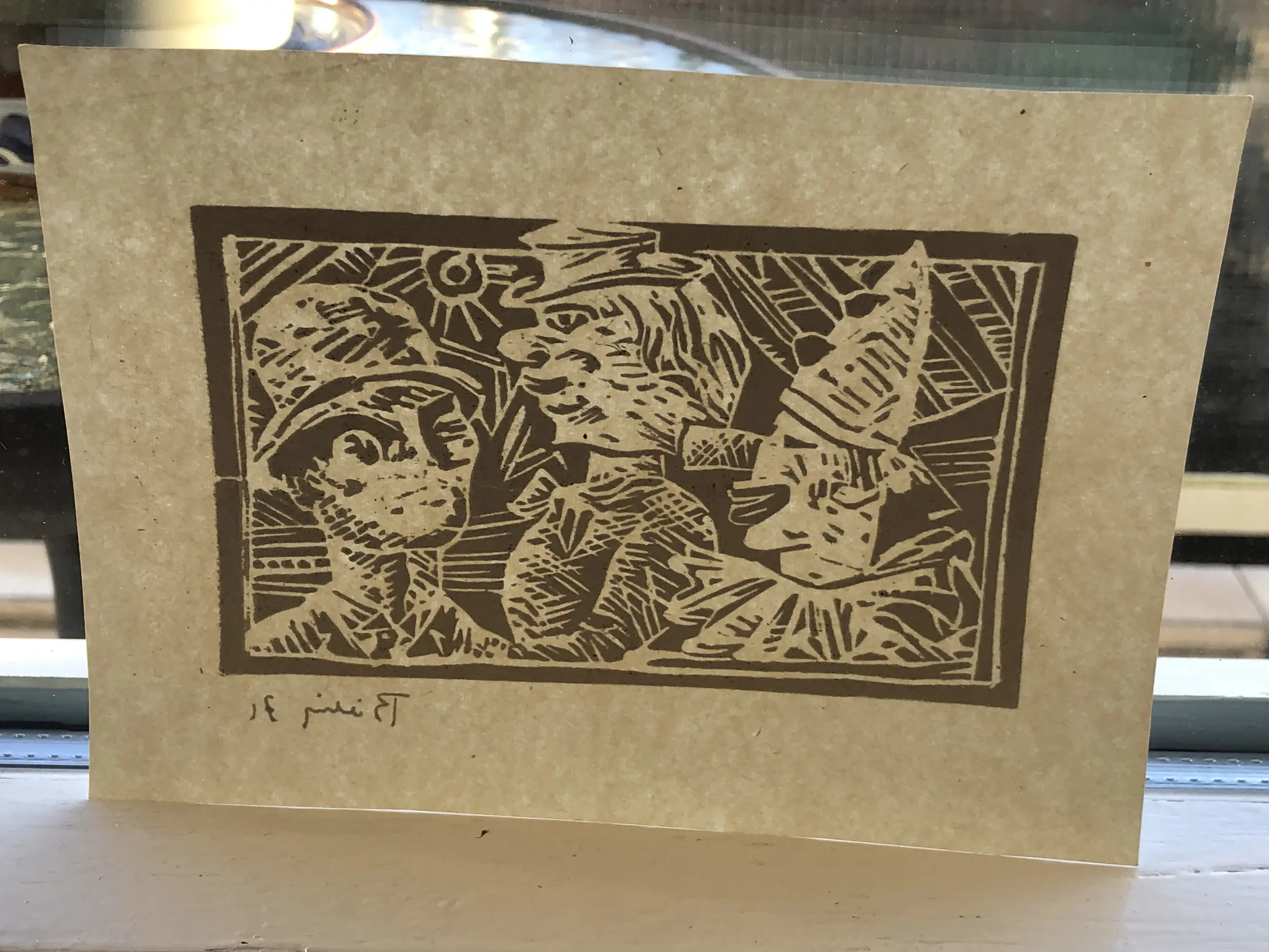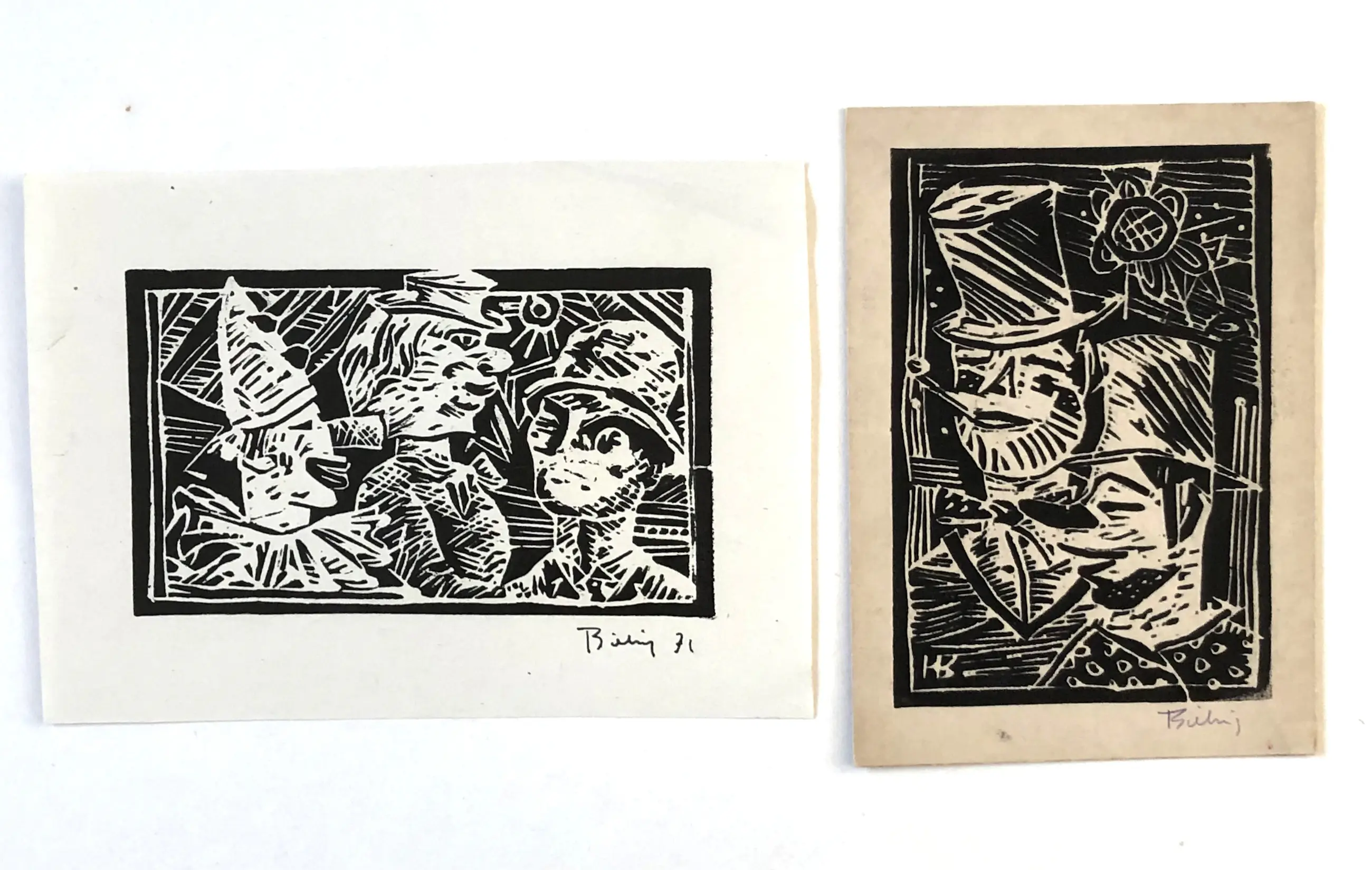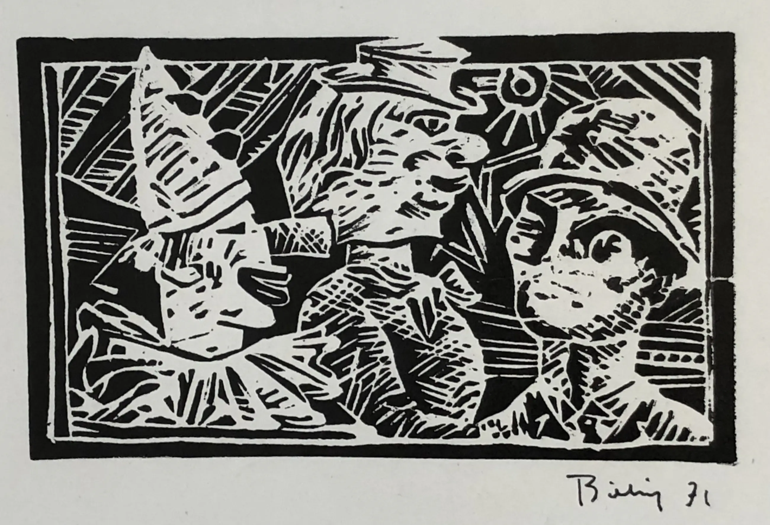 1. Voorstelling met drie clowns. Gesigneerd “Bieling ‘31”. Formaat afbeelding 7,7 x 12,8 cm. Inclusief de ruime marges is het papier 12 x 17 cm. De houtsnede zelf verkeert in perfecte staat, in de marge bevinden zich rechts boven twee lichte vouwen, nauwelijks zichtbaar en ver buiten de afbeelding.Afgedrukt op zeer dun papier.