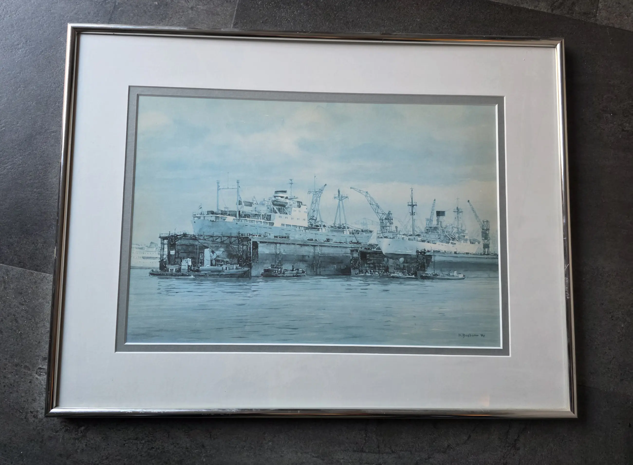 Dit exemplaar dat is dus één van die drie havengezichten — een typisch en mooi stukje Rotterdamse maritieme kunst uit 1992
