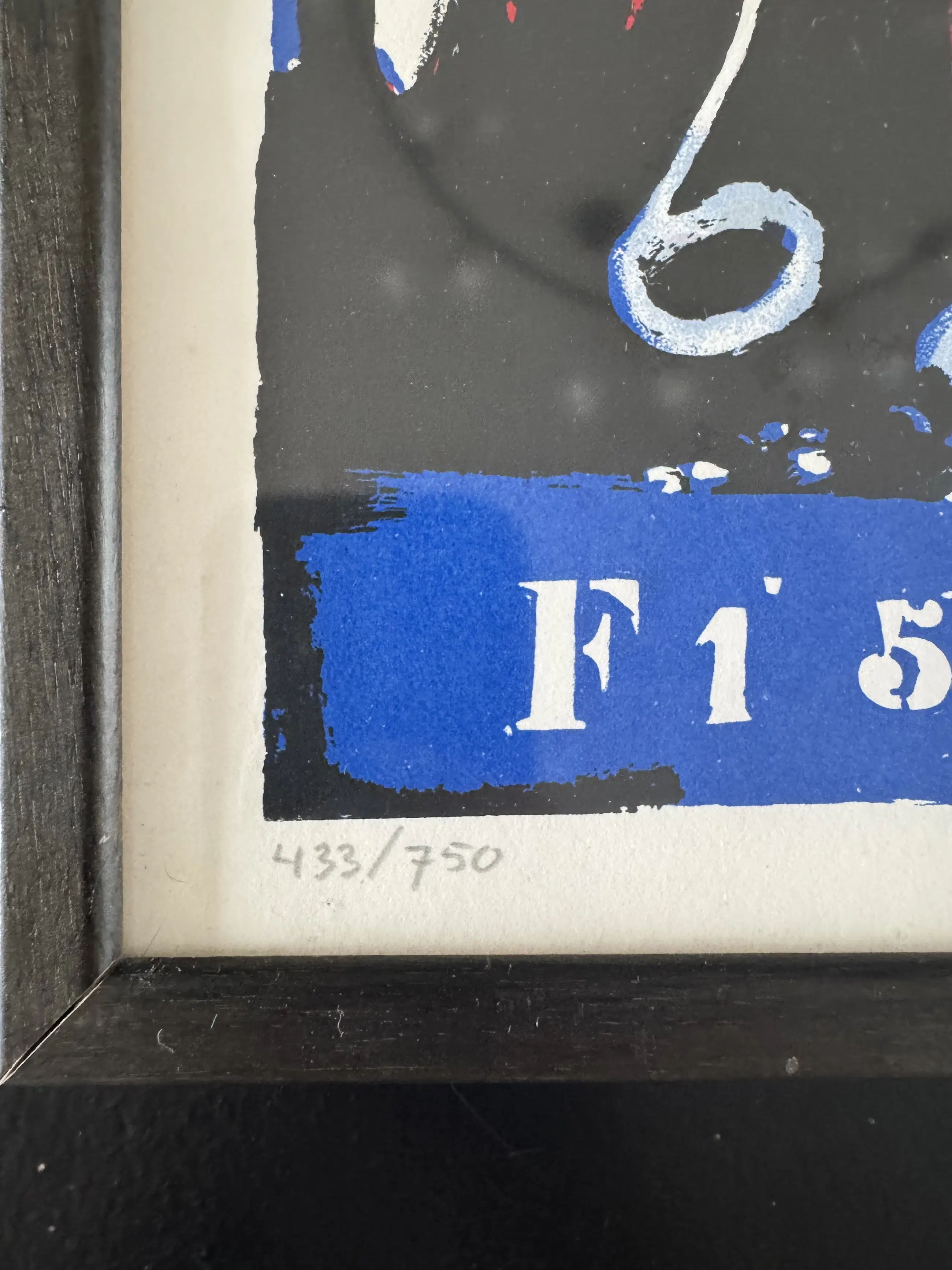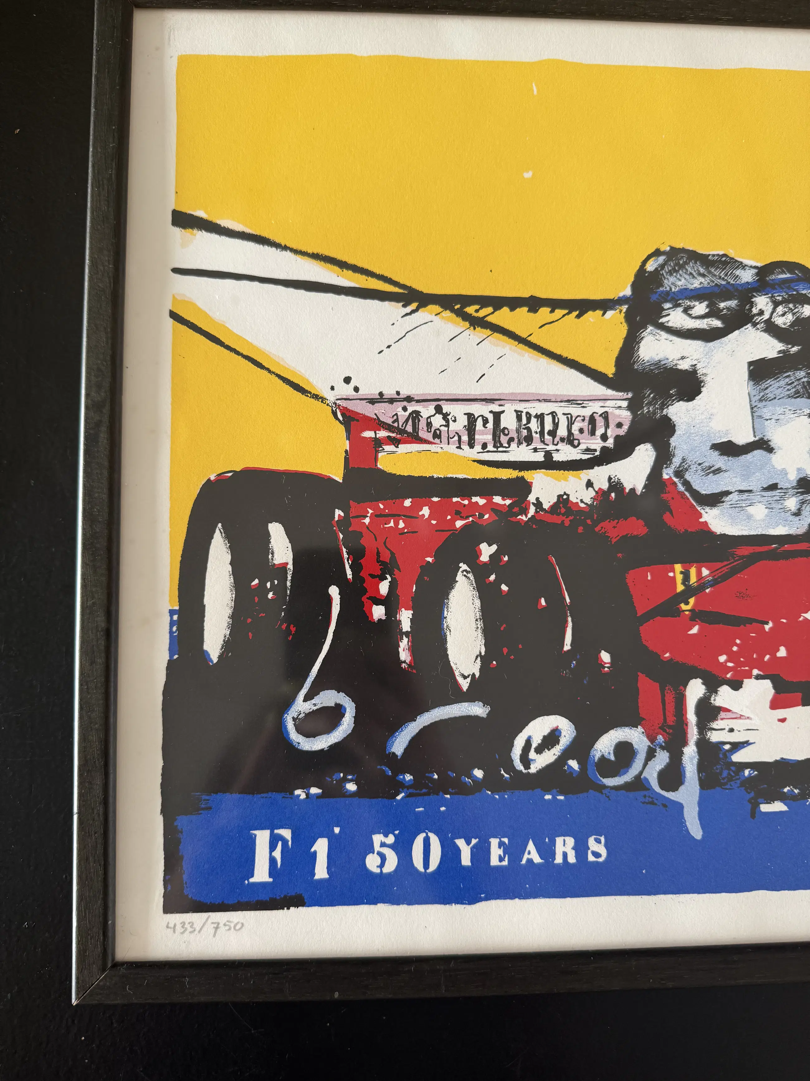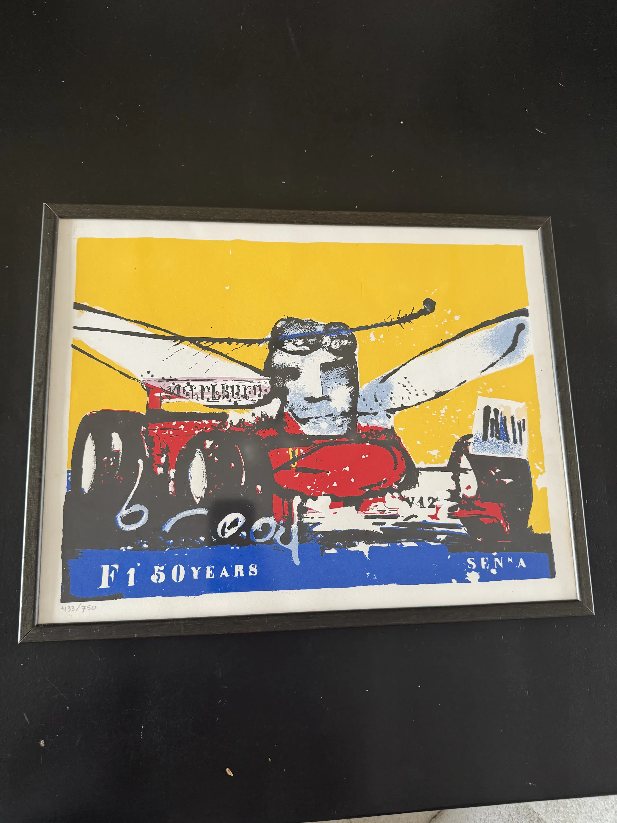 Kleurrijke zeefdruk van Herman Brood voor het 50 jarig bestaan van de formule 1. Ter ere voor autocoureur Senna, door Brood voorzien van vleugels vanwege zijn dodelijk ongeluk.