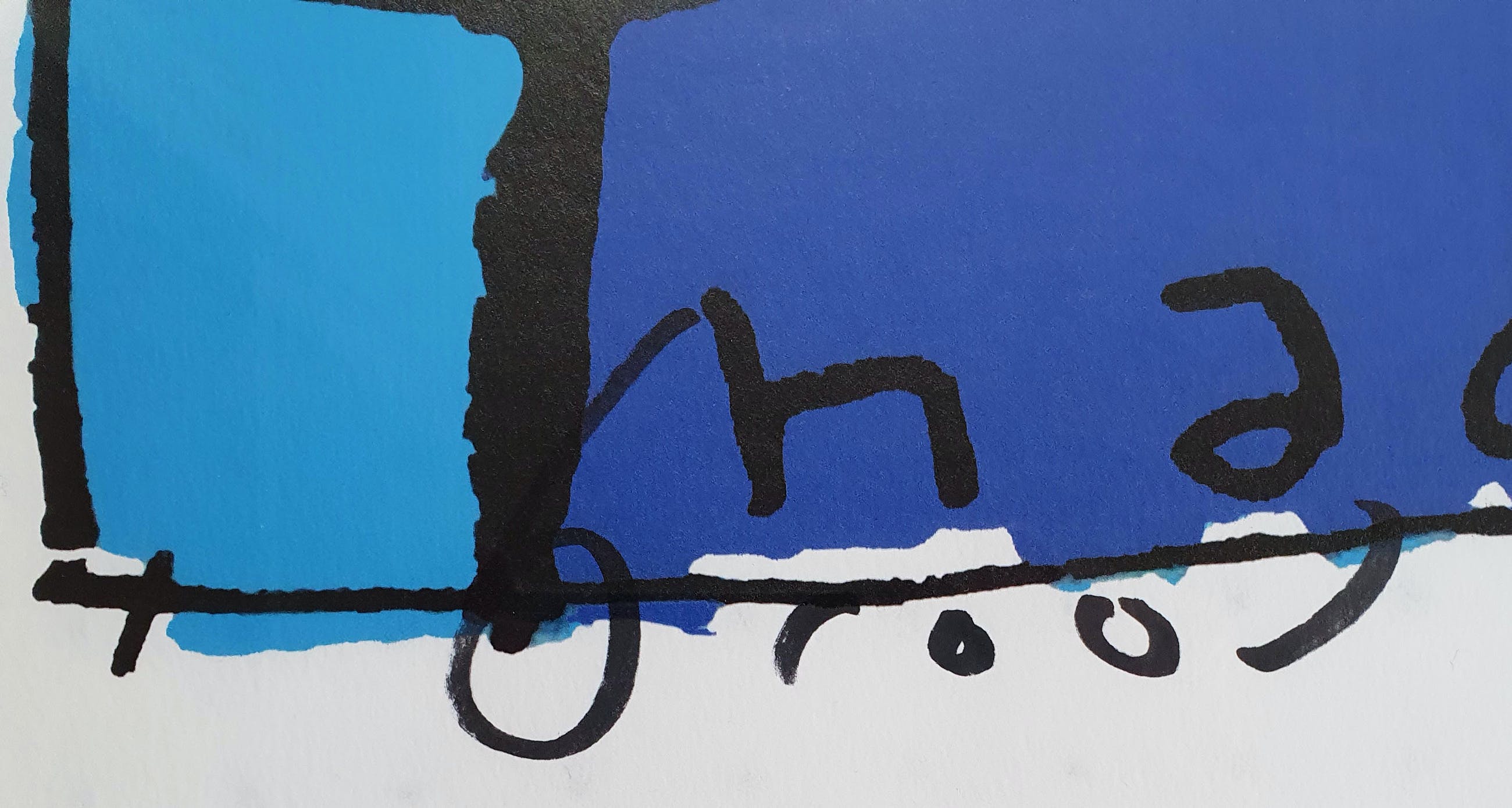 De zeefdruk is professioneel ingelijst in een luxe nieuwe zwarte lijst met zilveren rand, Het werk is voorzien van een certificaat.