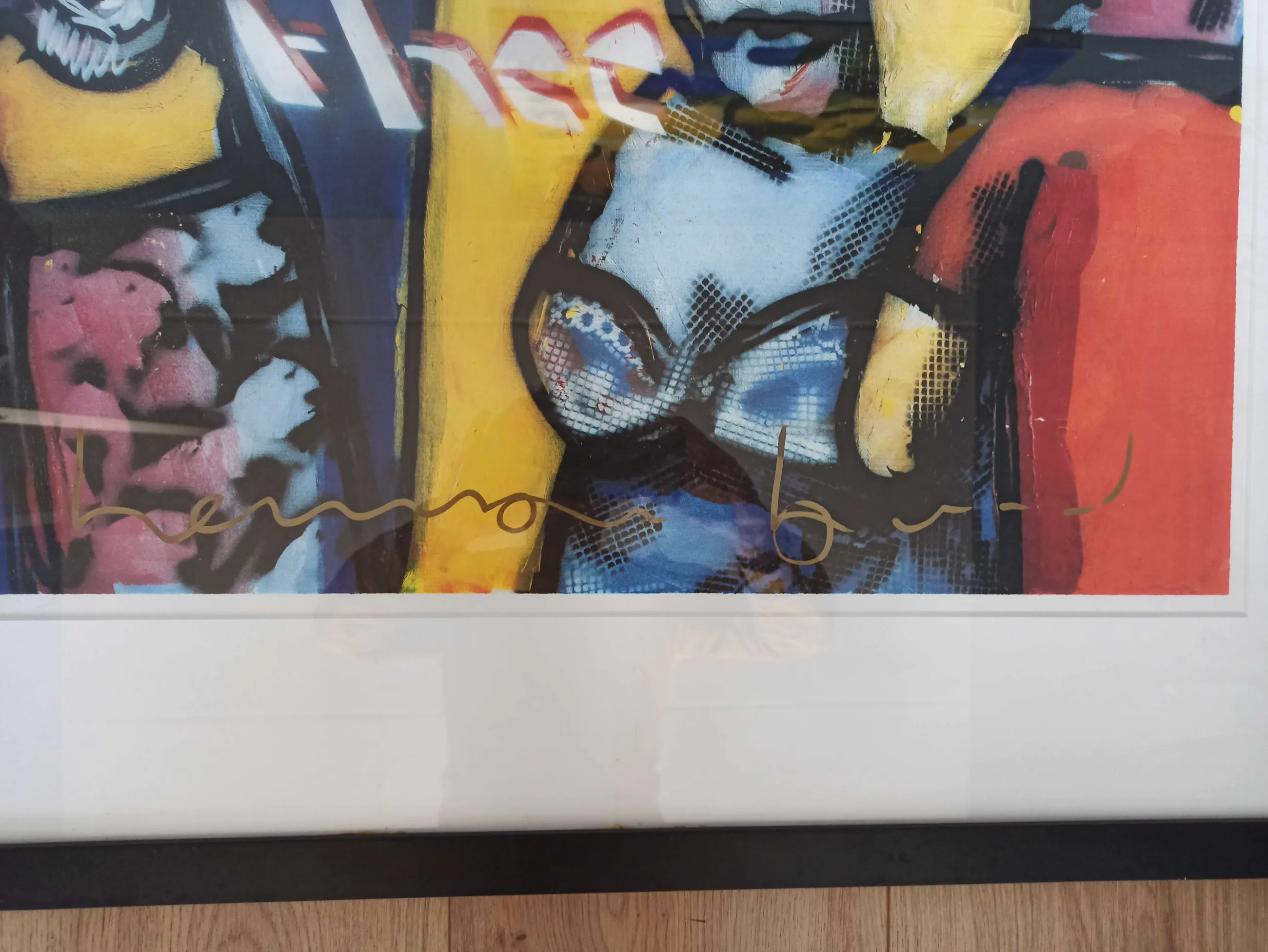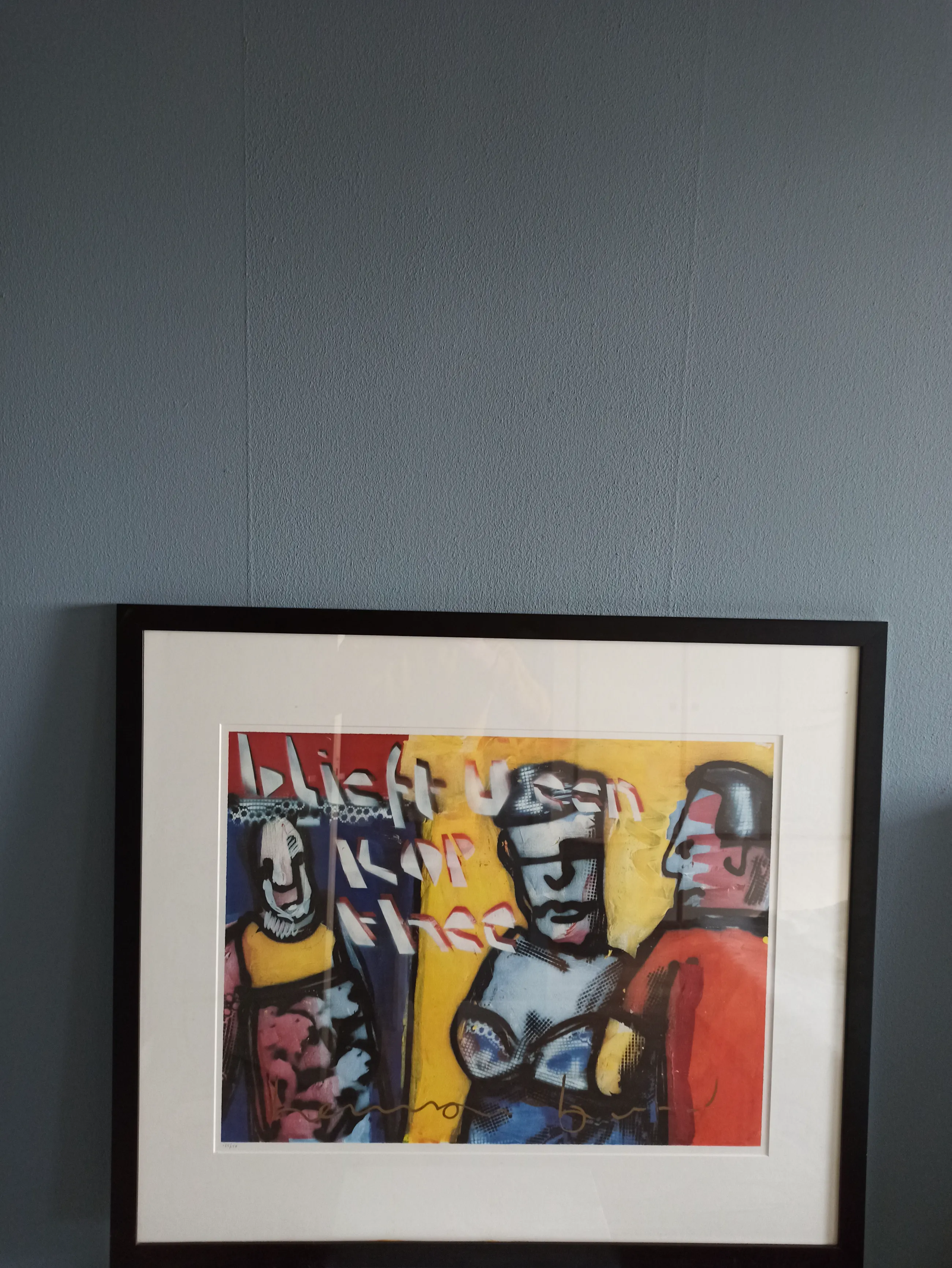 De totale afmetingen zijn 84 x 95 cm en is voorzien van een nette zwarte lijst.