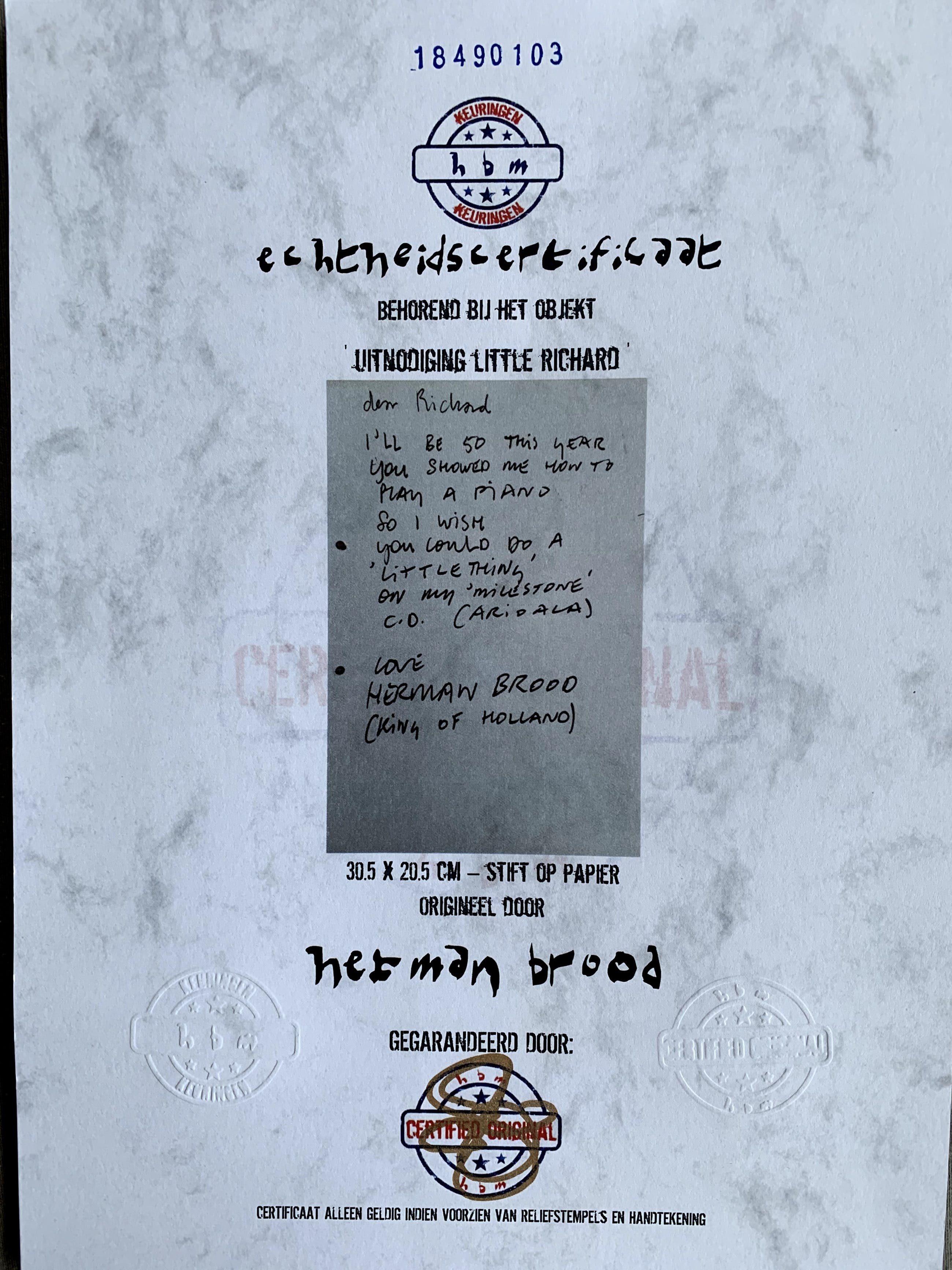 In aanloop naar z'n 50e verjaardag schreef Herman Brood deze uitnodiging aan Little Richard met de vraag op LR mee wil spelen op Hermans jubileum CD. Hij schreef zo'n zelfde uitnodiging ook aan oa Linda, Roos en Jessica. Stift op papier, A4 formaat. Niet gelijst, wel met certificaat van het HBM. Zie foto's. Collectors item voor de echte Broodfan!