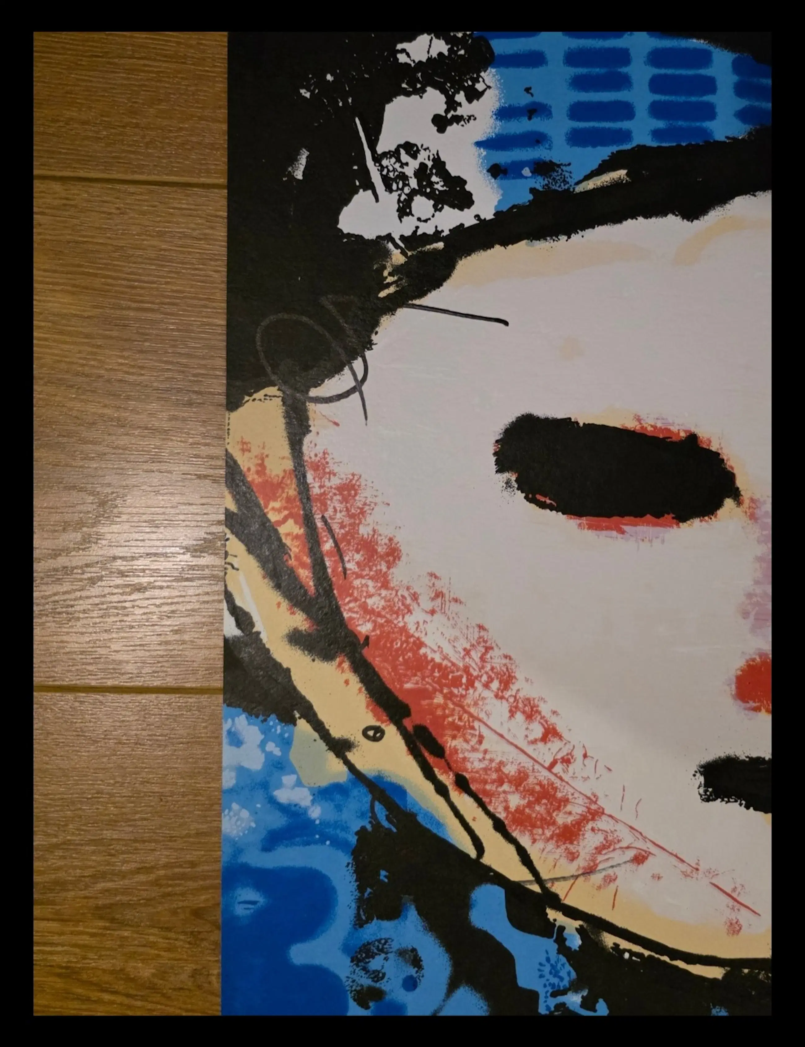 De zeefdruk meet 70x85 cm. en is ooit ingelijst geweest (zie achterkant), vooraanzicht in perfecte staat.