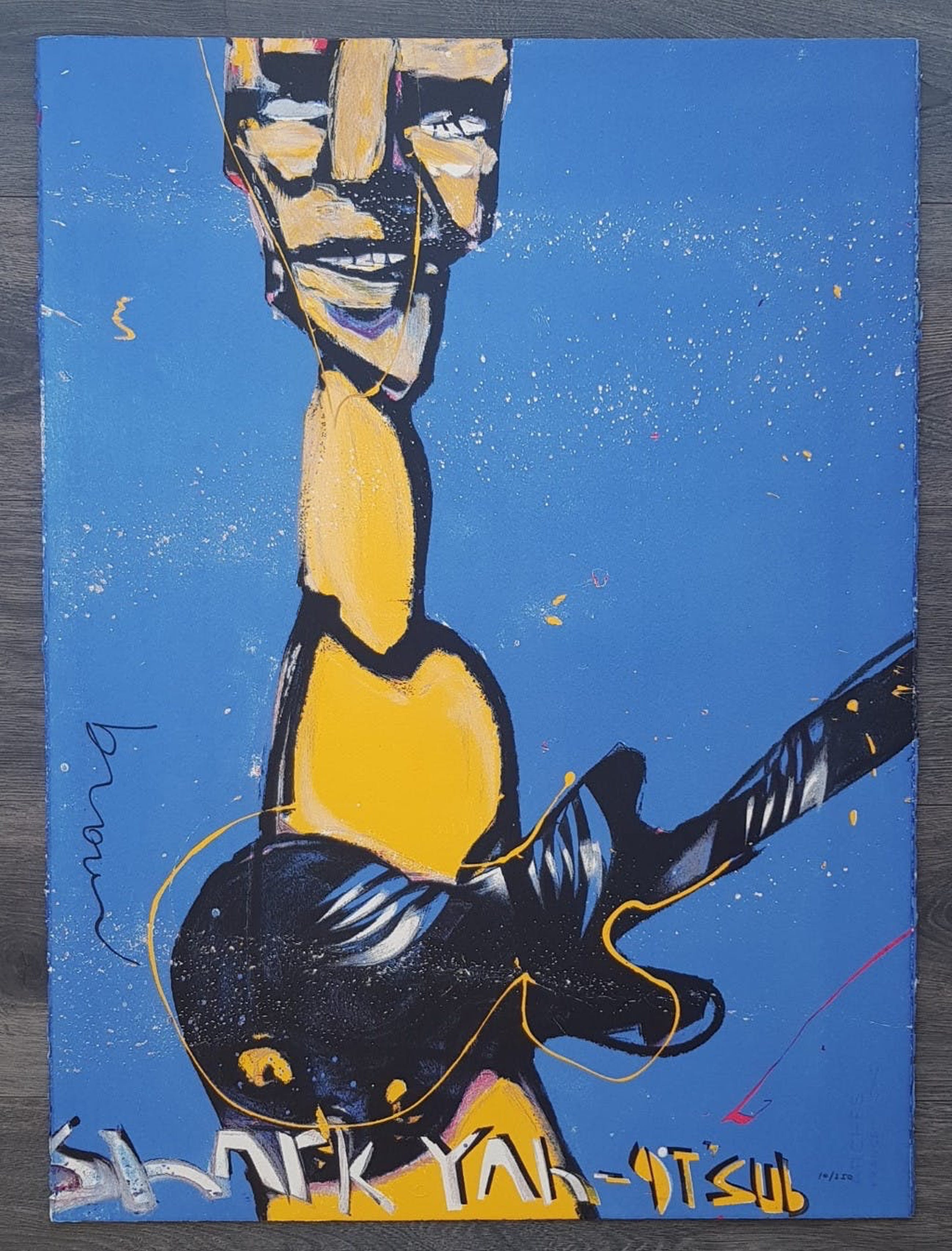 Dit is de complete band, bestaande uit: saxofonist, basgitarist, drummer, gitarist en natuurlijk de zanger. Gedrukt op geschept Arches papier met watermerk en uiteraard allemaal gesigneerd met marker.
