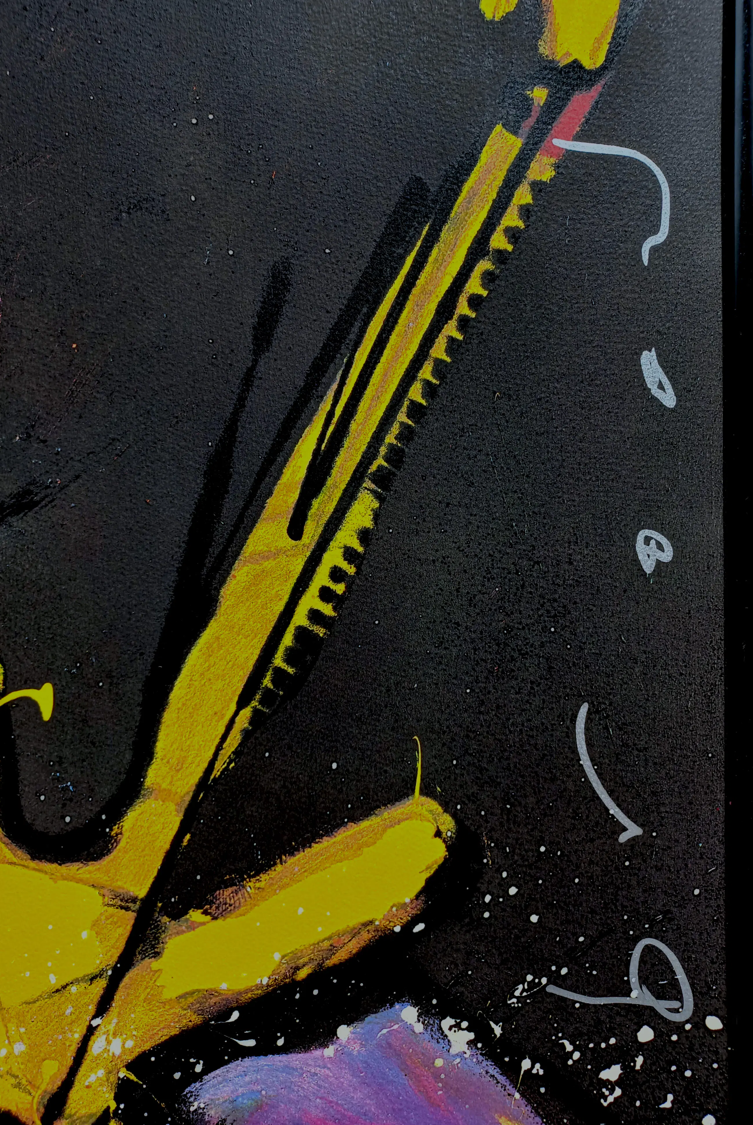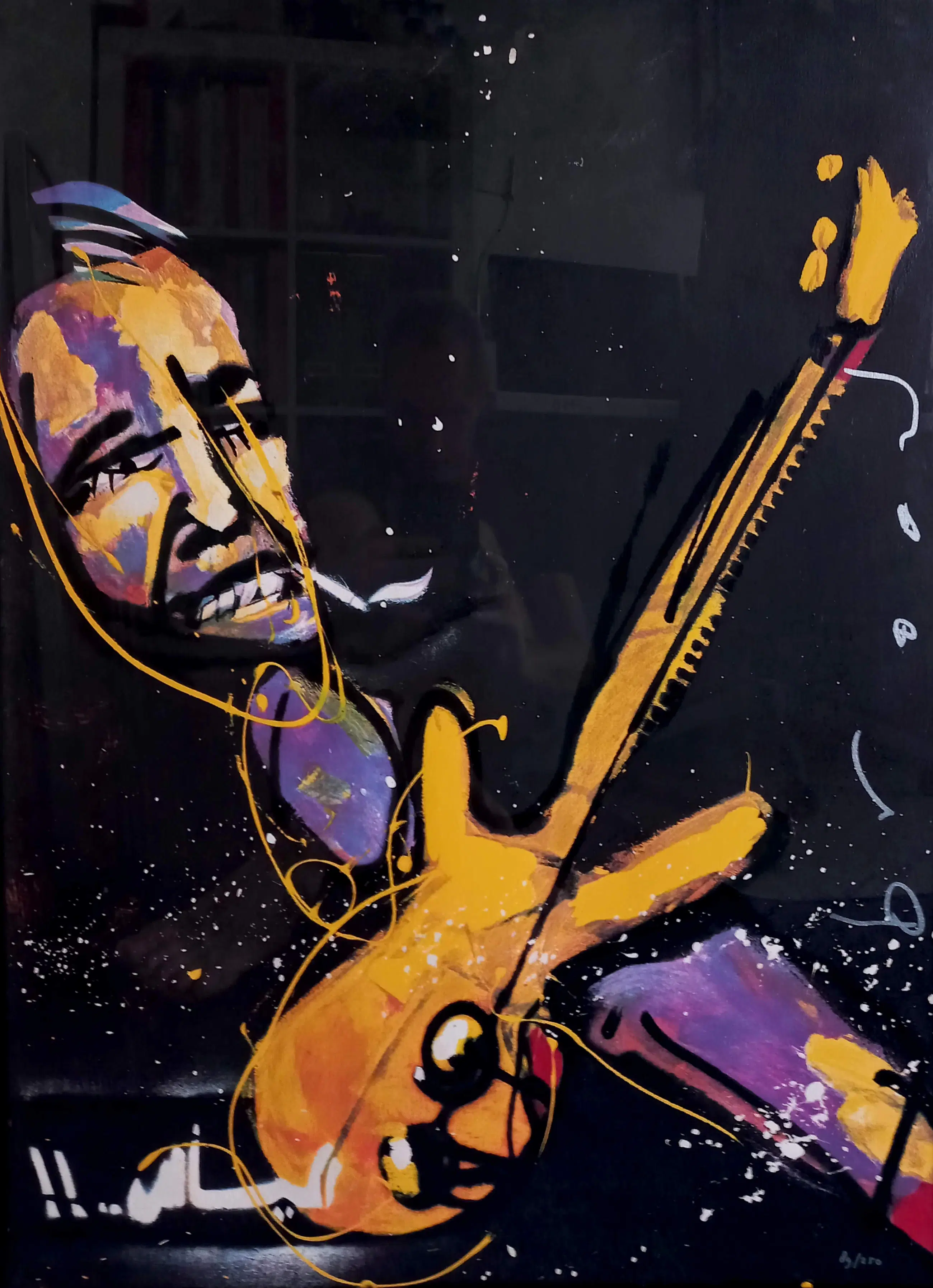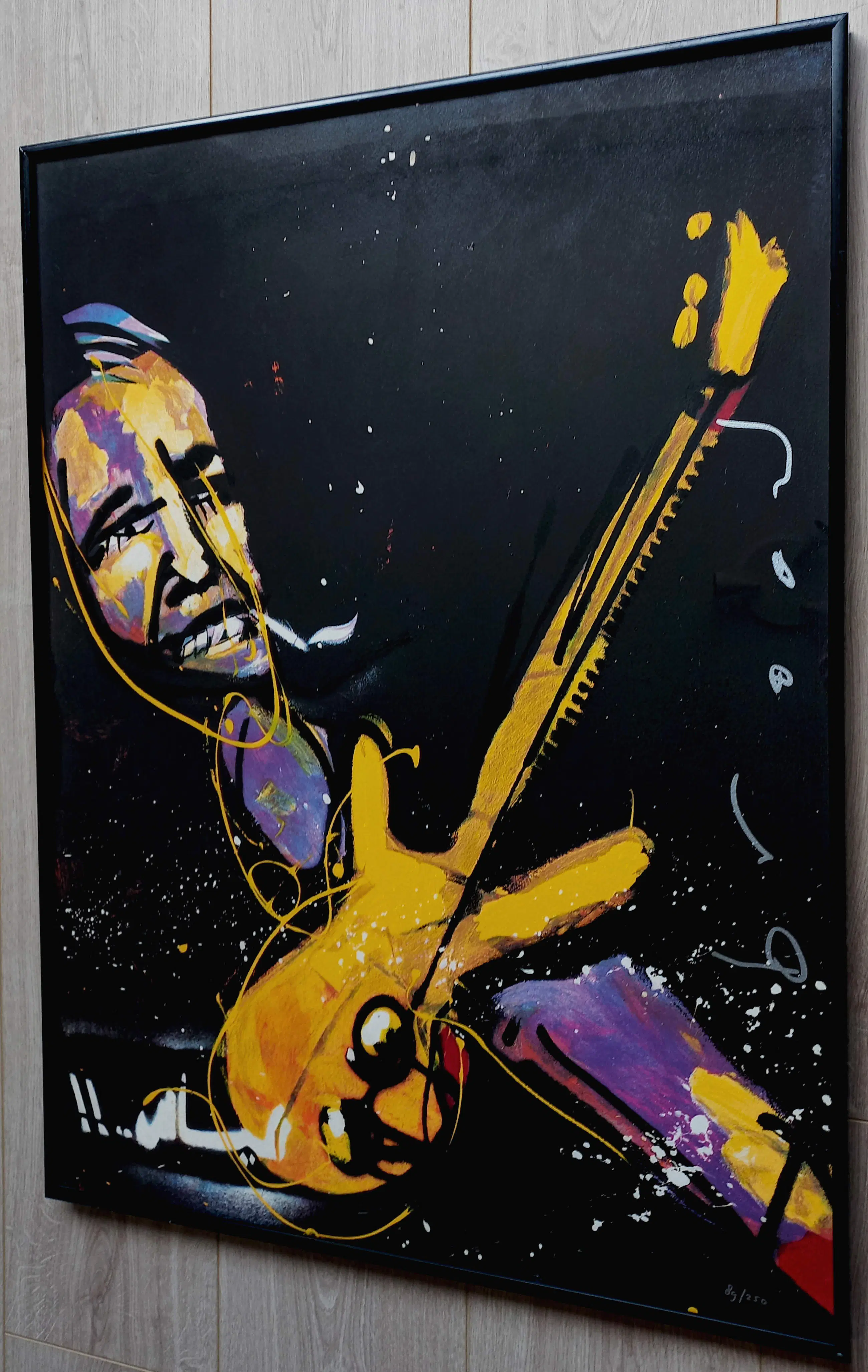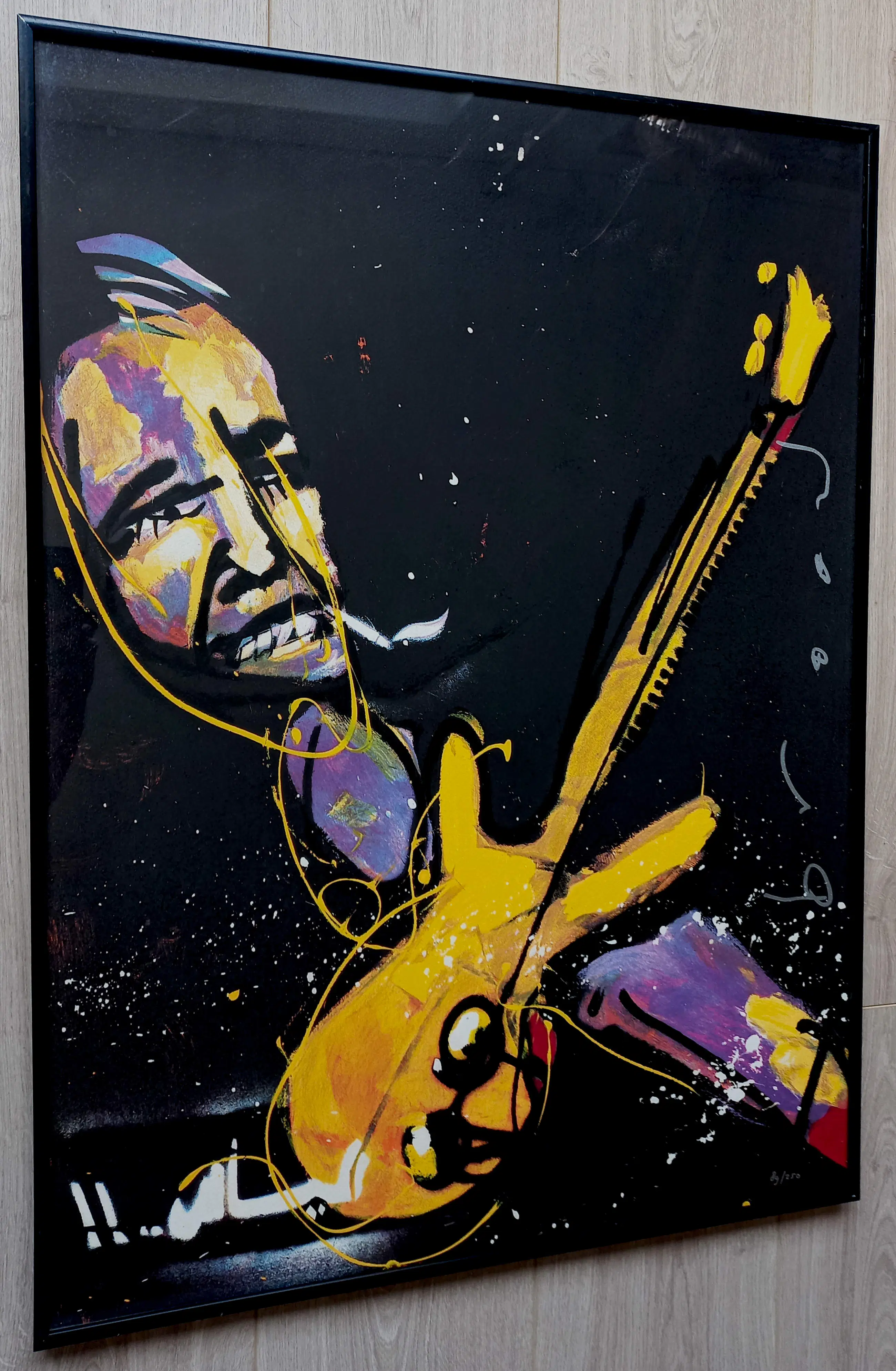 Prachtig werk uit de serie ‘The Band’, in 1990 uitgegeven door de Free Record Shop. Zeefdruk op Arches papier, met zilverkleurige marker gesigneerd en genummerd (89/250), het volledige blad in de originele wissellijst, achter glas. In zeer goede conditie.