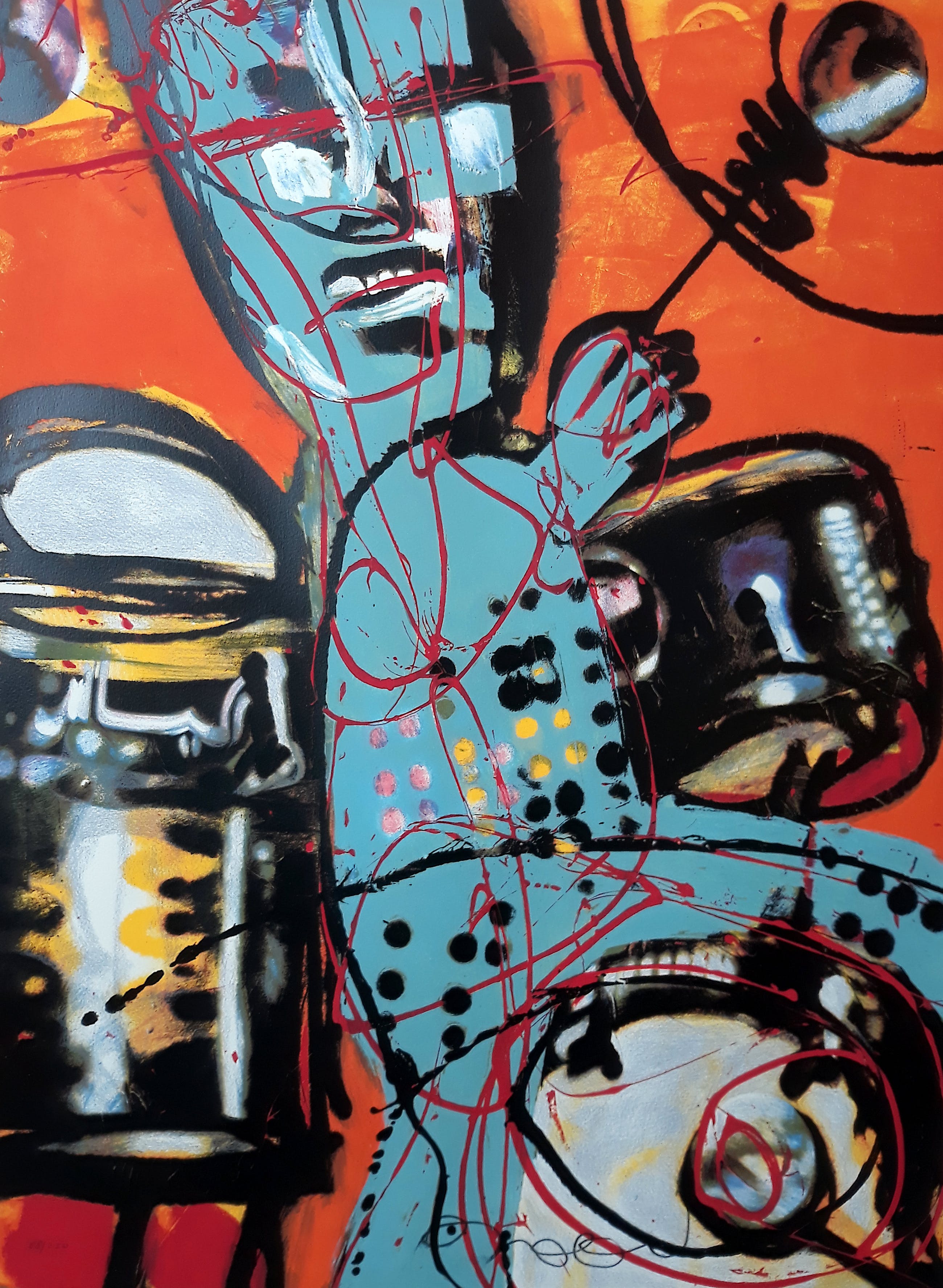 Prachtig werk uit de serie ‘The Band’, in 1990 uitgegeven door de Free Record Shop. Zeefdruk op Arches papier, met marker gesigneerd en genummerd (88/250). In uitstekende conditie.