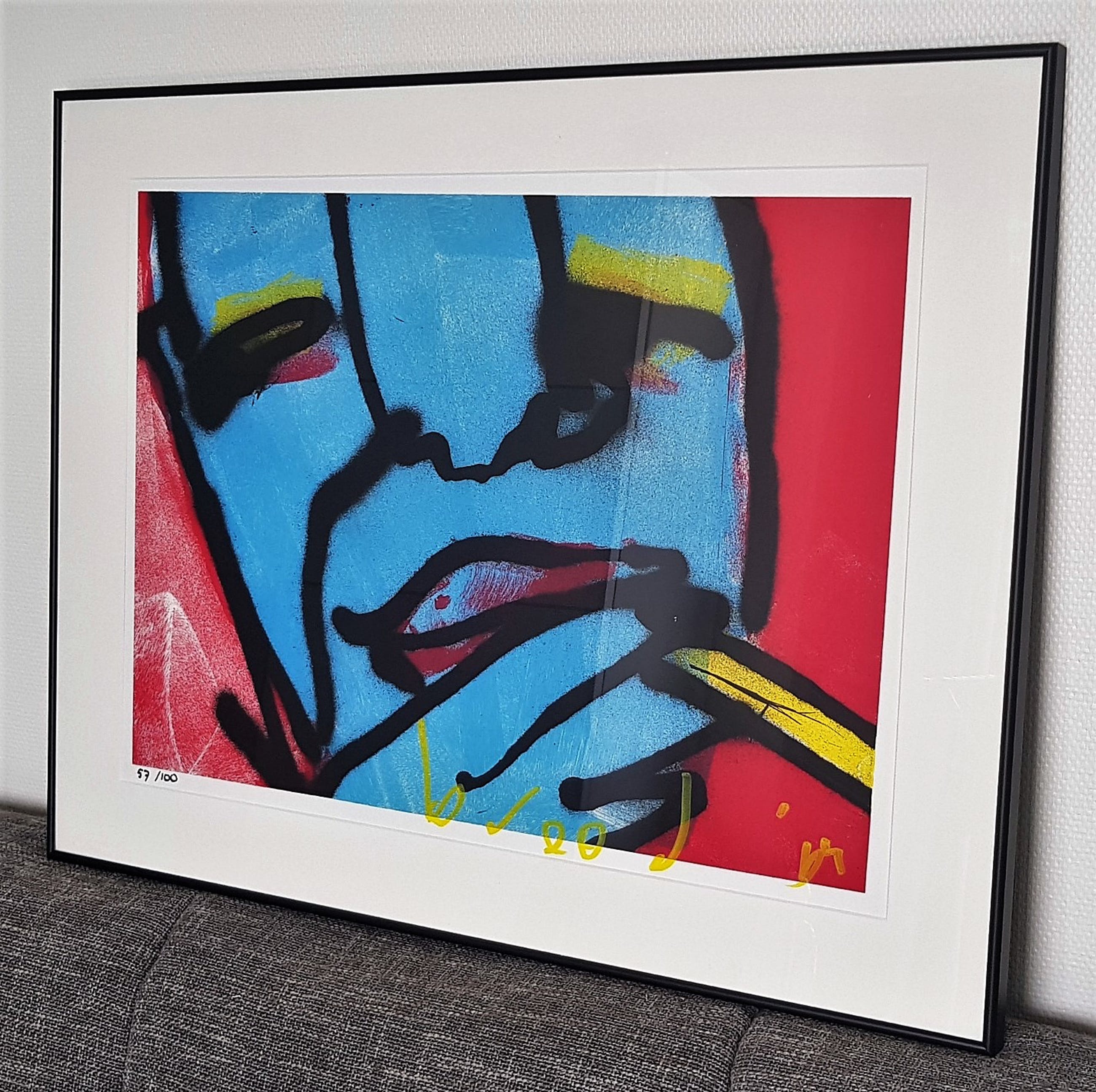 Het werk is uiteraard handgesigneerd met marker en goed ingelijst in een smalle metalen frame met passe partout.