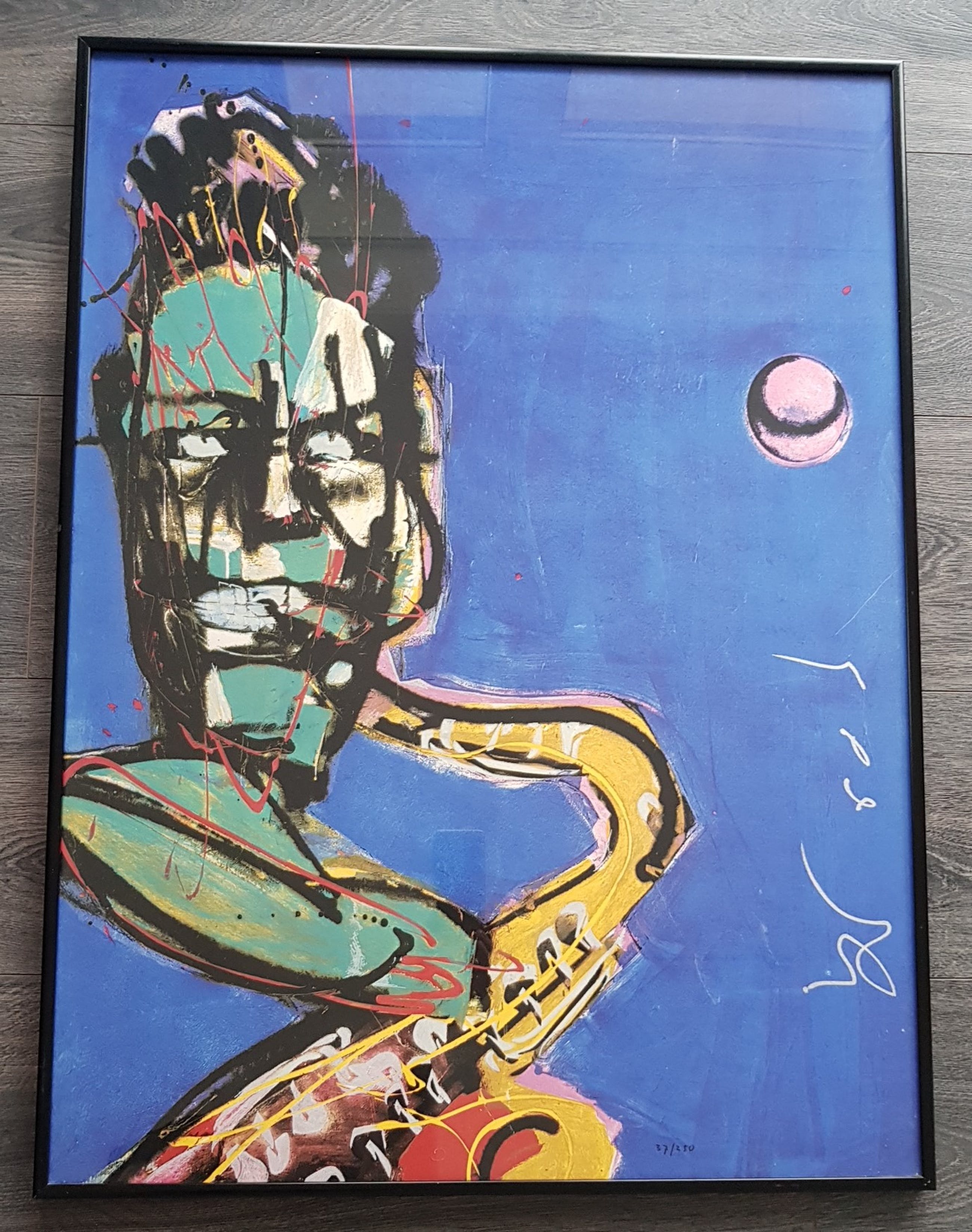 Dit is de saxofonist, gedrukt op geschept Arches papier en uiteraard gesigneerd met marker.