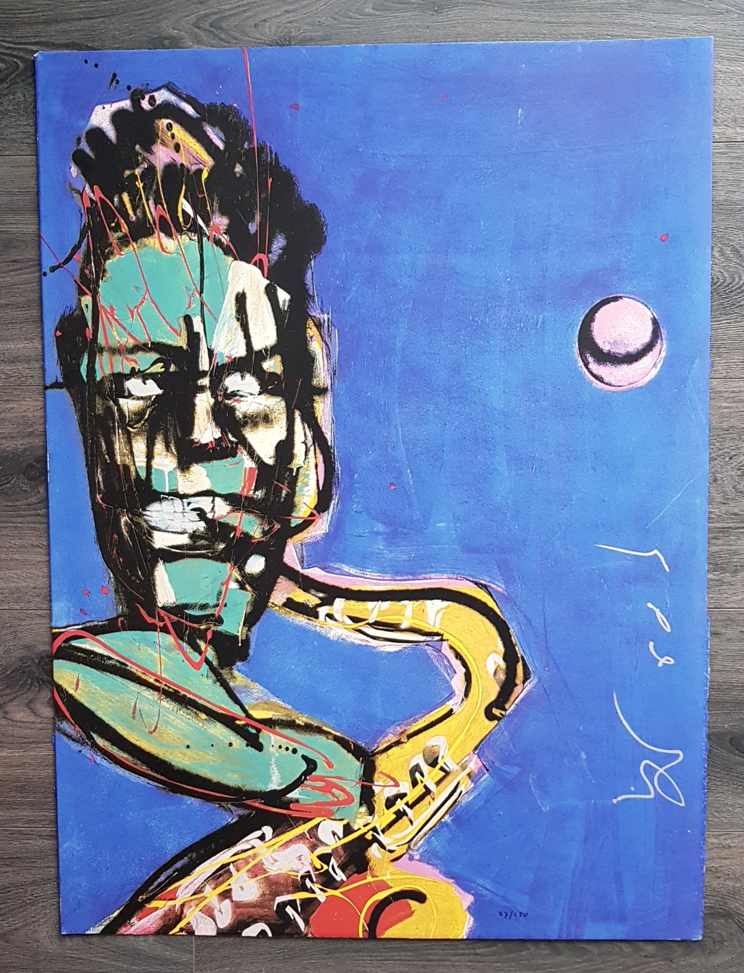 Dit is de saxofonist, gedrukt op geschept Arches papier en uiteraard gesigneerd met marker.