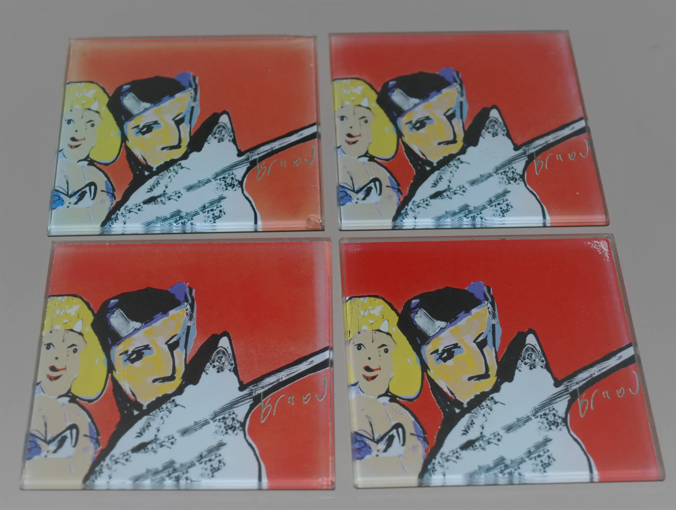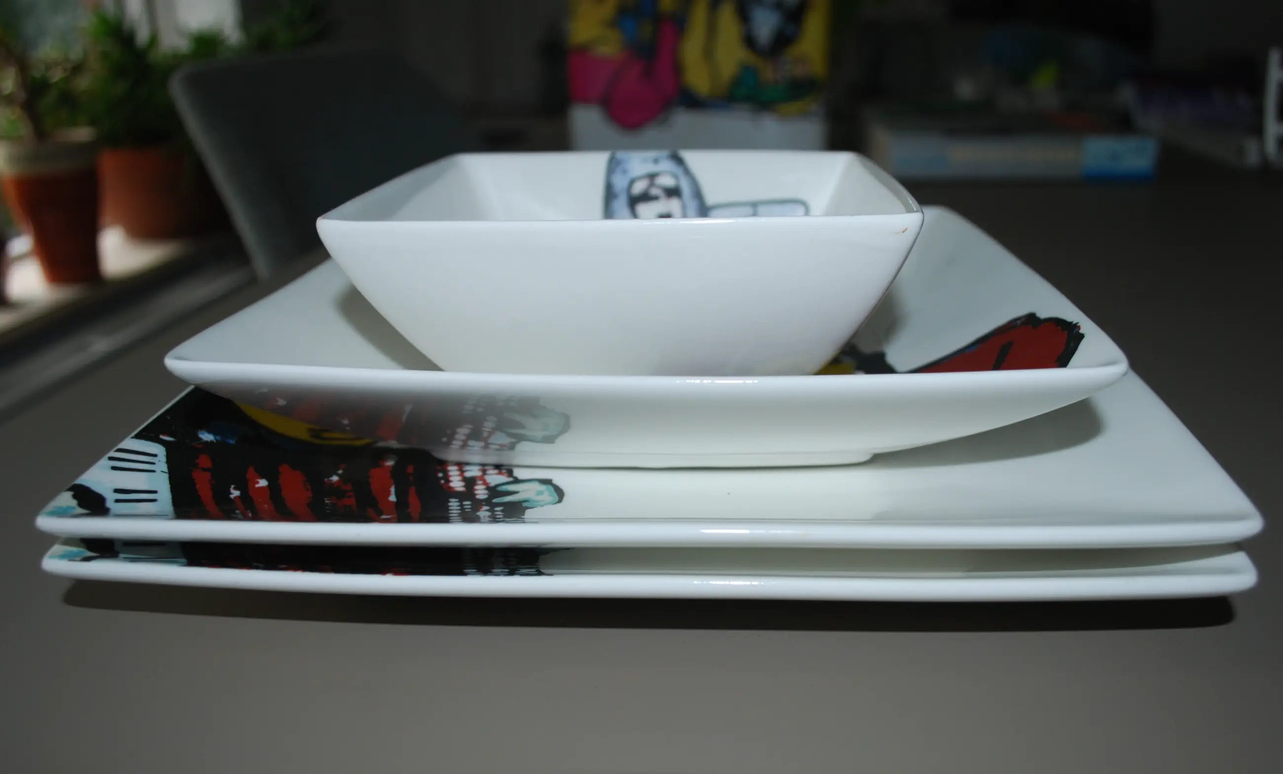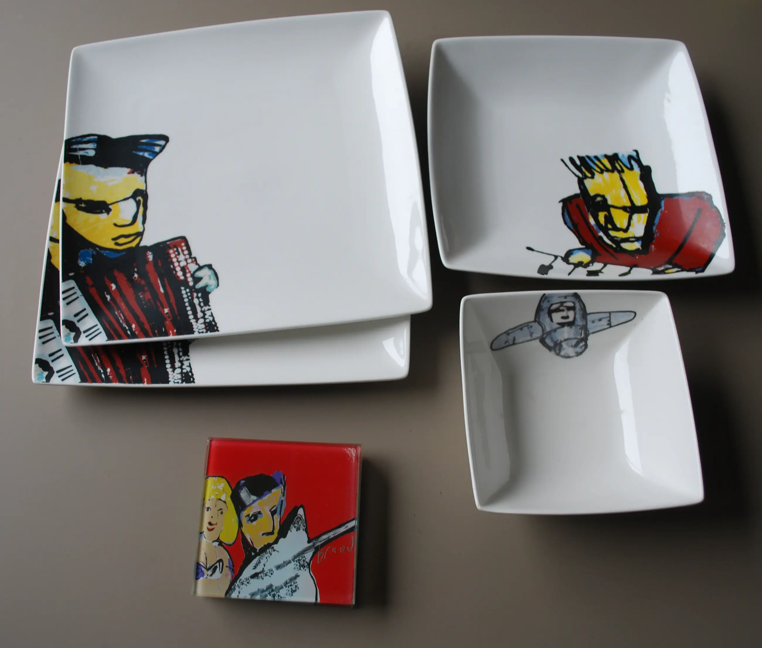 2 poseleinen borden (breed 25 cm) Goede gebruikte staat. Een enkel licht krasje. 2 porseleinen bakjes (breed 21 en 14 cm) Goede gebruikte staat. 4 glazen onderzetters. Gebruikte staat, enkele schilfers en krasjes.