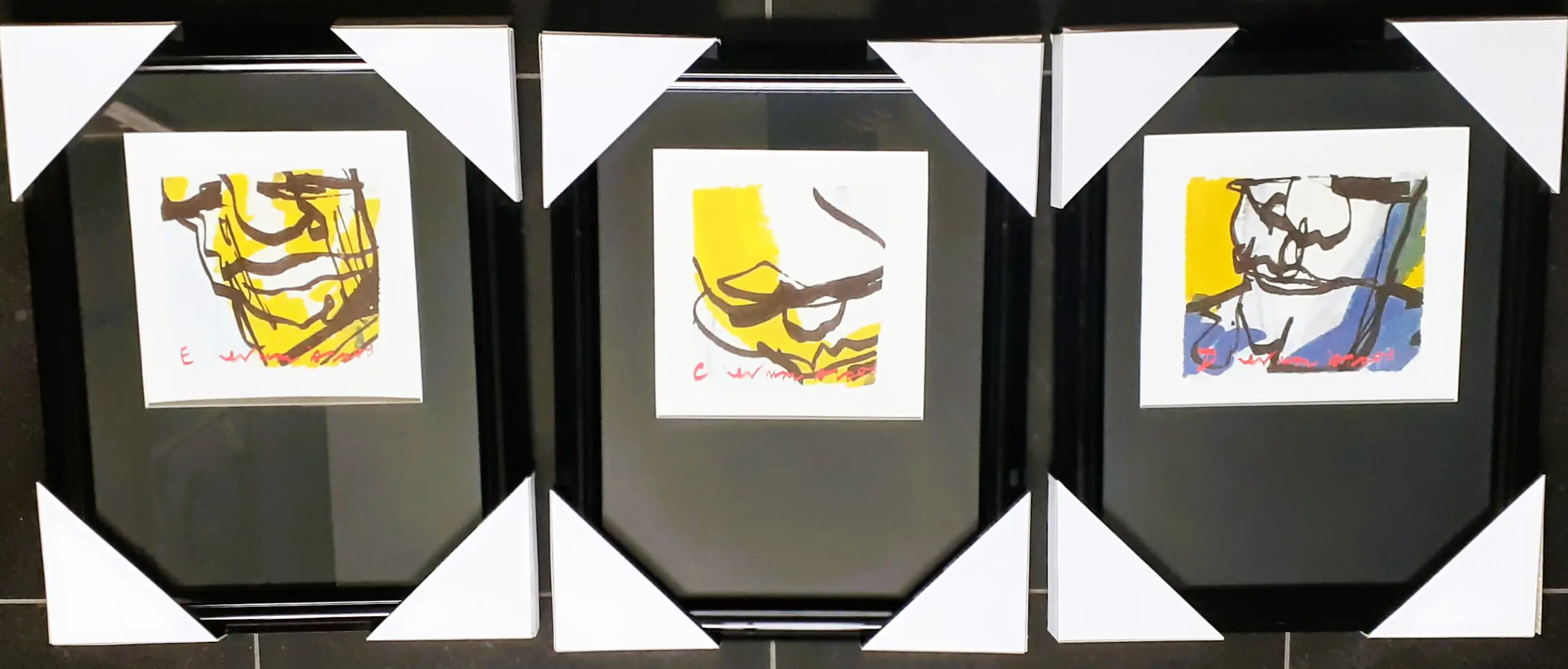 Een schitterend drieluik, prachtig gelijst met zwarte lijst en passepartout. In nieuwstaat.