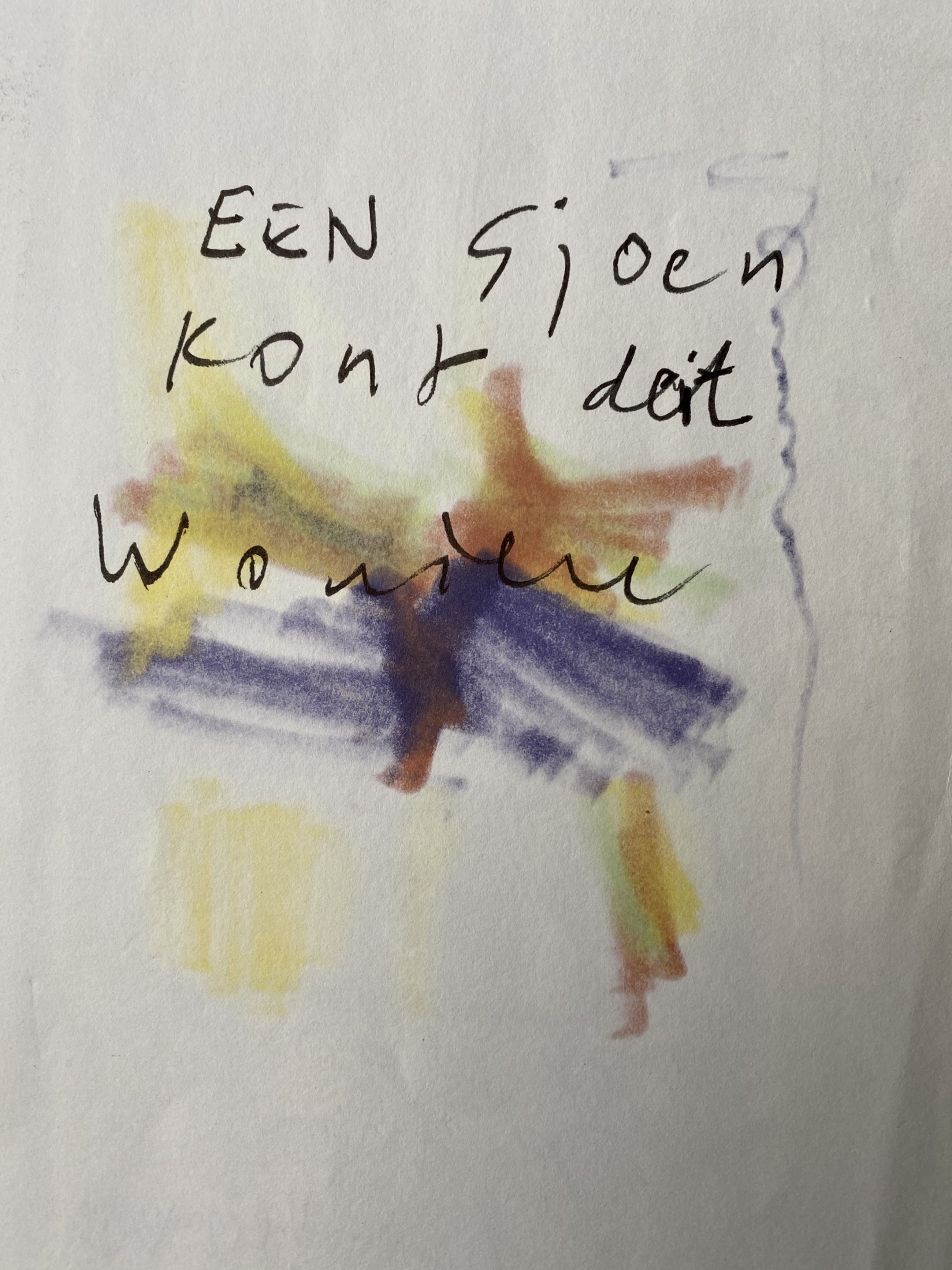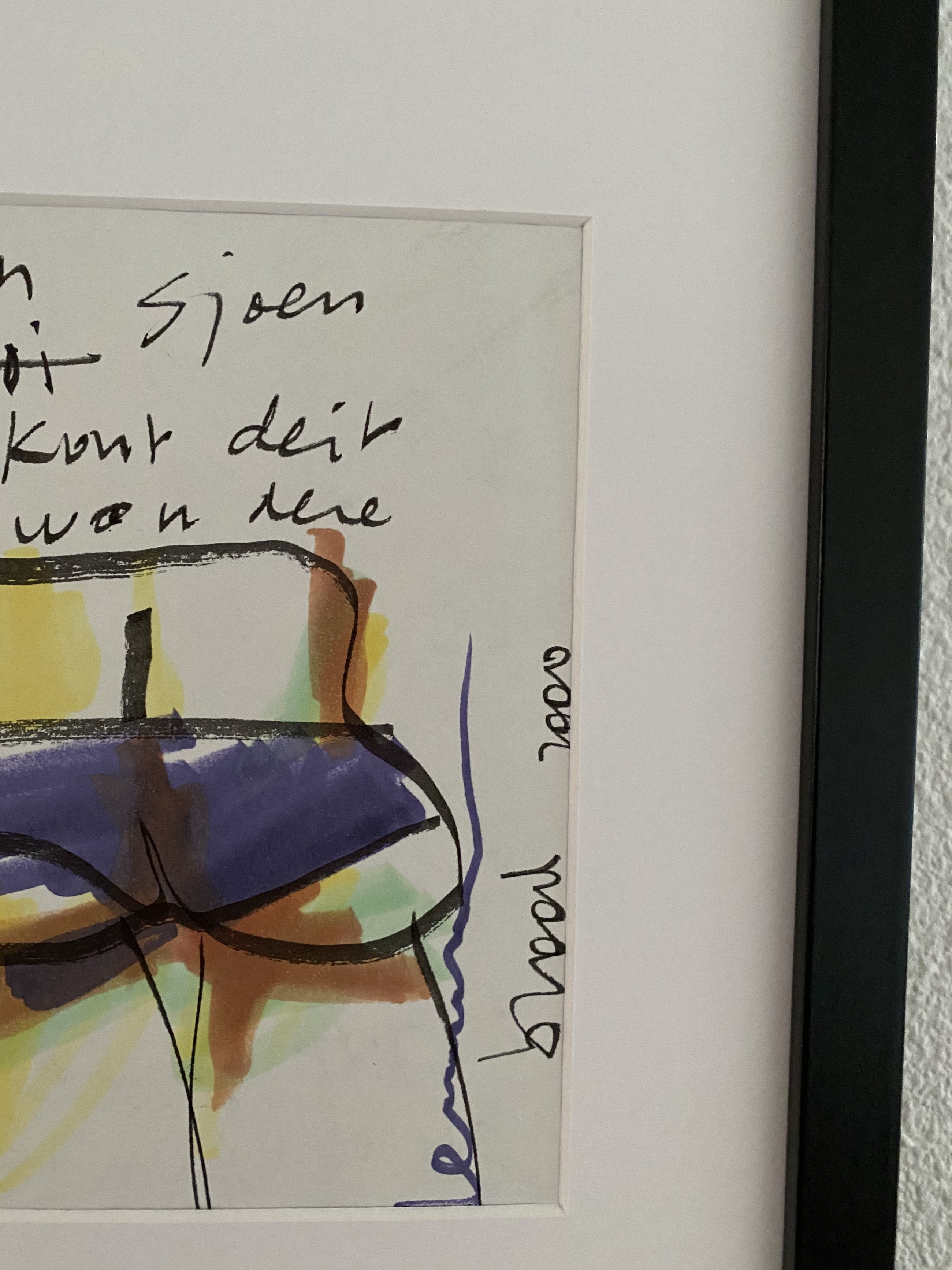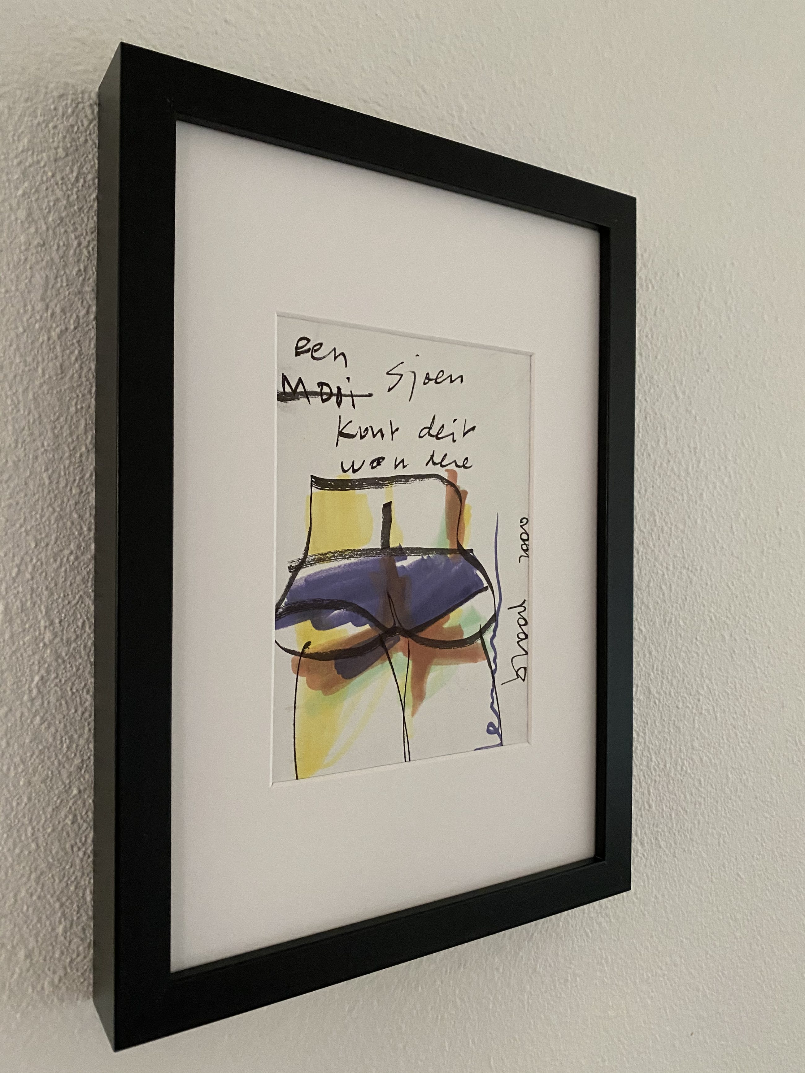 Getekend door Herman Brood in de periode dat hij in Limburg (Maastricht) verbleef. Vandaar de Limburgse tekst “ een sjoen kont deit wondere”, een mooie kont doet wonderen. De tekening zit in een eenvoudige maar prima/nieuwe lijst.