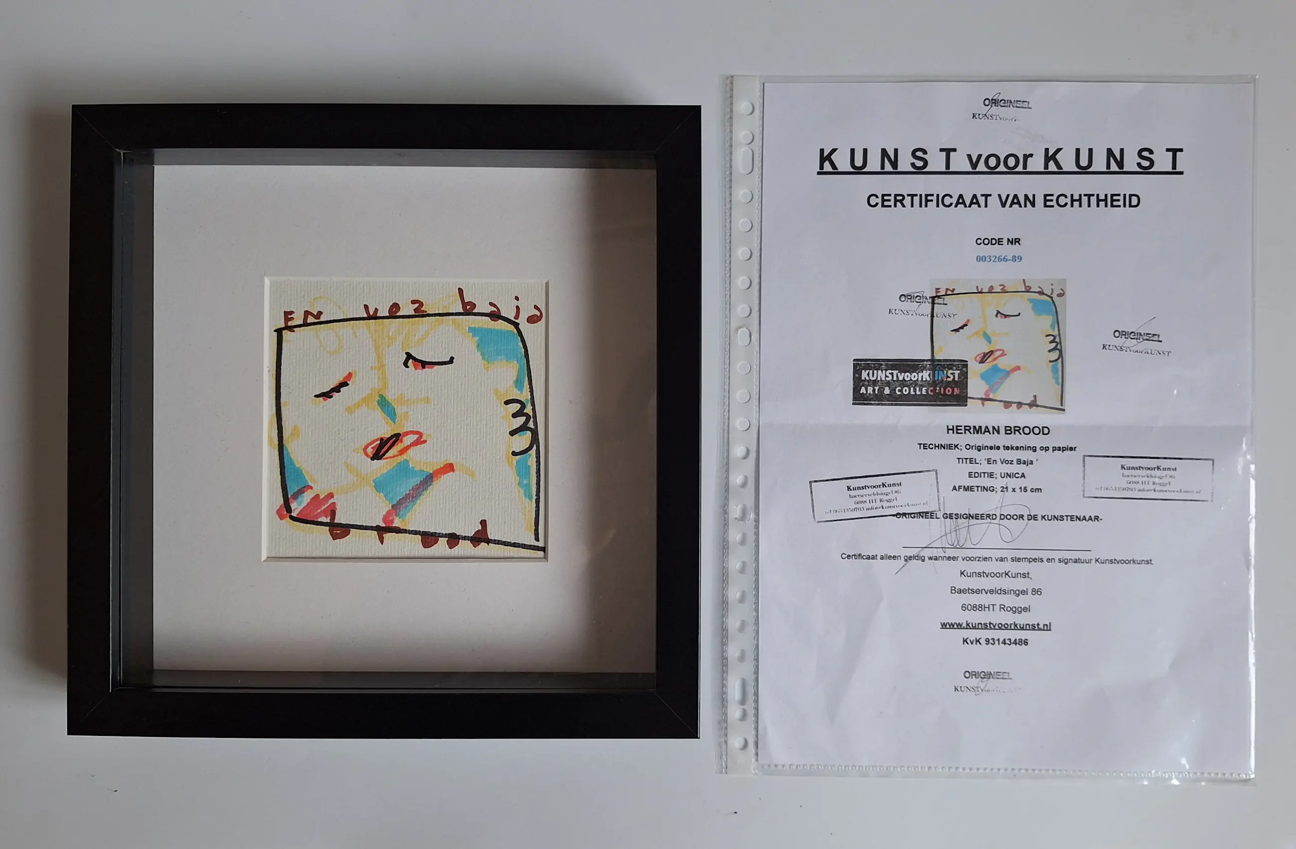 Een uniek stuk! Ingelijste orginele tekening van Herman Brood met echtheid certificaat. Titel van het kunstwerk; En Voz Baja Getekent met stift op papier. Leuk voor een echte Herman Brood fan.
