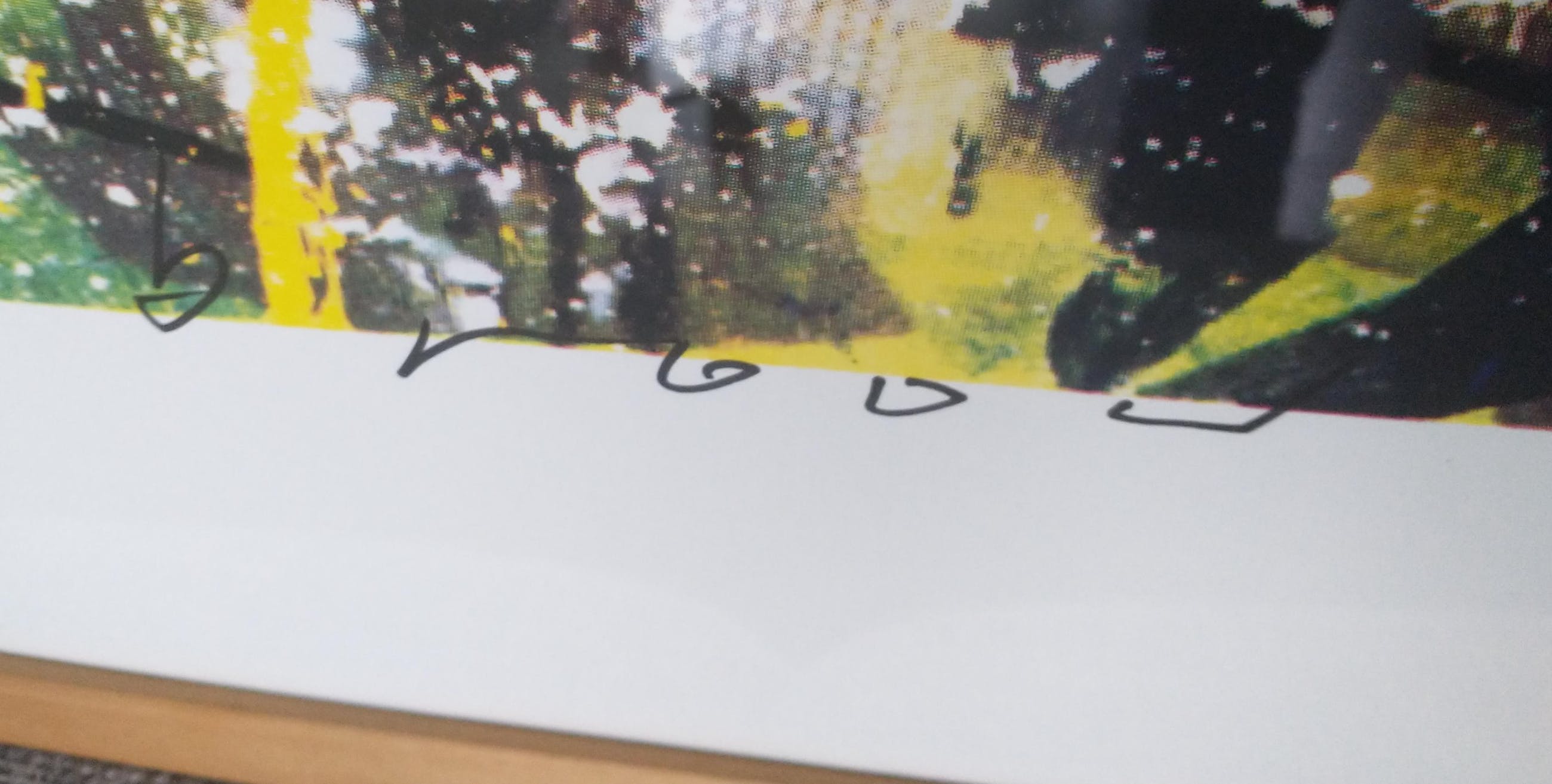 Het werk zit in de oorspronkelijke houten lijst en is uiteraard met marker gesigneerd.