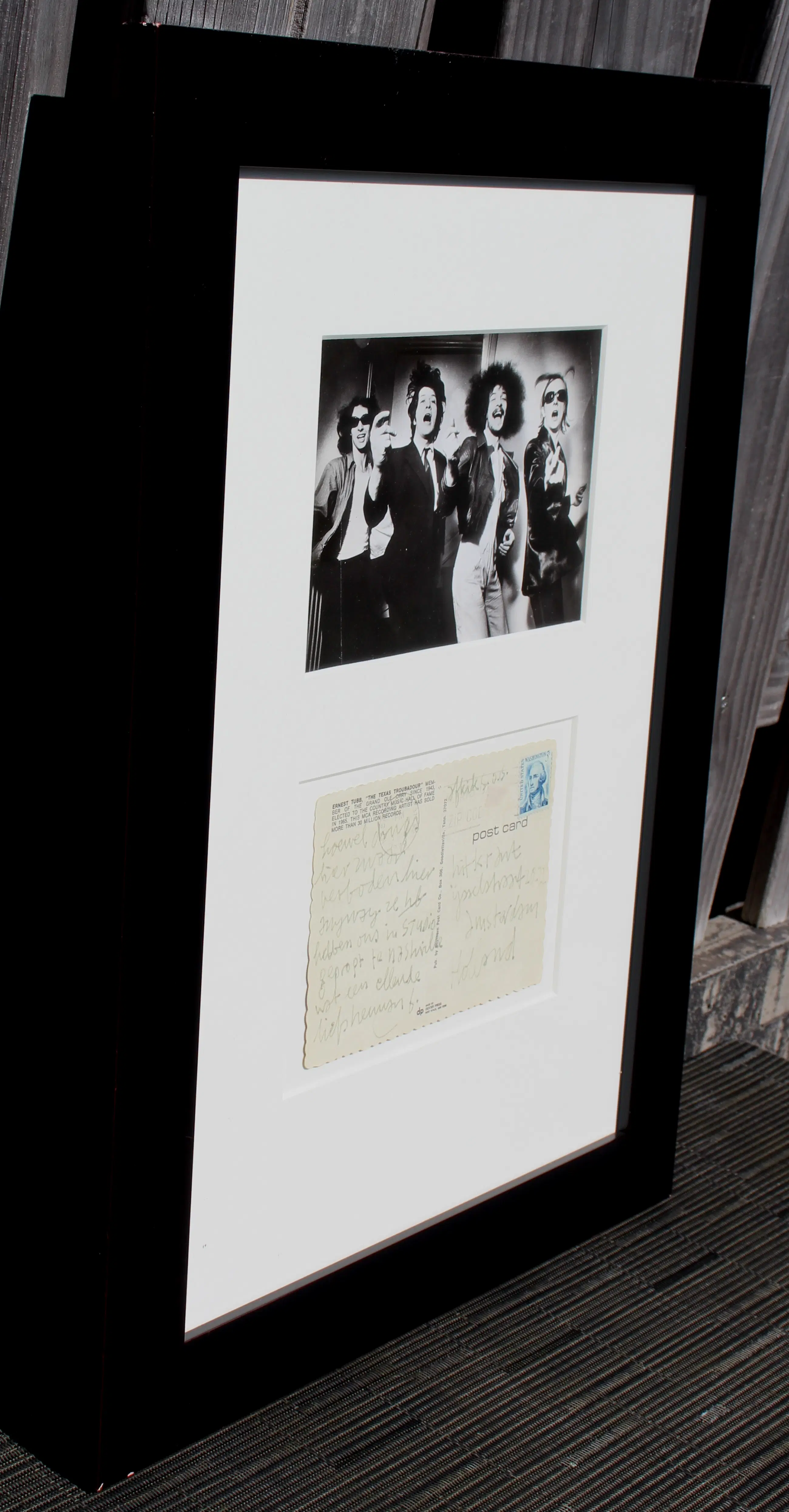 Ingelijste foto, met gesigneerde ansichtkaart, van Herman Brood. De kaart is ooit gestuurd aan de hitkrant. Tekst: Hoewel drugs hier zwaar verboden hier. Anyway ze (heb) hebben ons in studio gepropt te Nashville. Wat een ellende. Liefs Herman B. Afmetingen incl lijst: H48 x b36cm. Afmetingen voorstelling: H27 x b17cm.