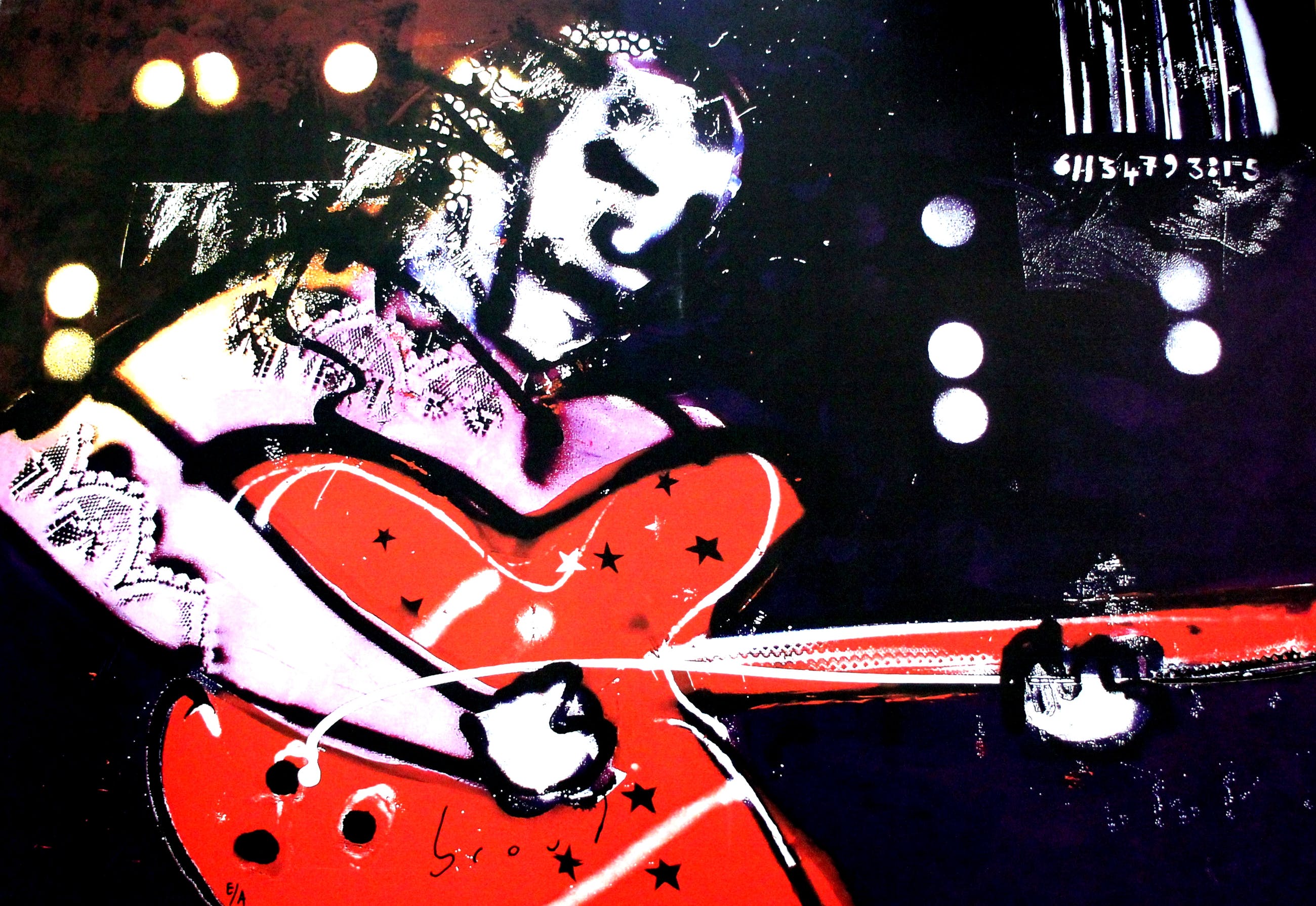 Grote zeefdruk op linnen van Herman Brood. Jaar: 2001. Nummer: E.A. Het werk is met zwarte marker gesigneerd door de kunstenaar. Dee zeefdruk was vlak voor de dood van Herman gereed gekomen. Er zijn er maar enkele met de hand gesigneerd. Dit is er één van. Bevestiging hiervan ,per mail, van HB-M (voormalig Herman Brood Museum) is beschikbaar.