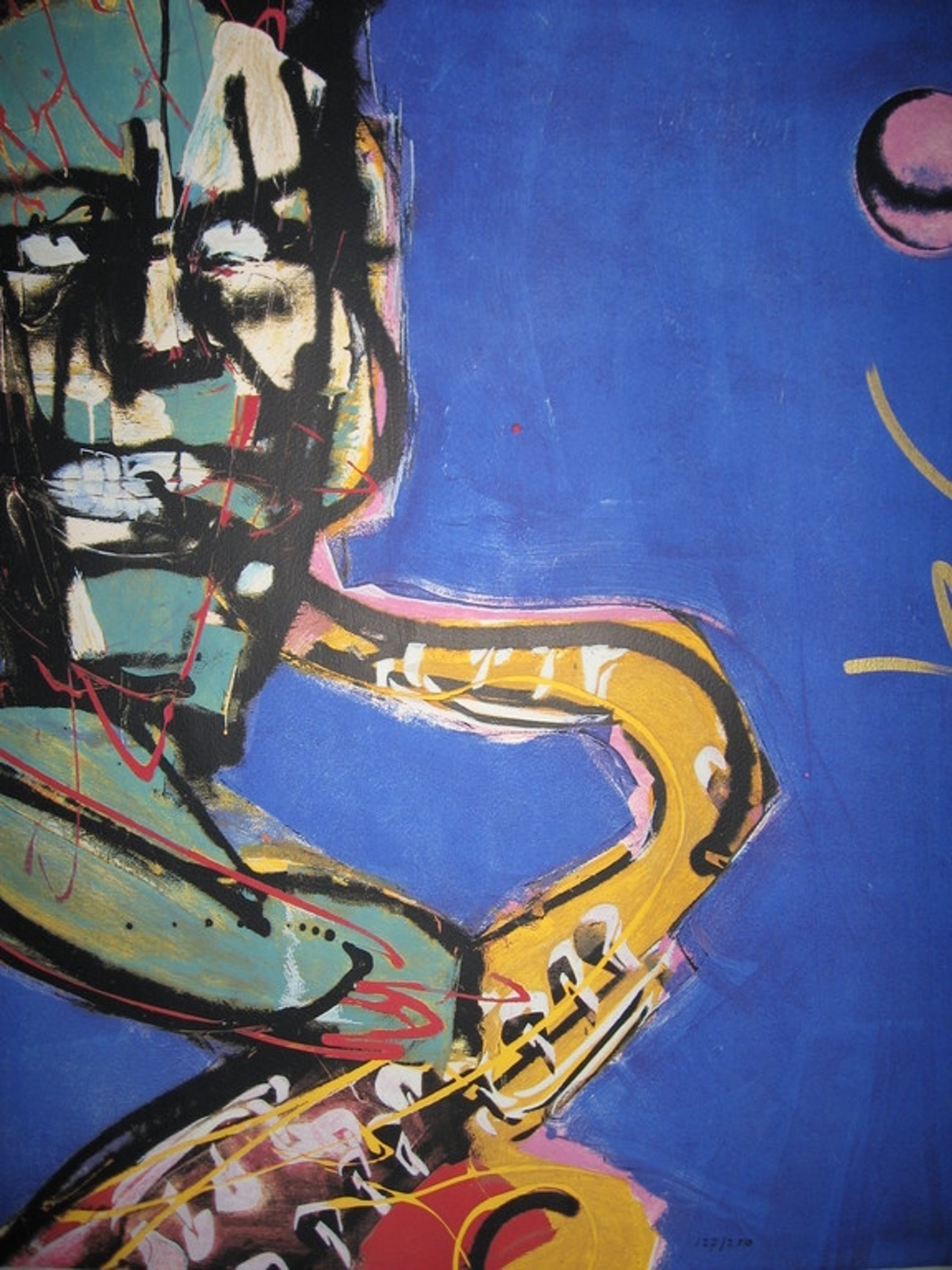 Prachtige kleurrijke zeefdruk van Brood uit de serie: 'De band'. Gedrukt op Arches papier.