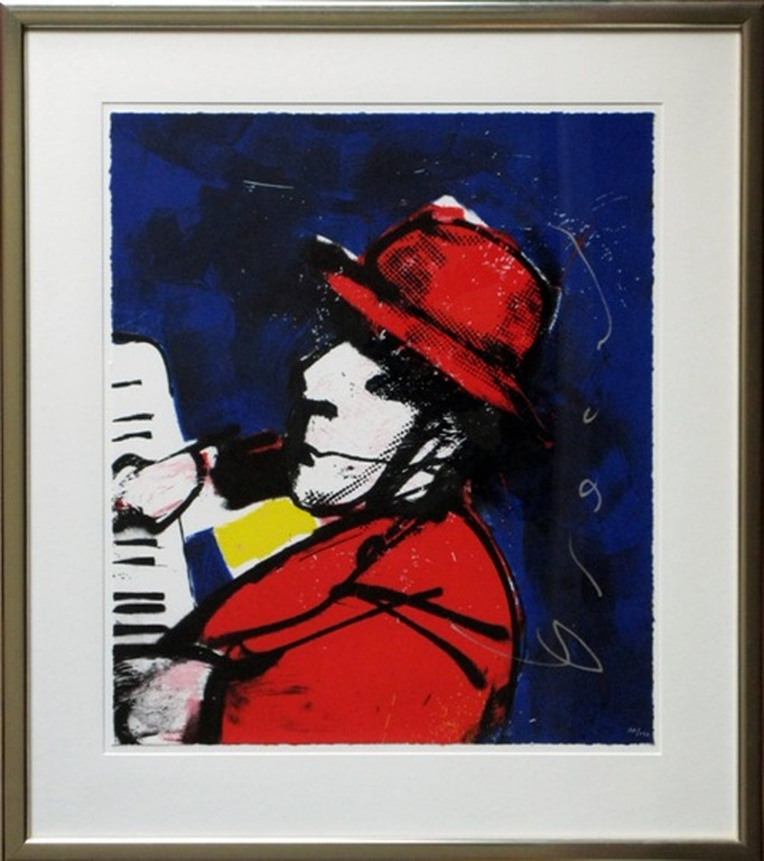 Betreft een groot modern werk, zeefdruk op zuurvrije achtergrond, geframed met zuurvrije witte passepartout. het geheel is ingelijst in een luxe massieve houten (zilverkleurige) omlijsting, compleet met ophangsysteem. Het werk verkeert in perfecte staat en kan zondermeer direct worden opgehangen.