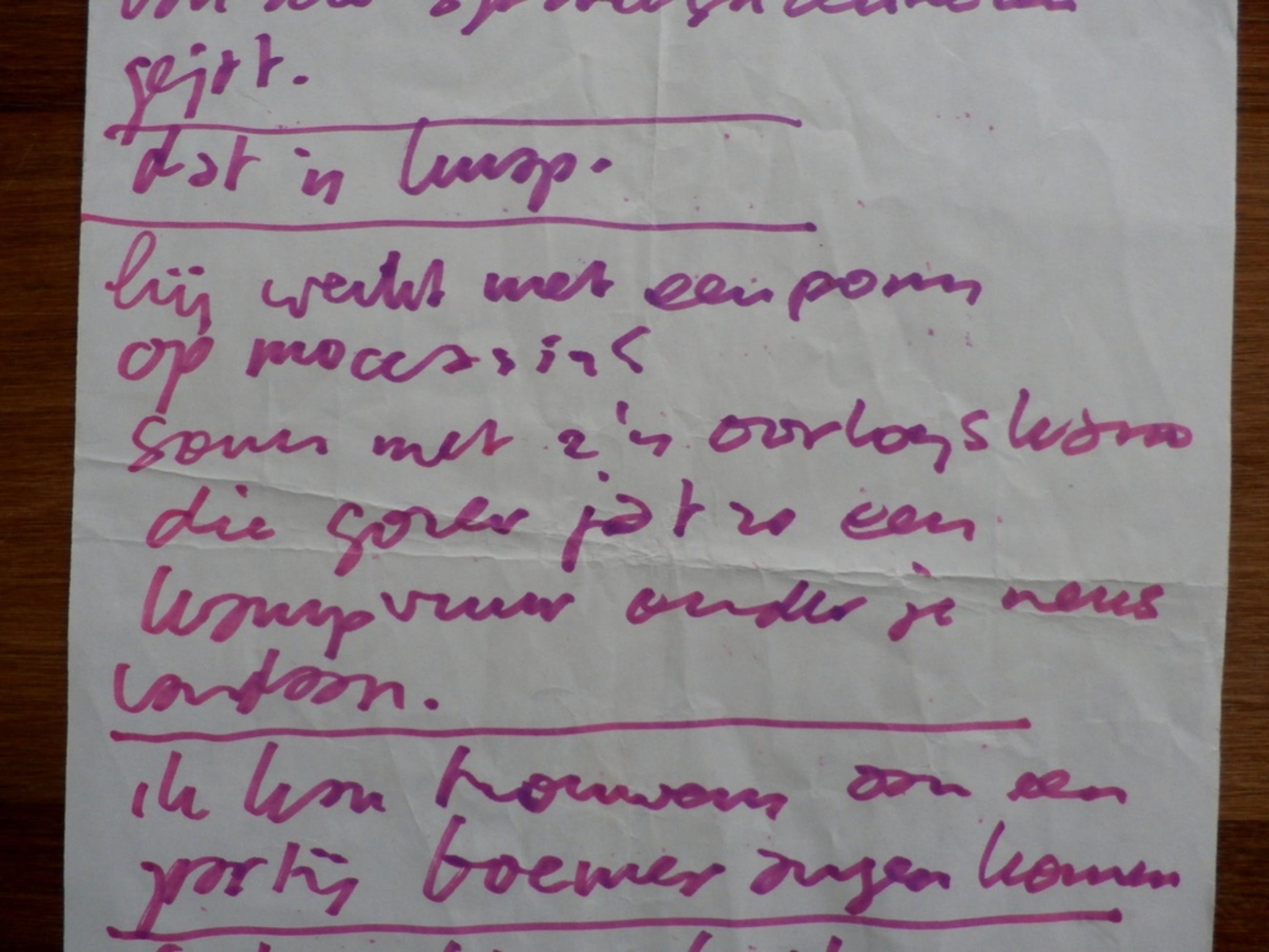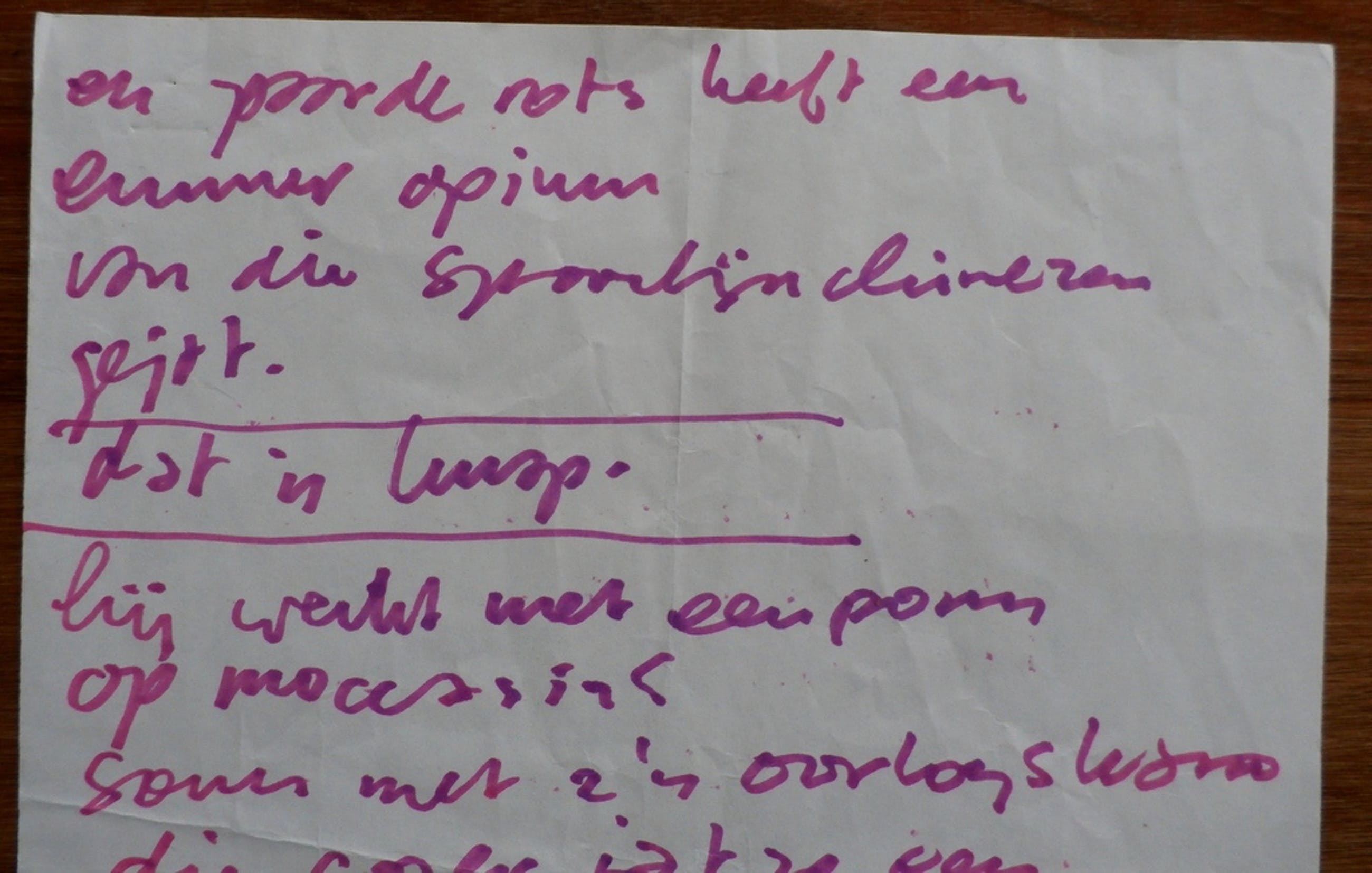 Handgeschreven tekst van Herman Brood op A4 papier. Afmetingen: H30 x b 21 cm.