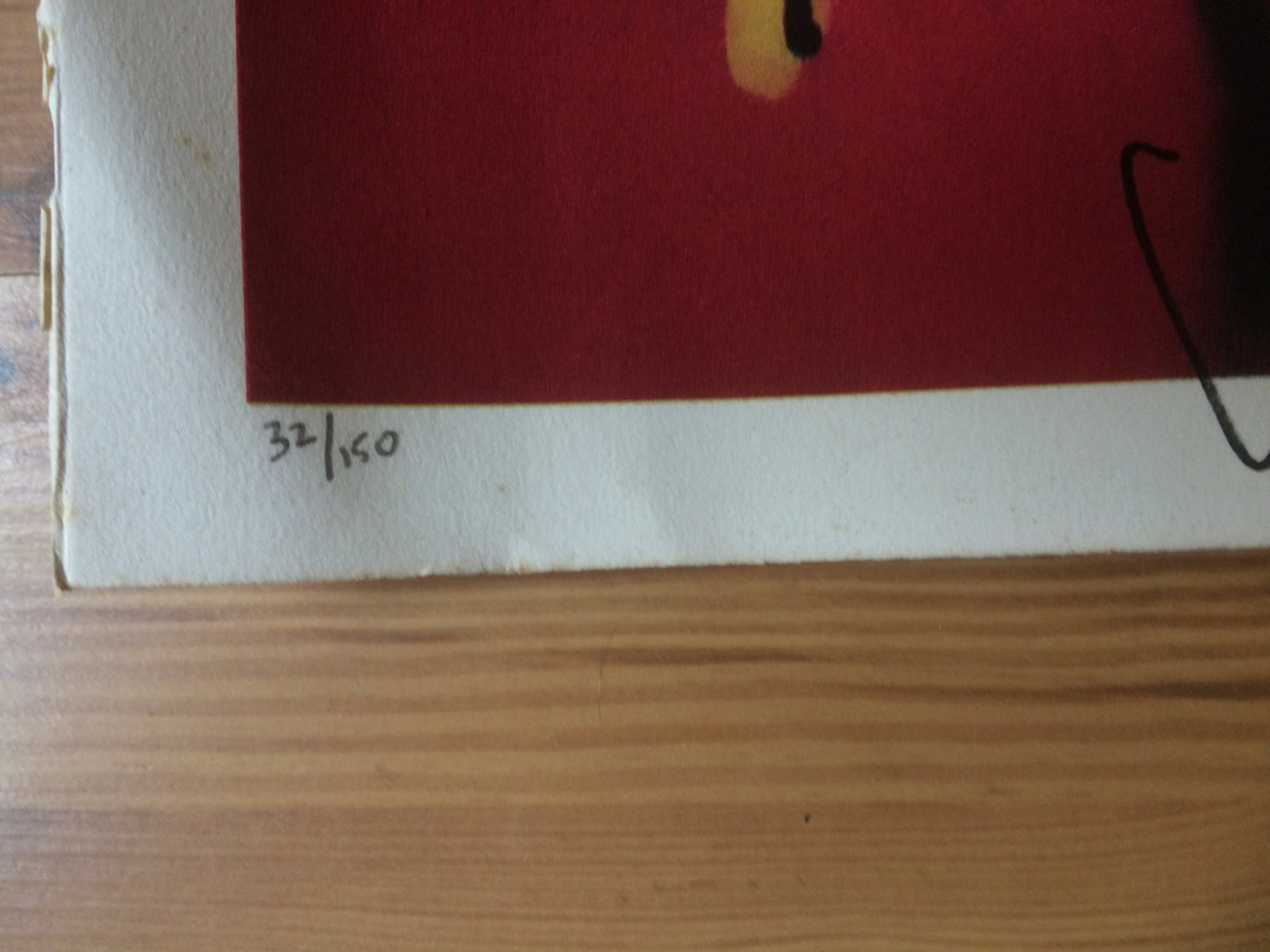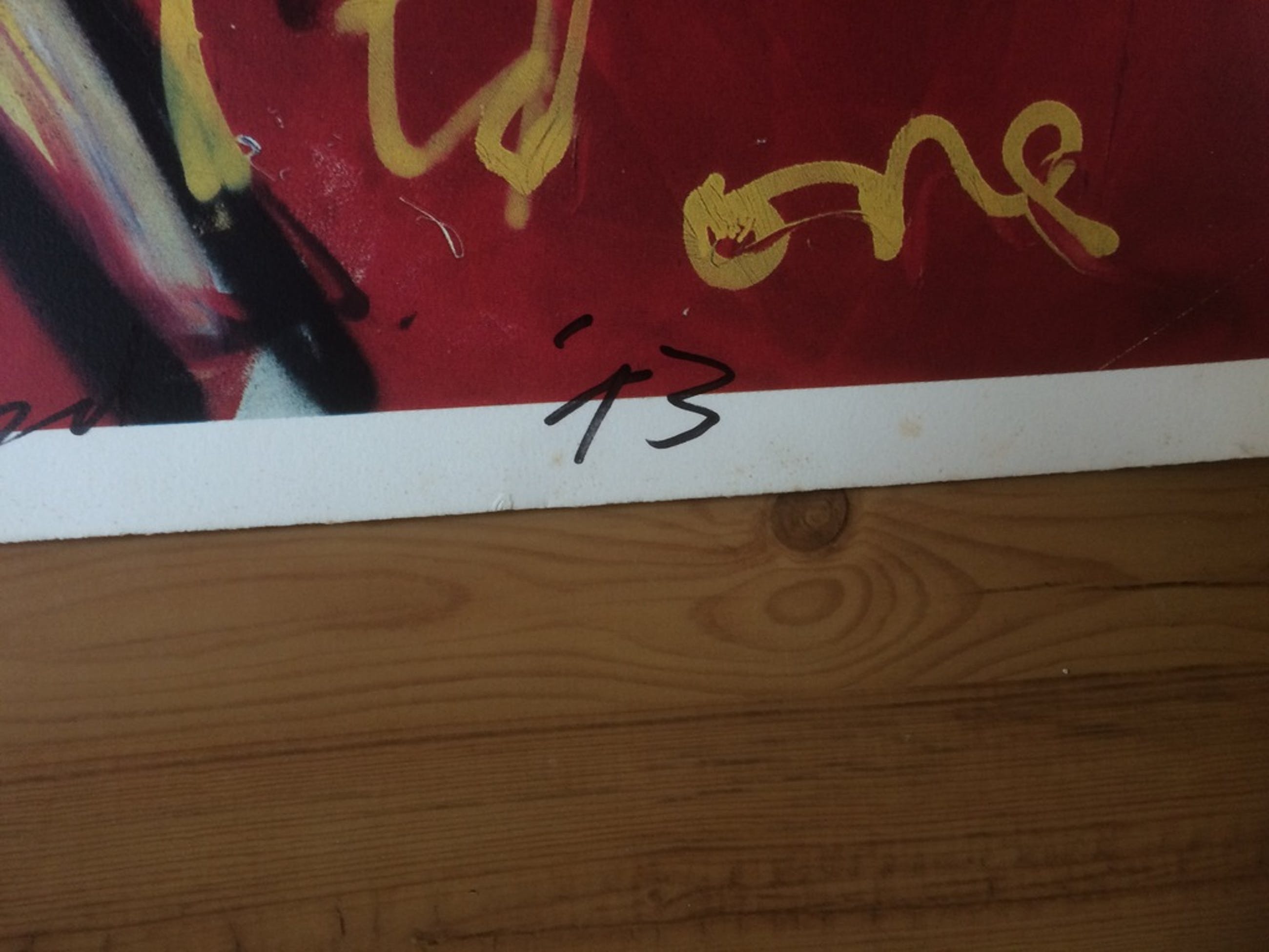 Zeefdruk kent enkele plekjes bovenin op de witte rand (zie foto's). Bij inlijsten niet meer zichtbaar.