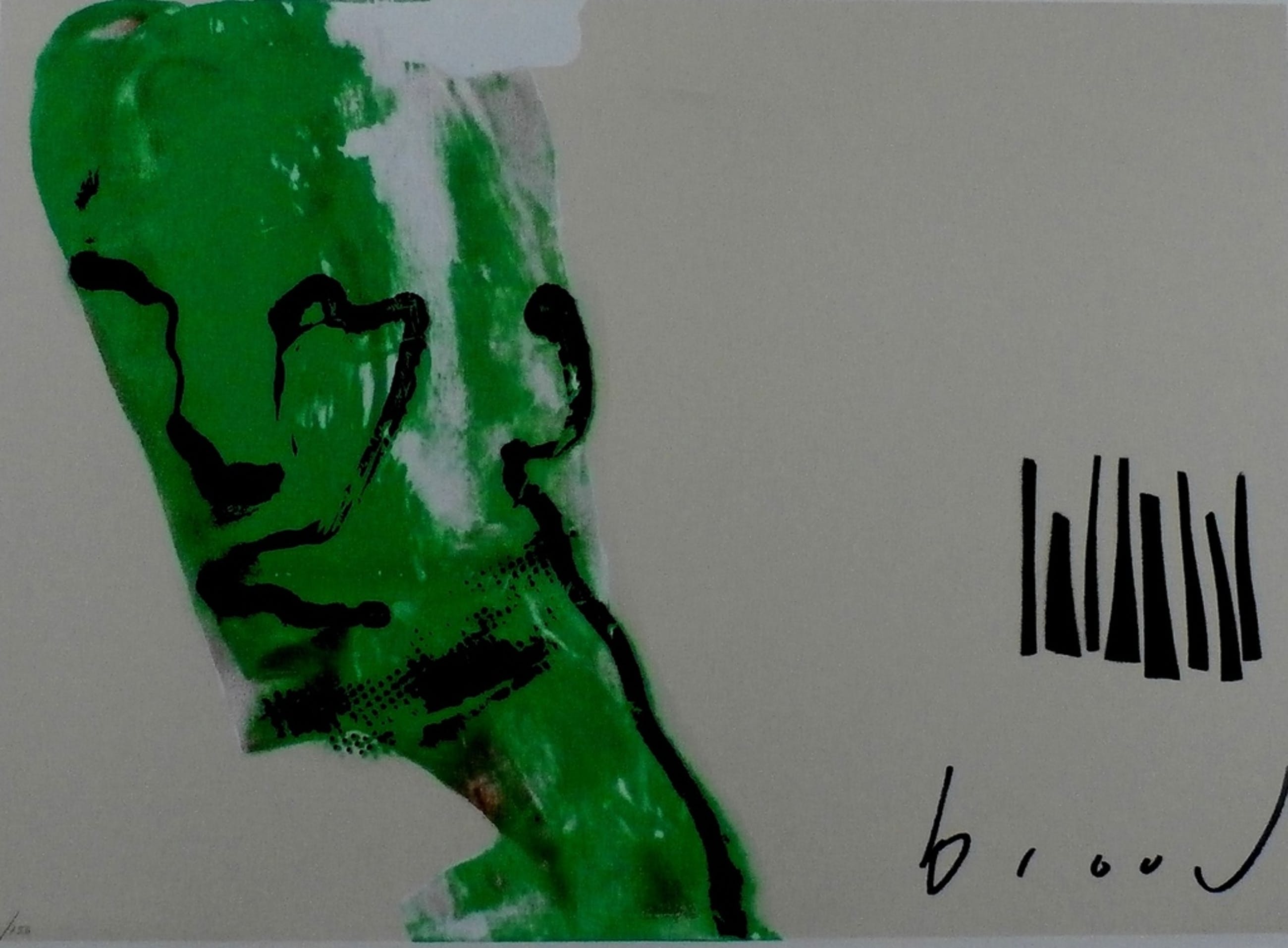 Gesigneerd met dikke zwarte marker. Afmetingen incl. lijst: 70 x 89 cm.