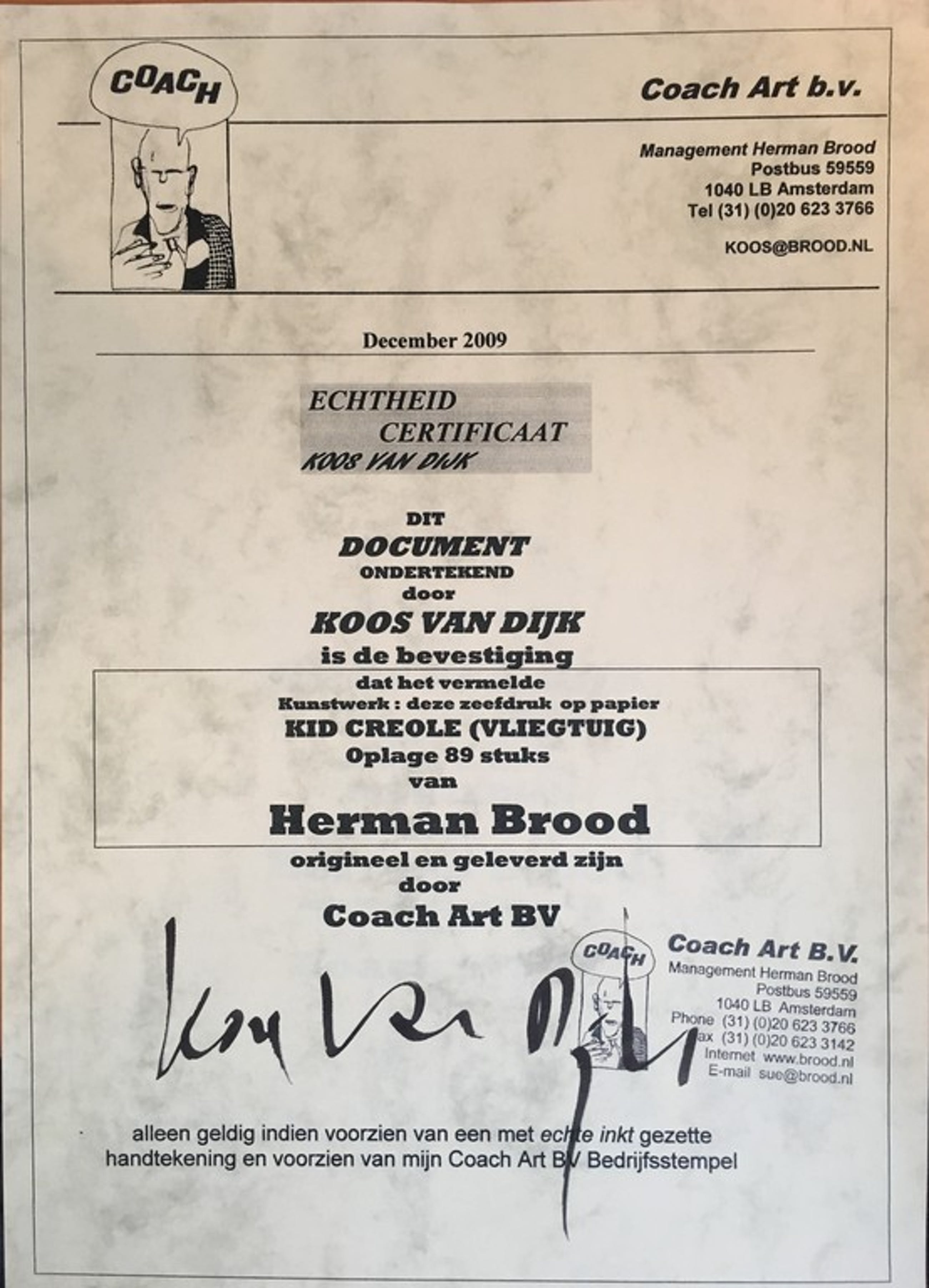 *Certificaat van echtheid van Koos van Dijk (Management Herman Brood) met stempel en handtekening van Koos van Dijk, datum december 2009 met omschrijving zeefdruk informatie over oplage en titel.