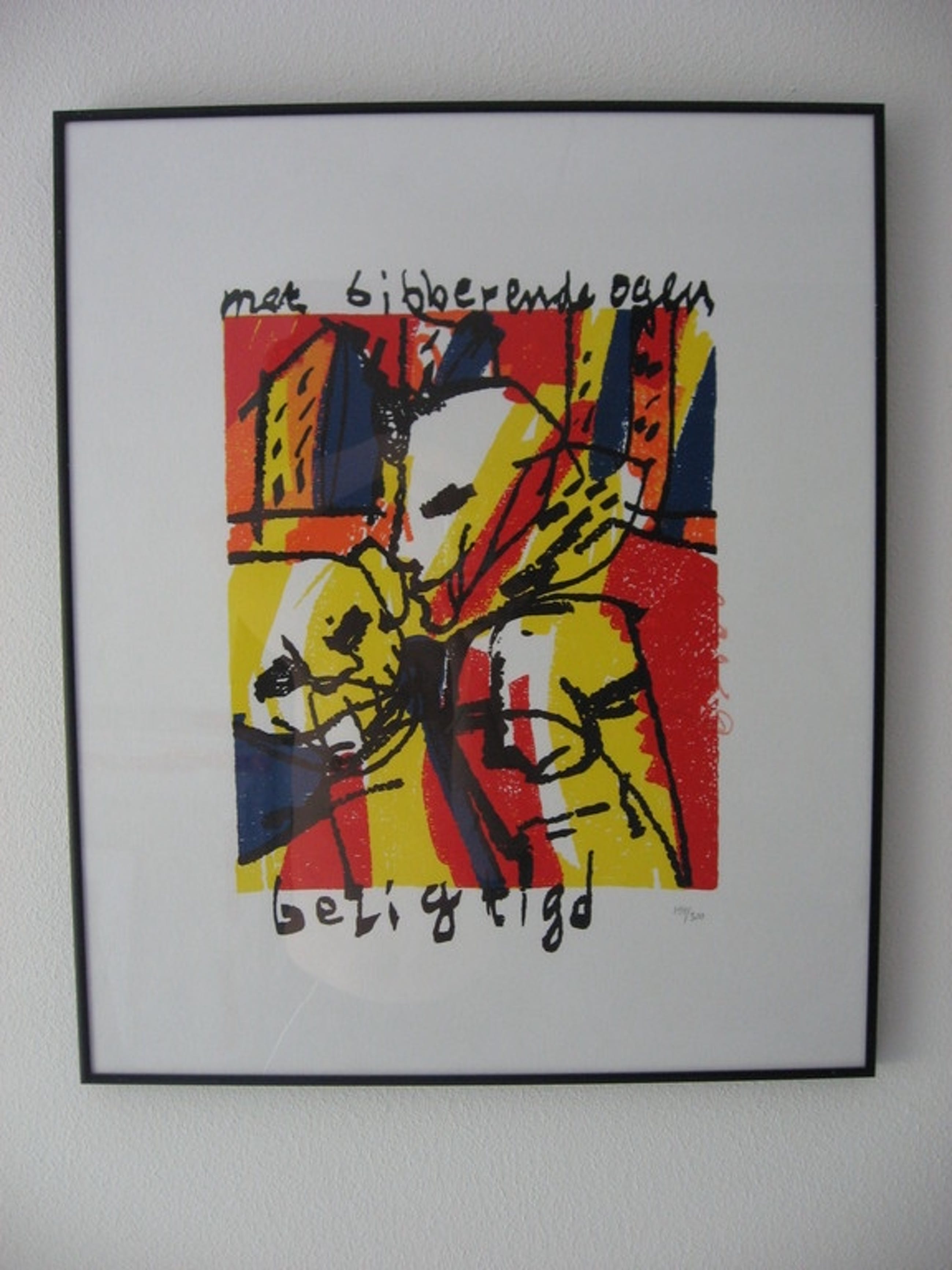 Kleurenzeefdruk van Herman Brood, 'Met bibberende ogen bezigtigd'. Ingelijst in zwarte aluminium lijst.
