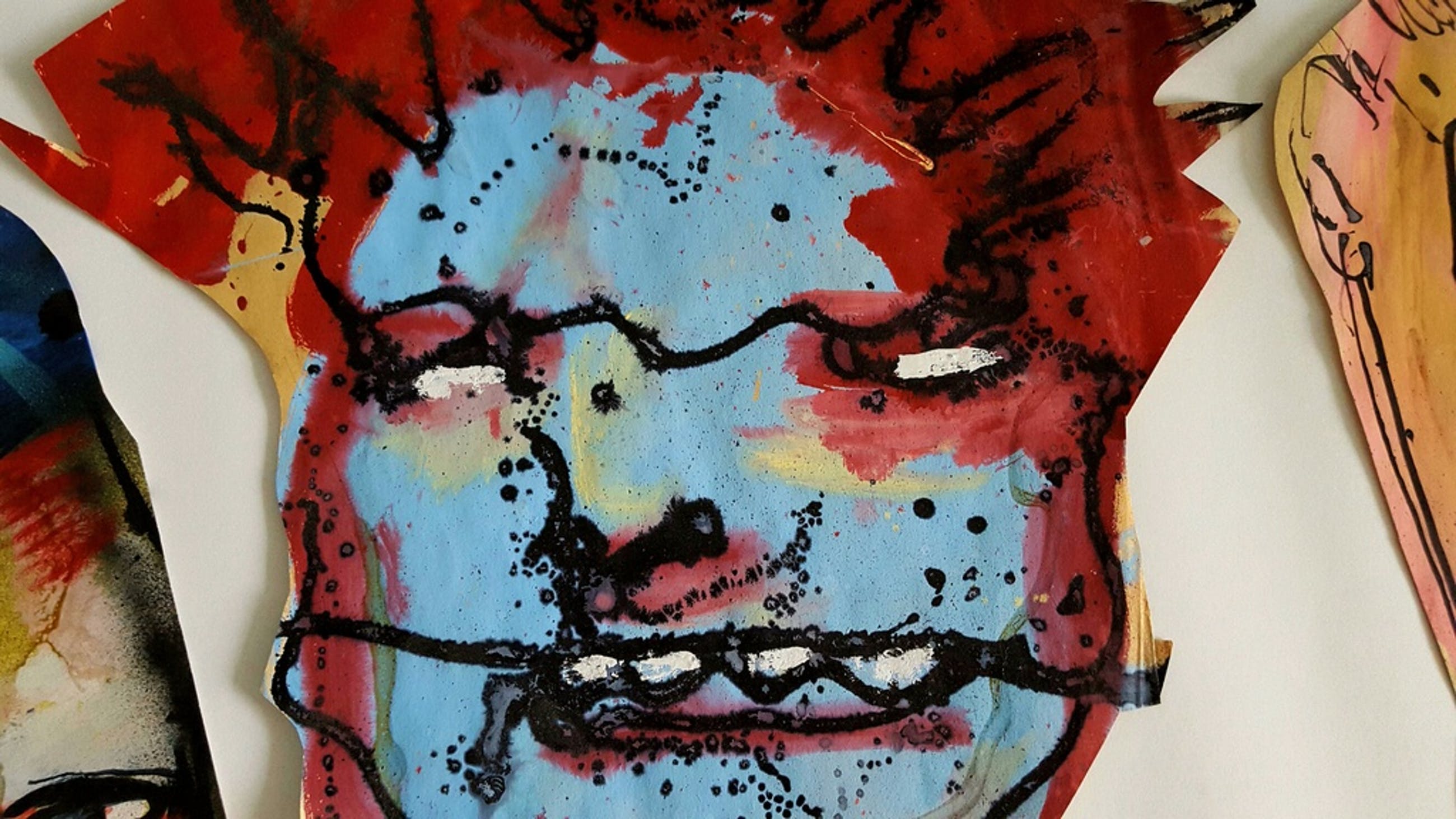 Mixed media (acryl, inkt, spuitbus en echte pleisters) op papier, uniek en typisch oud werk van Herman Brood.