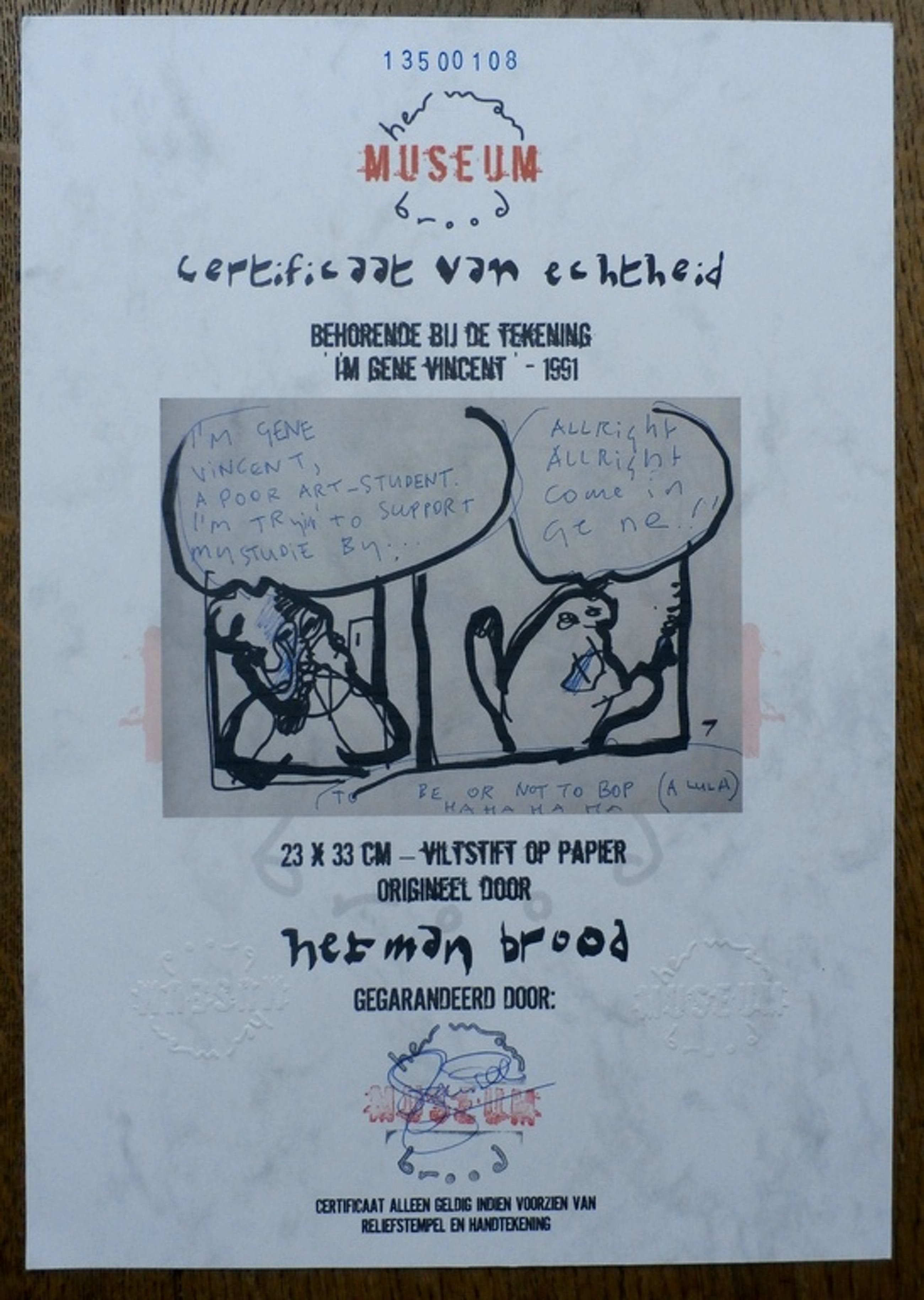 Ongesigneerde Herman Brood tekening: I'm Gene Vincent. Afmetingen: H23 x b33 cm. Het werk wordt geleverd met een certificaat van het Herman Brood Museum.De authenciteit van het werk wordt voor 100% gegarandeerd.