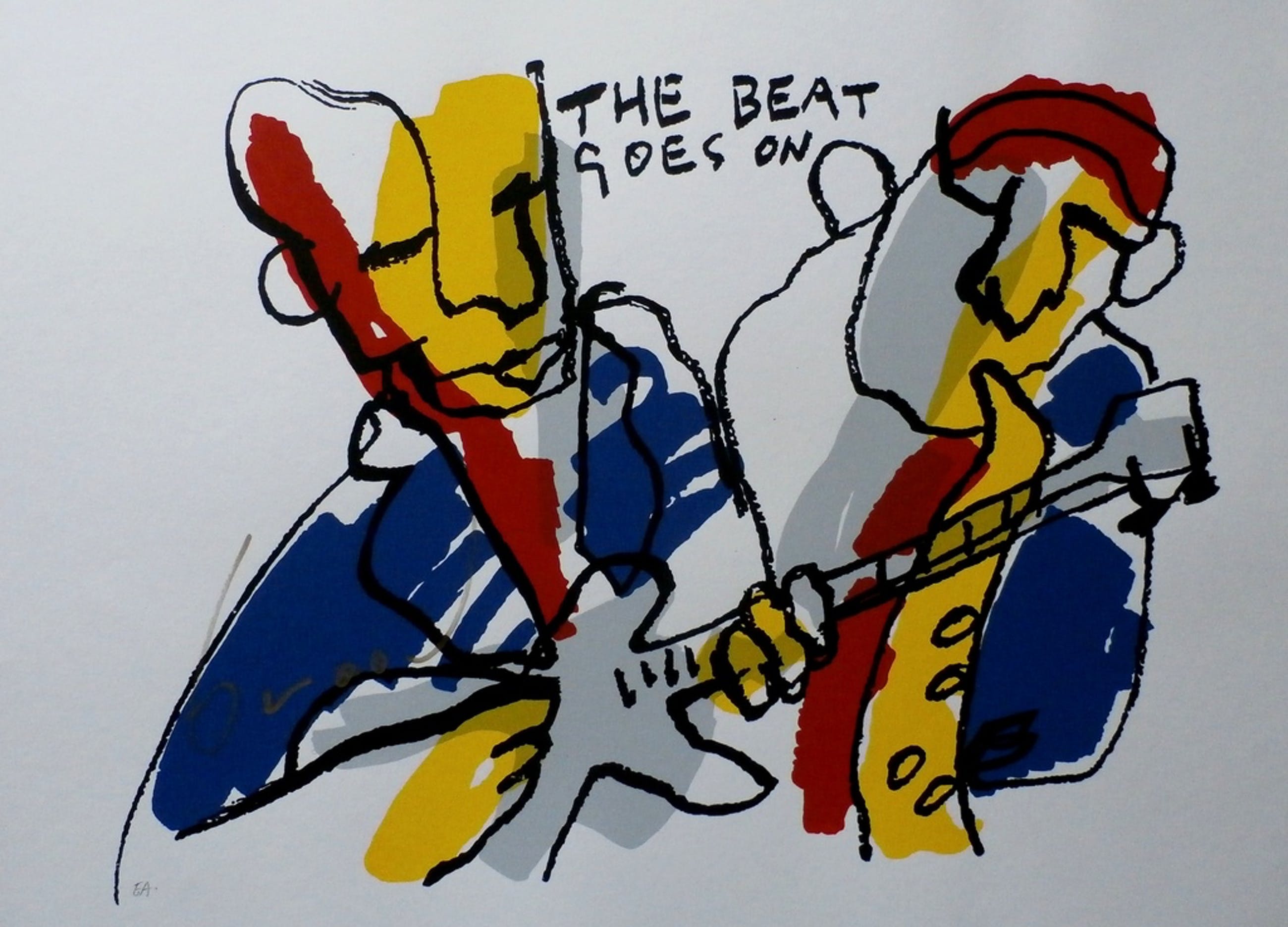 Zeefdruk van Herman Brood. Titel: The beat goes on I. Afmetingen: H60 x b80 cm. Nummer: E.A. Het werk is in het blauwe gedeelte gesigneerd, door de kunstenaar, met zilveren marker.