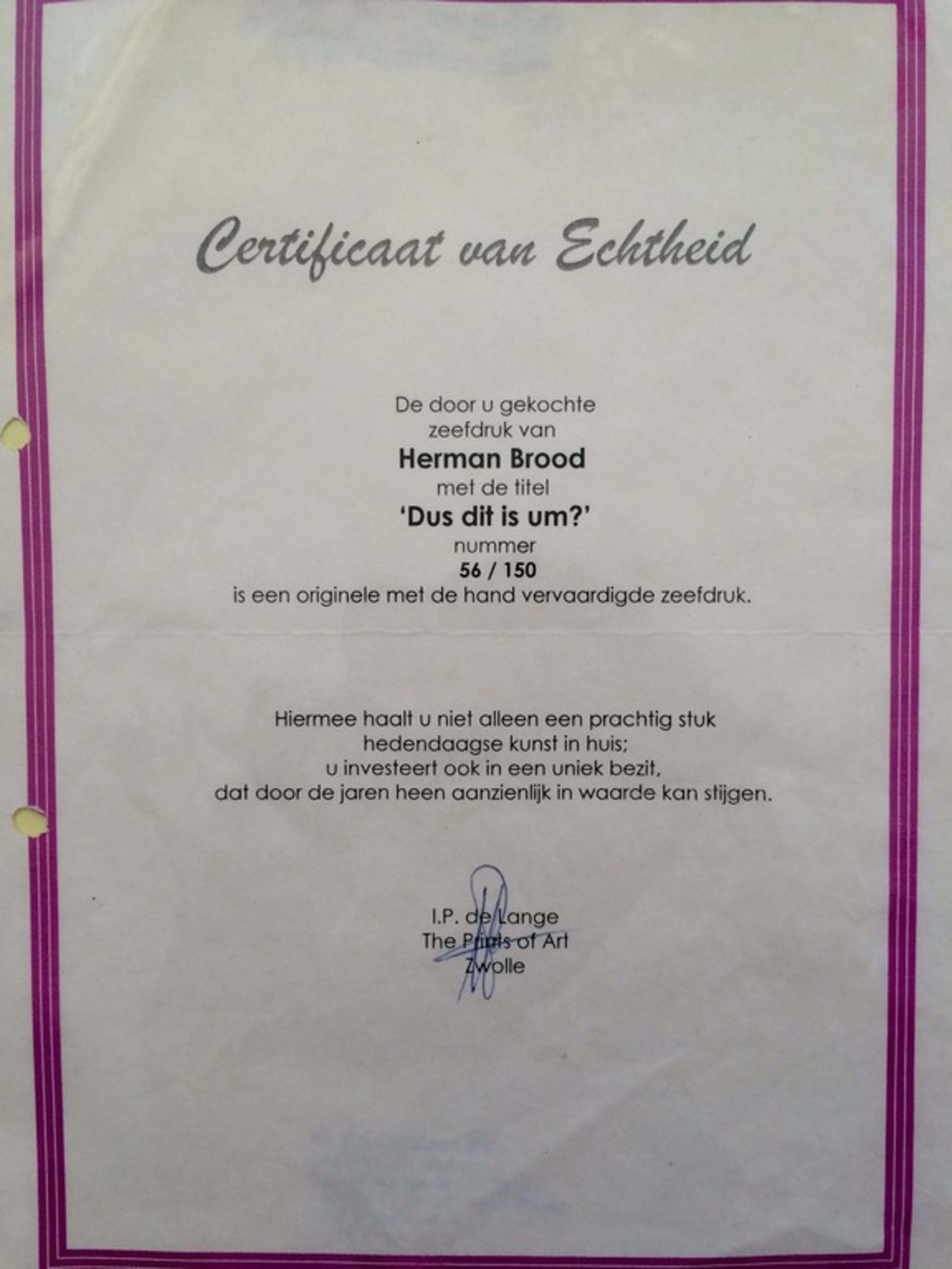 Inclusief certificaat van echtheid van IQ te Zwolle en gratis fles wijn voor bij het Brood.