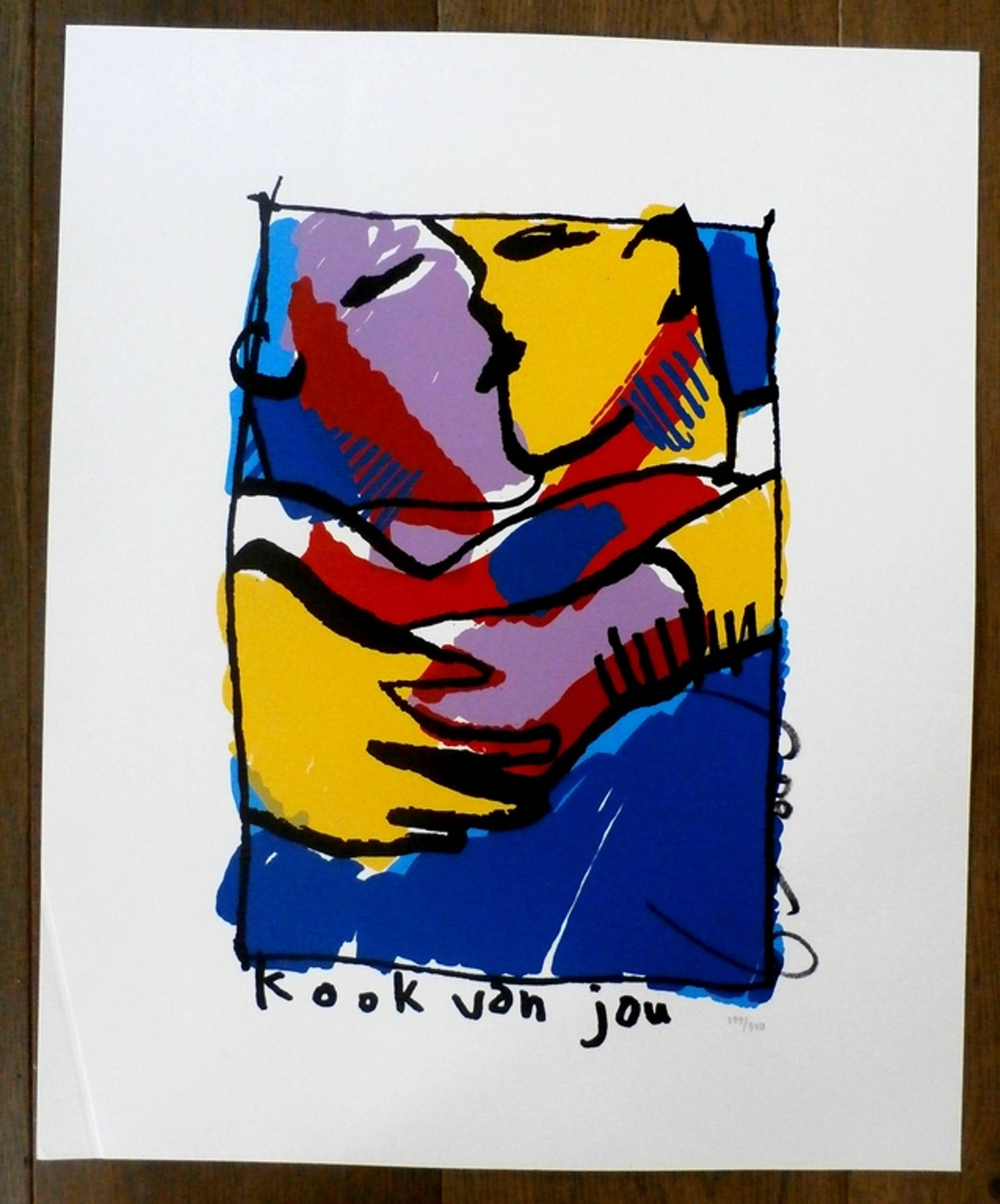 Zeefdruk van Herman Brood. Titel: Kook van jou. Jaar: 2000. Afmetingen: H60 x b50 cm. Nummer: 199/350. Het werk is aan de rechterzijkant gesigneerd, door de kunstenaar, met zwarte marker. Dit is het laatste exemplaar.