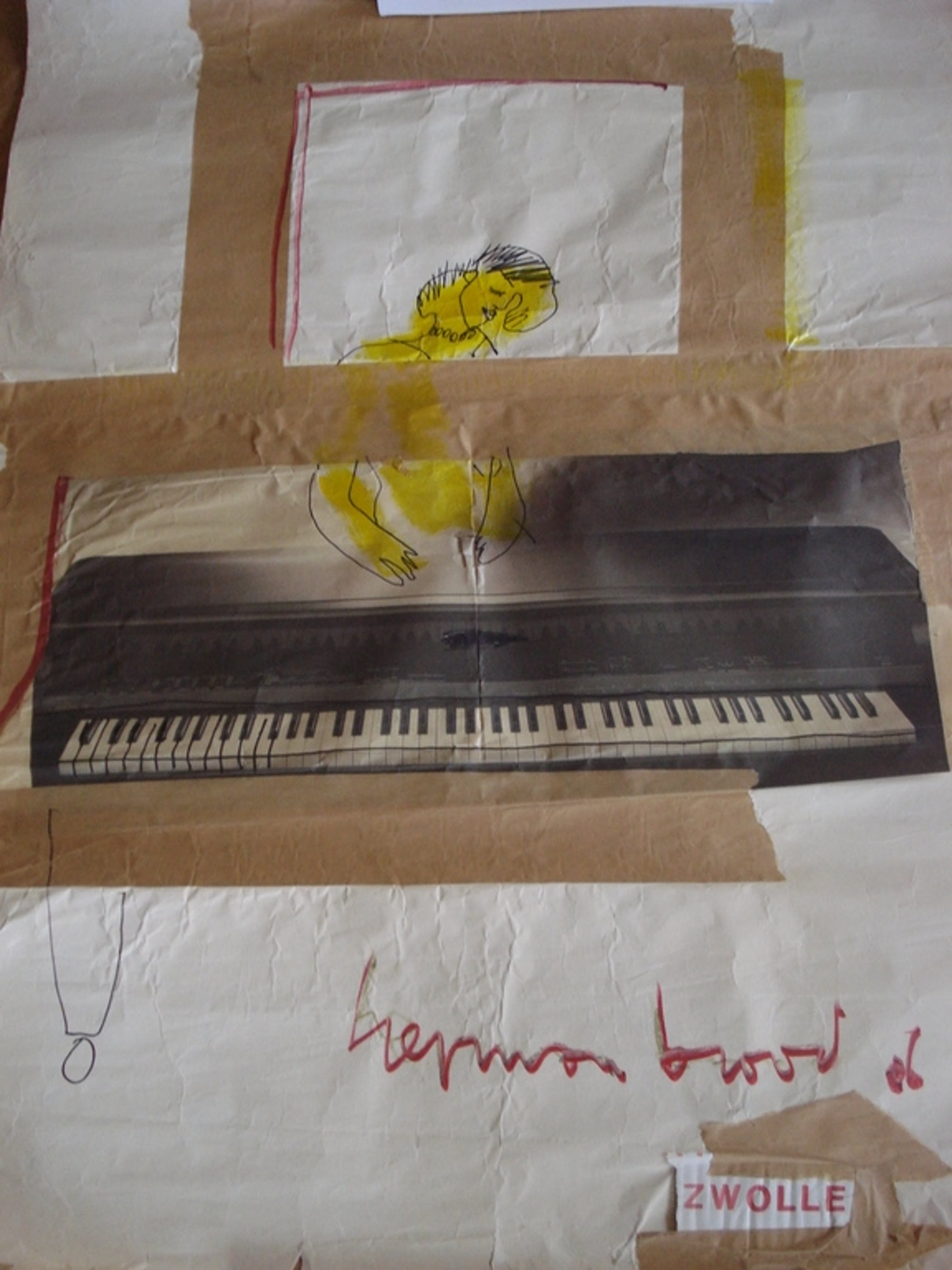 Deze collage heeft de afmetingen circa 90 bij 60 cm en betreft een zelfportet van Herman achter de piano.