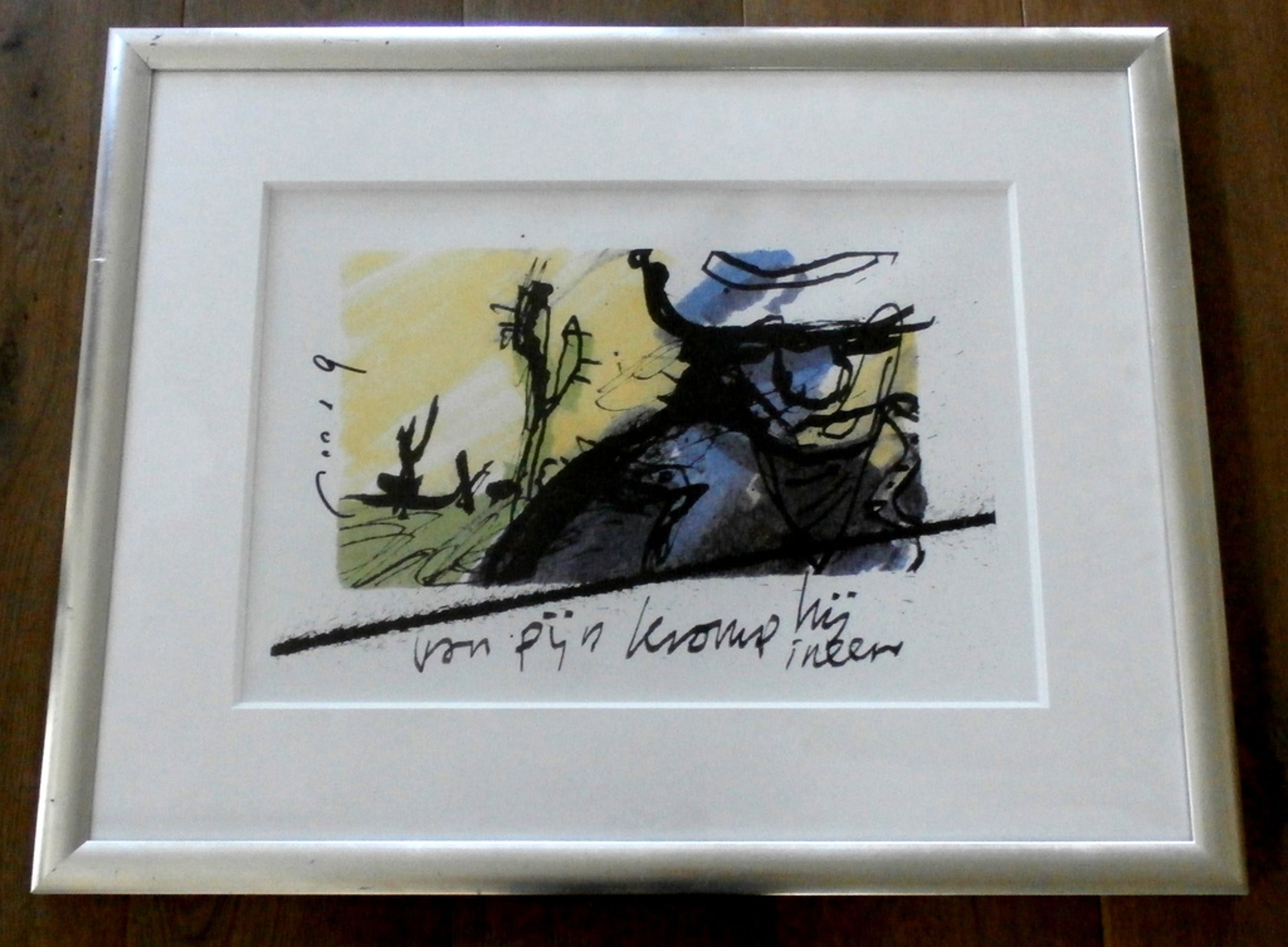 Ingelijste zeefdruk van Herman Brood. Titel: Van pijn kromp hij ineen (Bono - U2). Nummer: E.A.. Afmetingen incl. lijst: H64 x b81 cm. Afmetingen voorstelling: H30 x b42 cm. Het werk is aan de linkerzijkant , met zwarte marker, gesigneerd door de kunstenaar. De zeefdruk is gemaakt naar aanleiding van een bezoek van Bono (zanger U2) aan Herman Brood. Bono wilde een hoes laten ontwerpen door Brood. Tijdens zijn bezoek prikte hij zich aan een cactus die in Herman zijn atelier stond. Dit is de grote versie van de zeefdruk waarop de tekst"van pijn kromp hij ineen wordt vermeld. Dit is niet het geval bij de kleine versie.