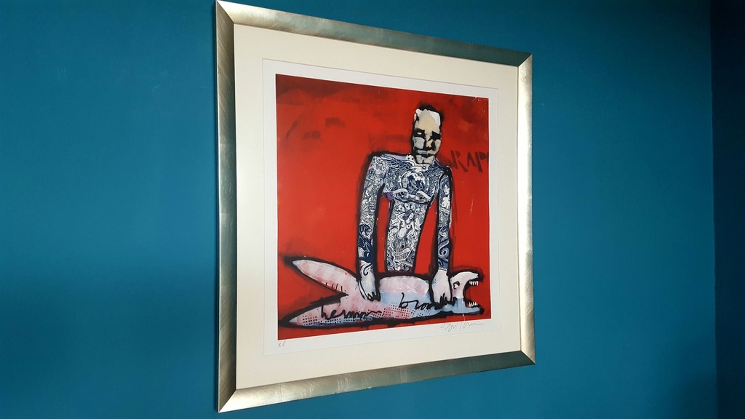 Het betreft een EA exemplaar en de zeefdruk is met de hand gesigneerd door Henk Schiffmacher.