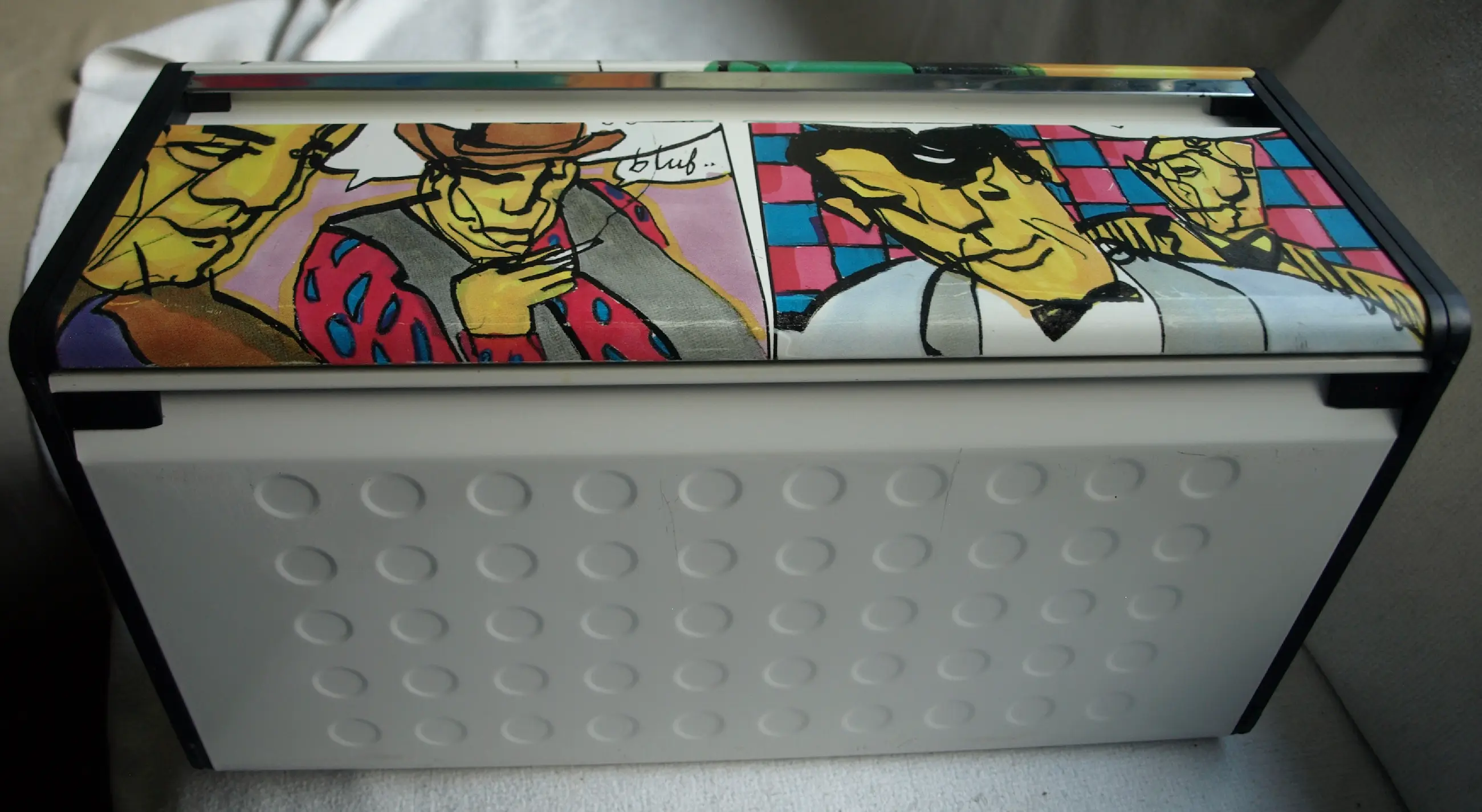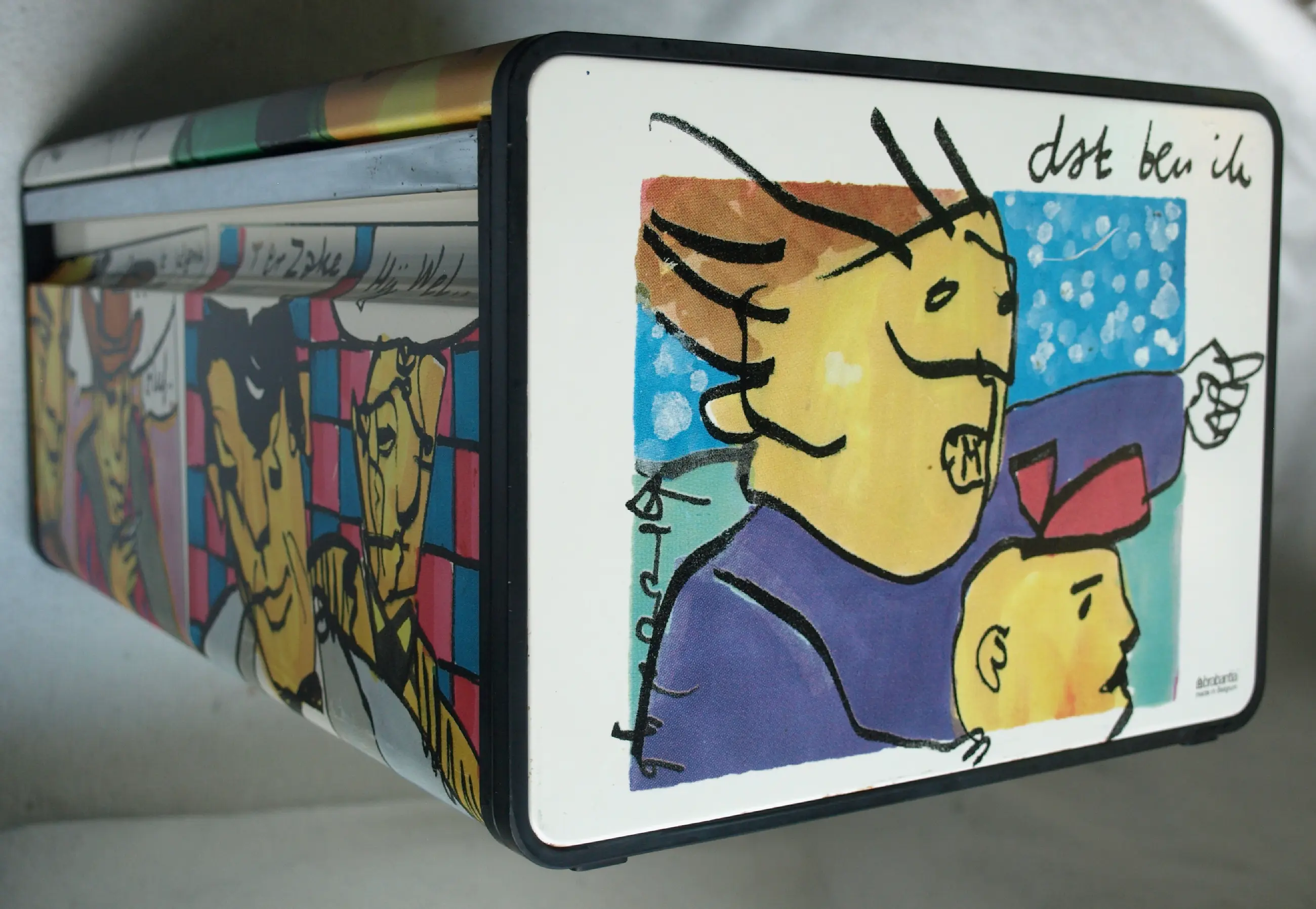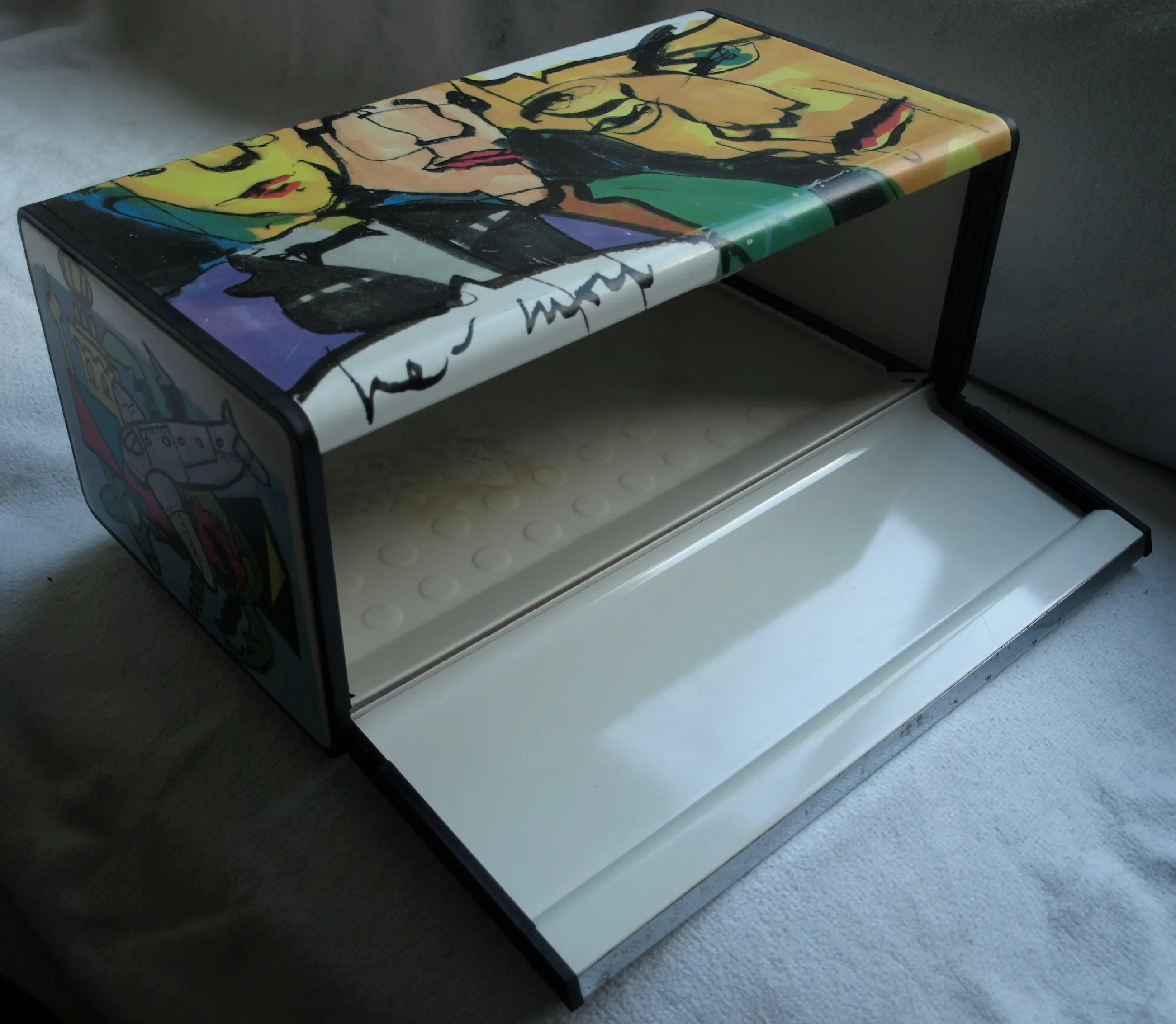 Broodtrommel van het merk Brabantia met mooi gekleurde illustraties van de Nederlandse kunstenaar Herman Brood (1946-2001). -Uitgegeven door de firma Brabantia, België in 1992. -De broodtrommel kan neergezet worden, of aan de wand bevestigd worden. -Drukgesigneerd op de zijkant. -Afmetingen: 18½ x 46 x 25 cm (hoogte x breedte x diepte). -Gewicht: 1836 gram. -Conditie: In goede, gebruikte staat met slijtplekjes en wat vlekken op de bodem (zie de 12e foto). Zie ook alle foto’s voor een eigen indruk.
